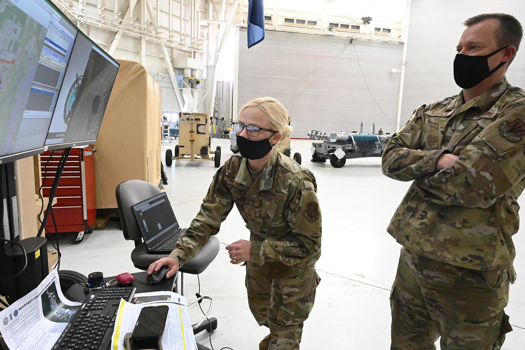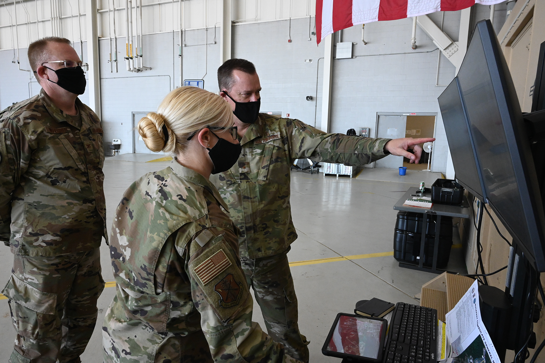 Senior Master Sgt. Danielle Card demonstrates computer simulation capabilities for Col. Jon Wahlgren, left, and Brig. Gen. Robert Schulte, the N.D. National Guard chief of staff for Air, during a distinguished visitor day at exercise Southern Strike at the Gulfport Combat Readiness Training Center, Gulfport, Mississippi, April 22, 2021.