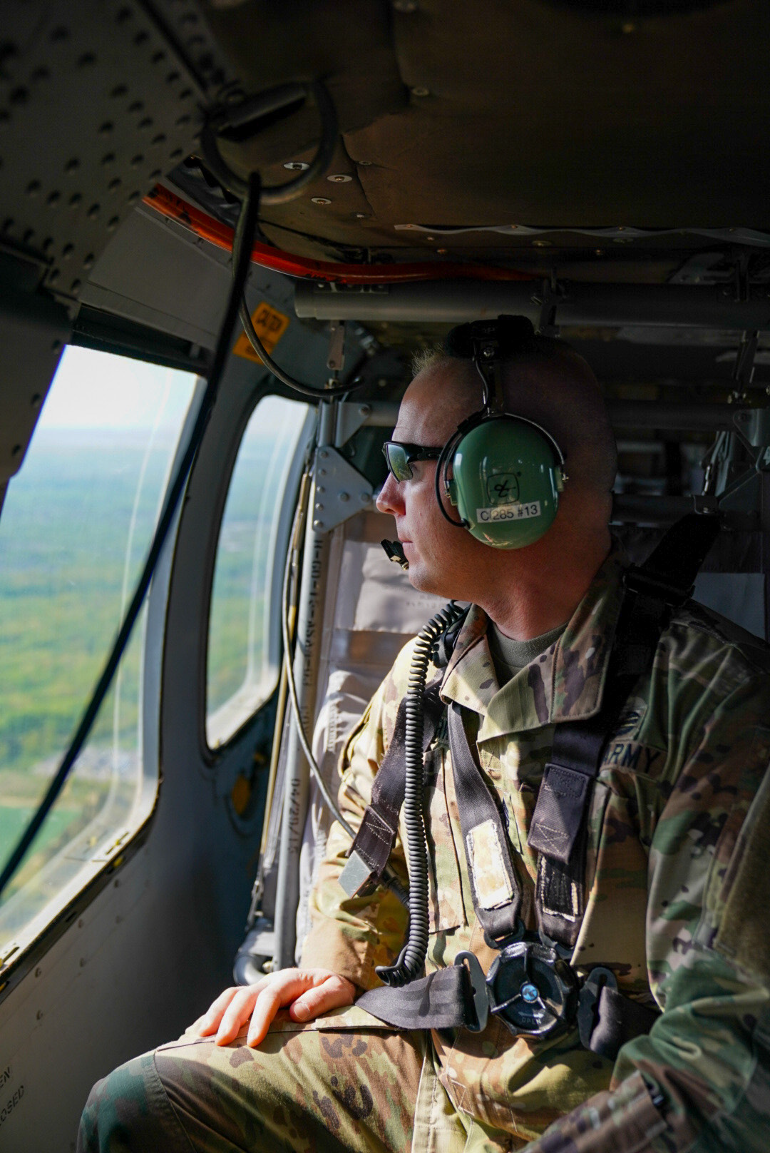 Command Sgt. Maj. Nick Clark, command sergeant major, 1st Battalion, 112th Aviation Regiment, views historic landmarks in the National Capital Region from a UH-60 Black Hawk helicopter, April 27, 2021. Clark was visiting Soldiers of Company C, 2nd Battalion, 285th Aviation Regiment, who have been deployed to the NCR since November 2020.