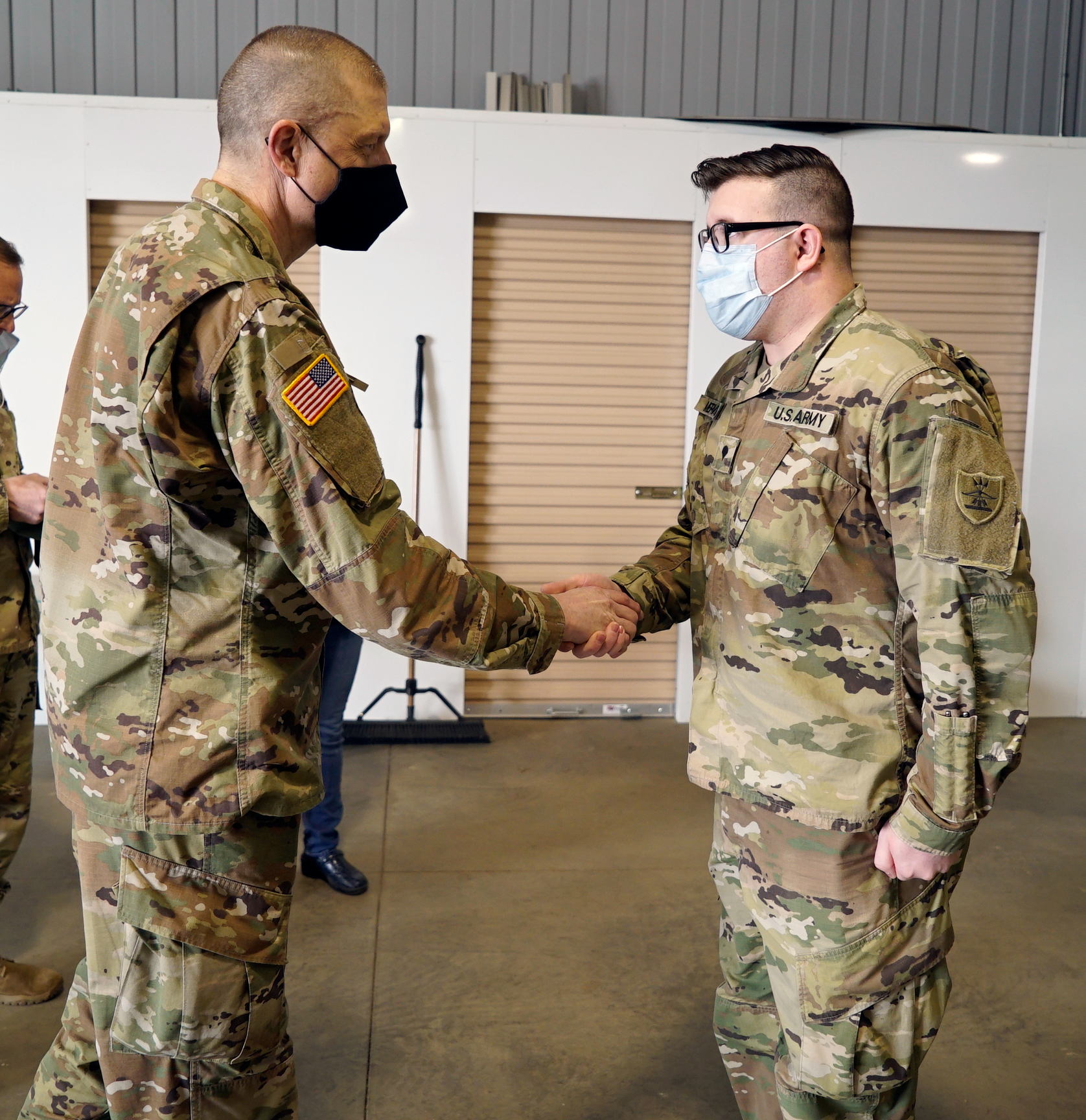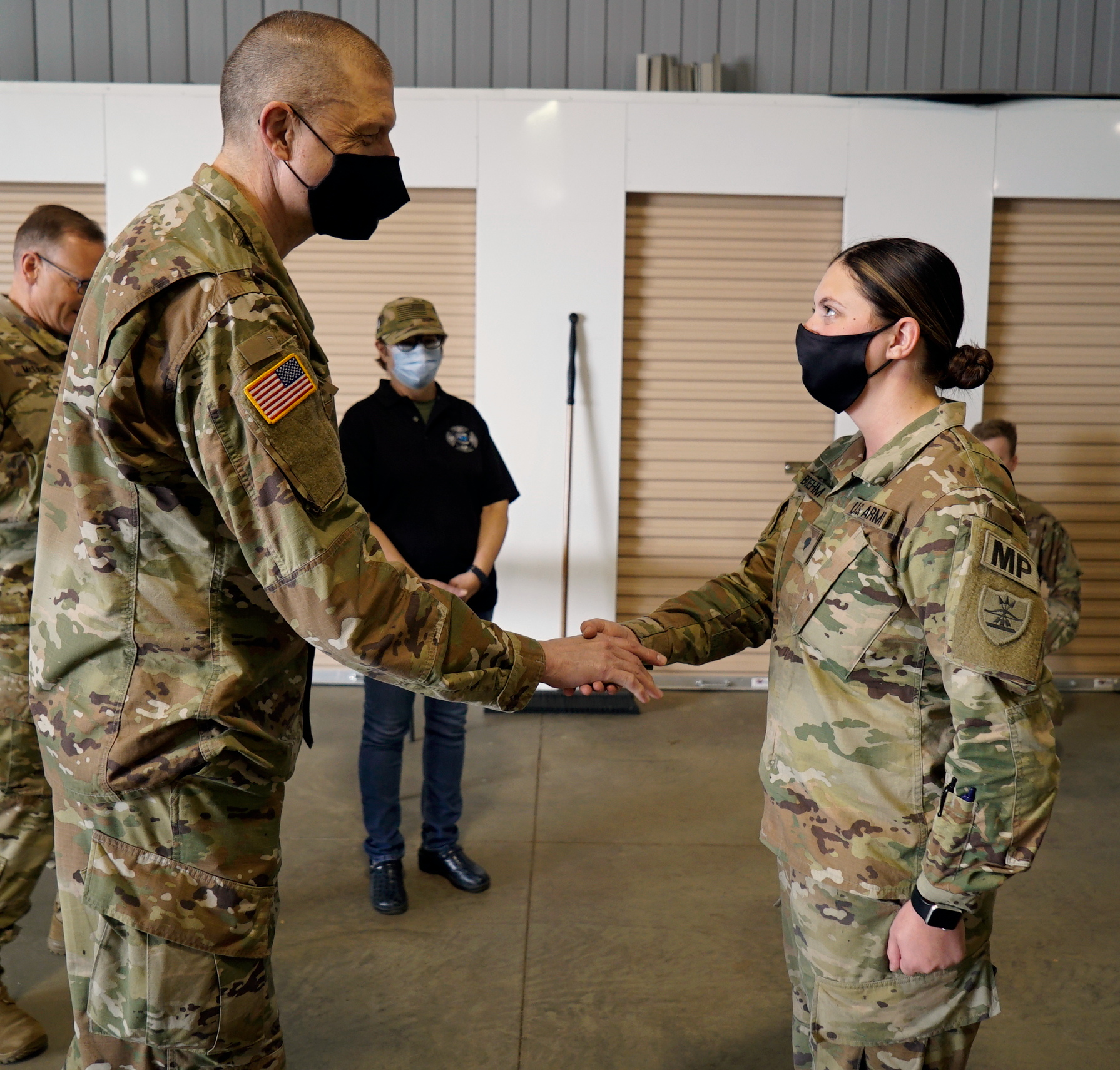 Maj. Gen. Al Dohrmann and Command Sgt. Maj. Derek Heck meet with Guard members on COVID-19 response duty in Dickinson on April 28, 2021.