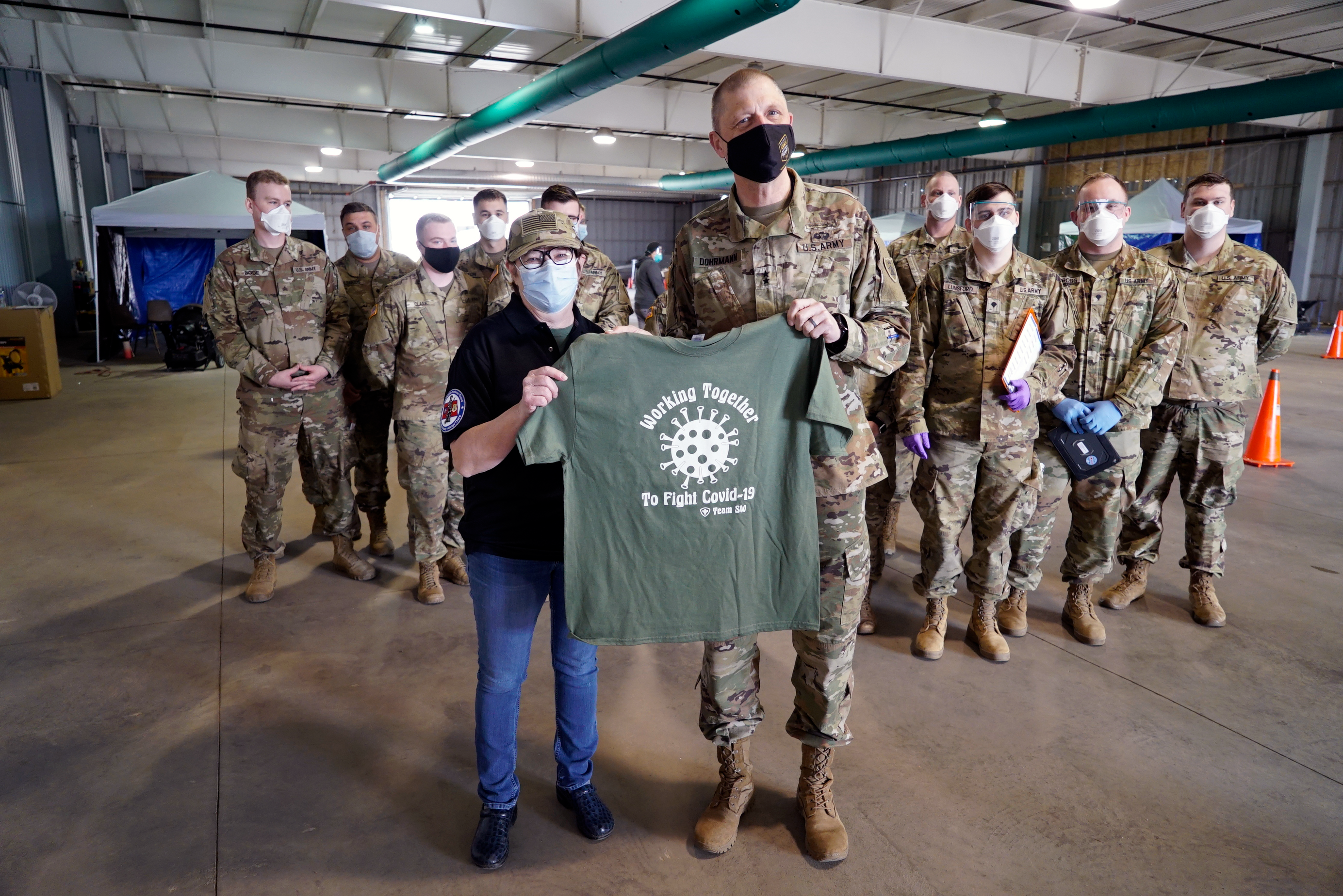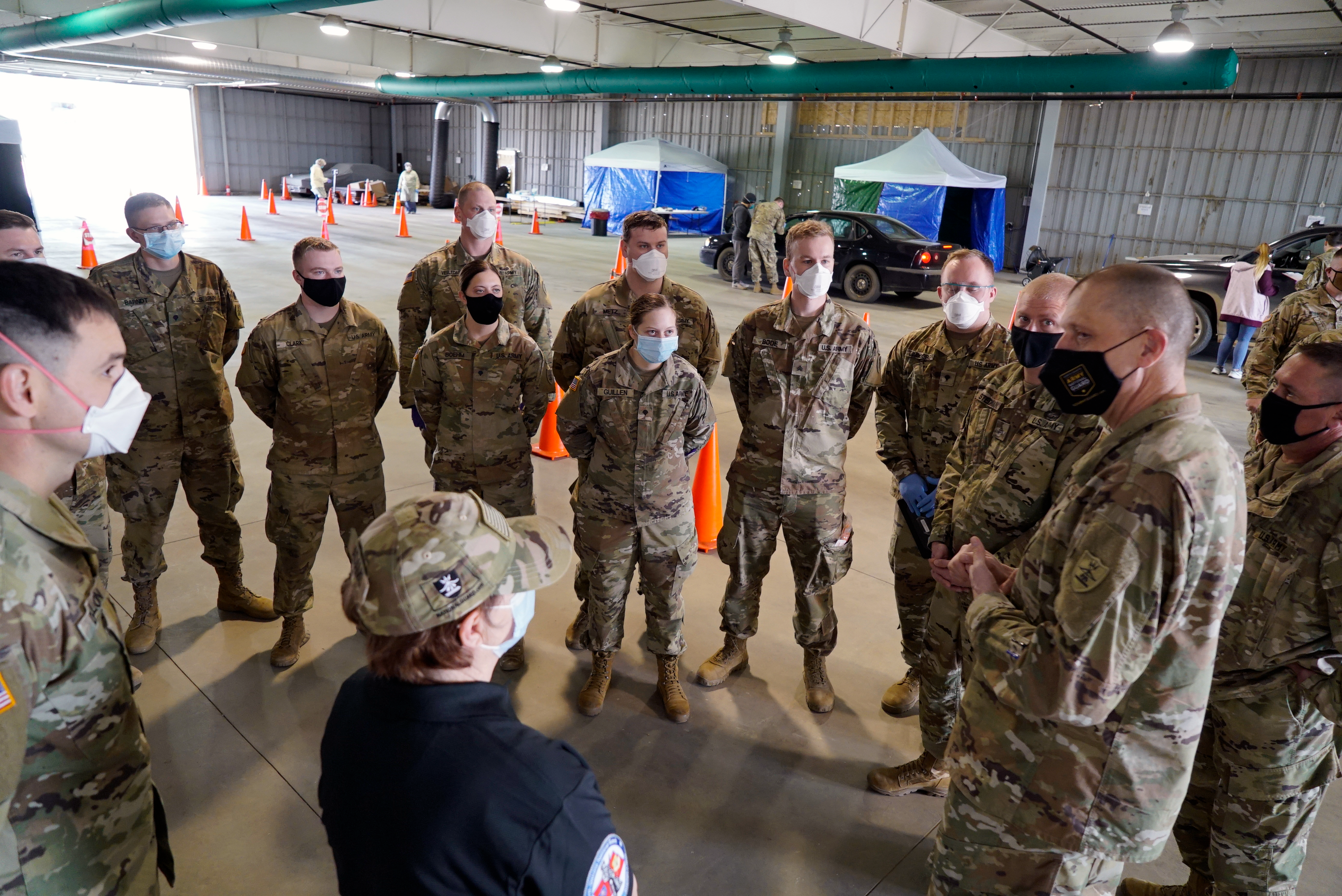 Maj. Gen. Al Dohrmann, adjutant general, and the N.D. Army National Guard state command sergeant major, Command Sgt. Maj. Derek Heck, traveled to Dickinson to meet with N.D. National Guard members engaged in the COVID-19 response efforts, April 28, 2021. (National Guard story and photos by Sgt. 1st Class Charles Highland, N.D. National Guard Public Affairs)