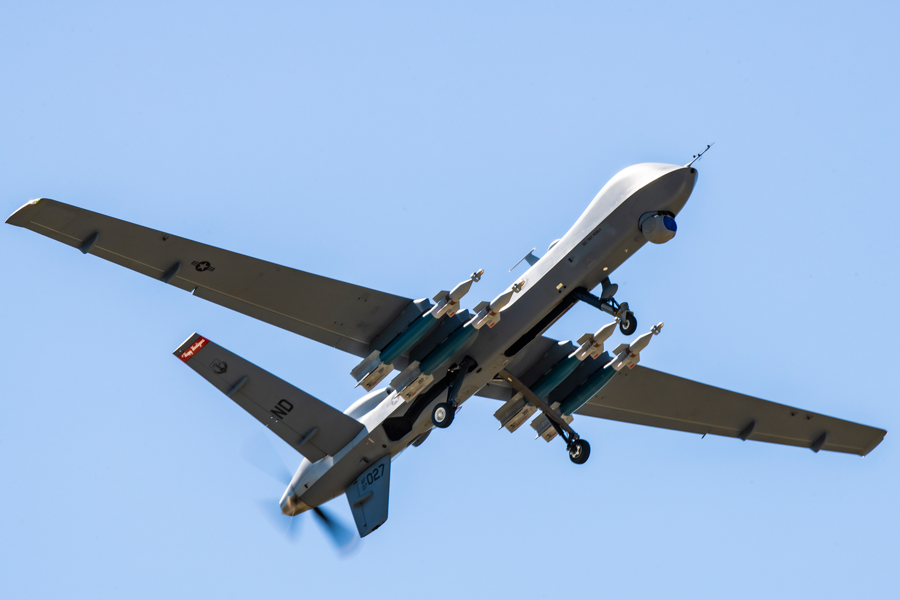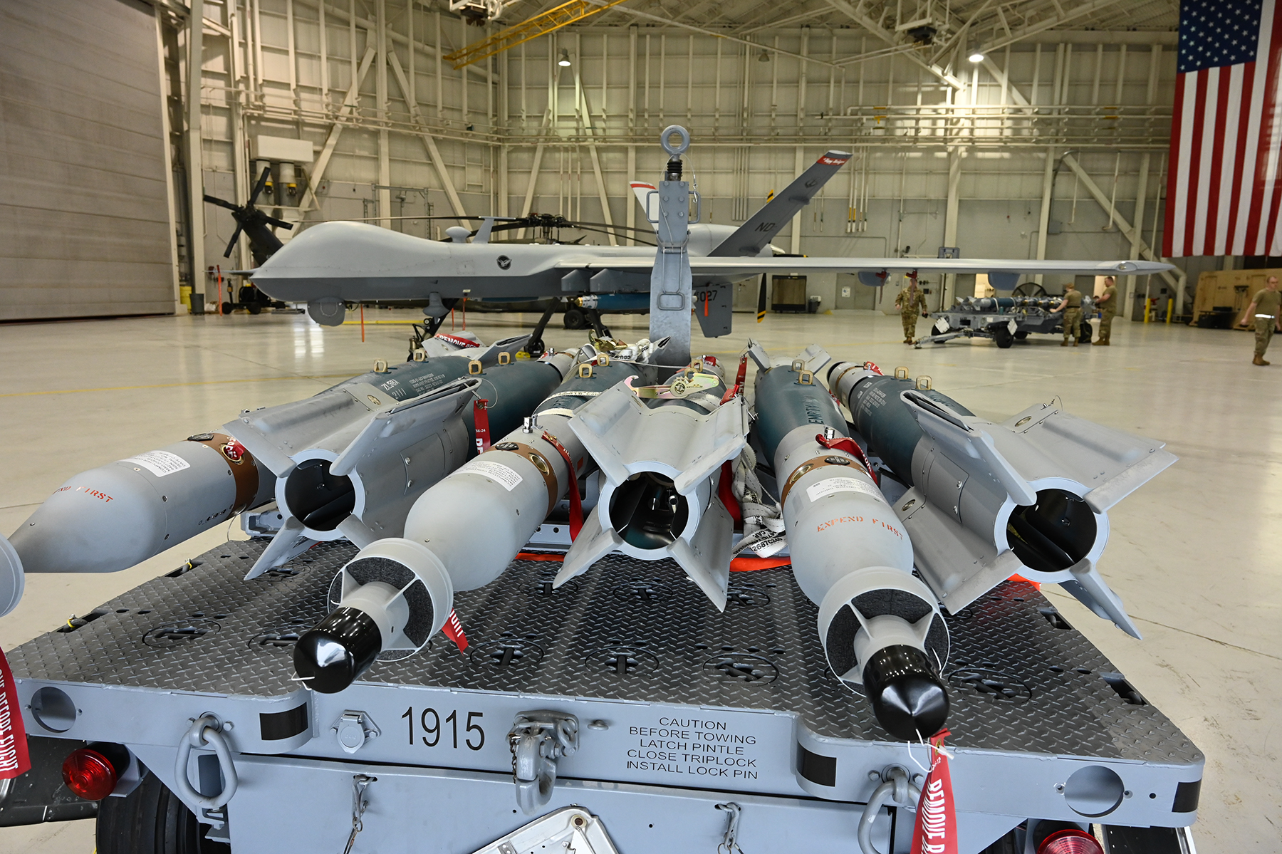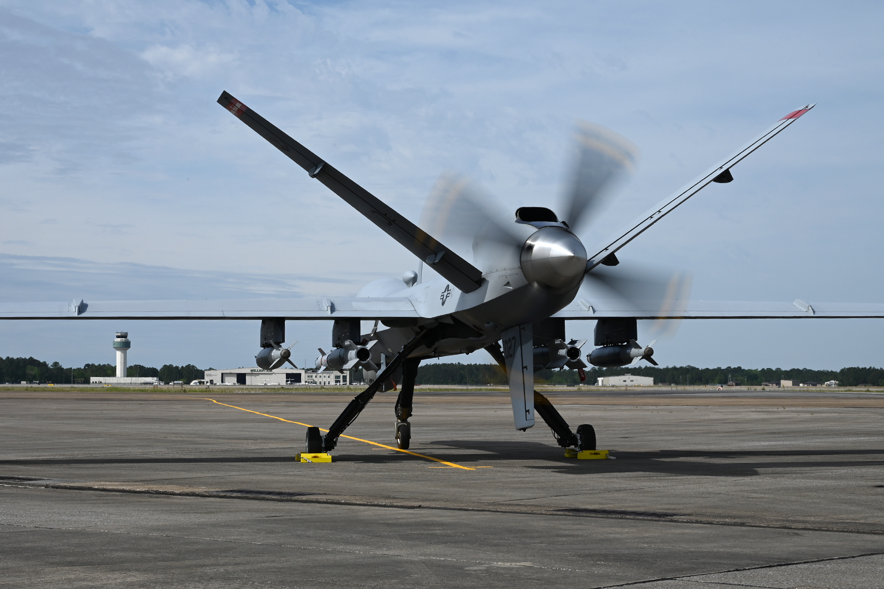 A N.D. Air National Guard MQ-9 aircraft is loaded with inert GBU-12 and GBU-38 munitions as it prepares to launch en route to the Camp Shelby, Mississippi, Air-to-Ground range during Exercise Southern Strike at the Gulfport Combat Readiness Training Center, Gulfport, Mississippi, April 22, 2021.