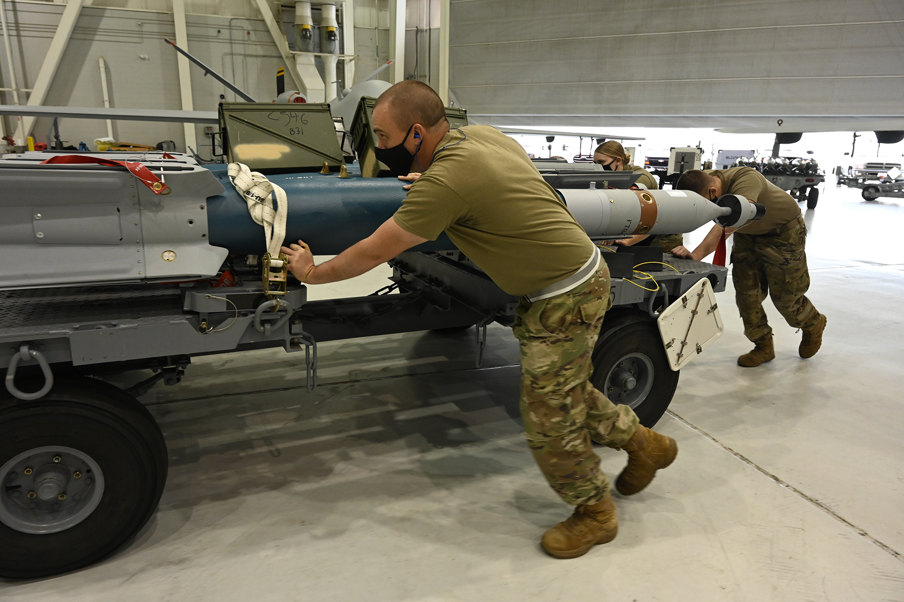 Senior Master Sgt. Carter Norrie, the 119th Wing weapons safety manager, helps push a trailer with inert GBU-12 munitions during Exercise Southern Strike at the Gulfport Combat Readiness Training Center, Gulfport, Mississippi, April 22, 2021.