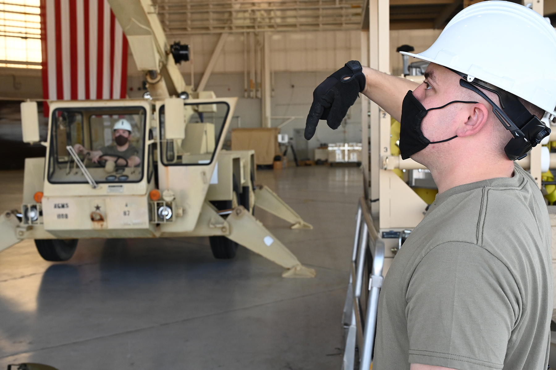 Tech. Sgt. Colter Pratt directs Senior Airman Christopher Heinrich as he operates a crane to position equipment during Exercise Southern Strike at the Gulfport Combat Readiness Training Center, Gulfport, Mississippi, April 22, 2021.