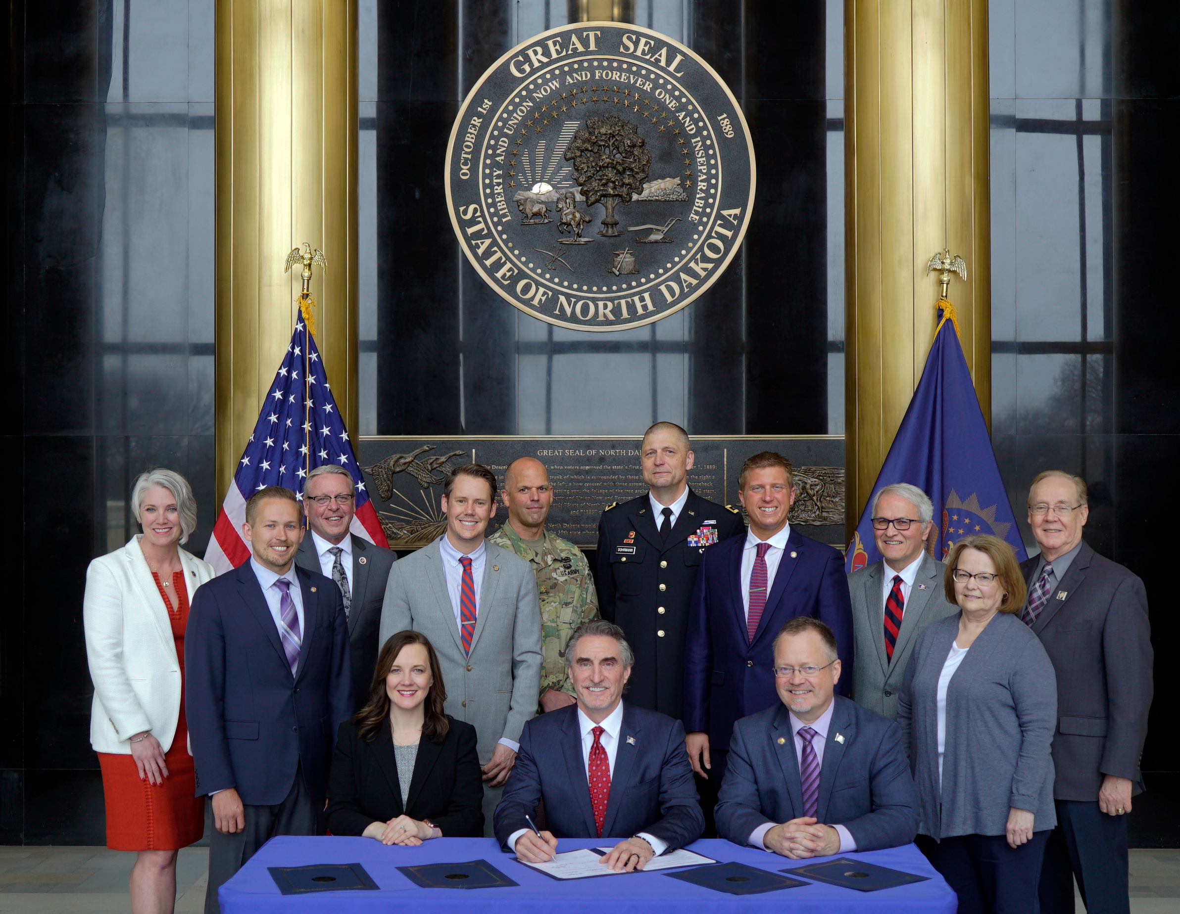 Gov. Doug Burgum, Lt. Gov. Brent Sanford, Maj. Gen. Al Dohrmann, N.D. adjutant general, and other elected officials gathered at Memorial Hall at the N.D. capitol for a joint bill-signing event, April 26, 2021. The bills featured in this signing highlighted efforts of North Dakota's 67th Legislative Assembly in support of military members, their dependents, and Veterans.