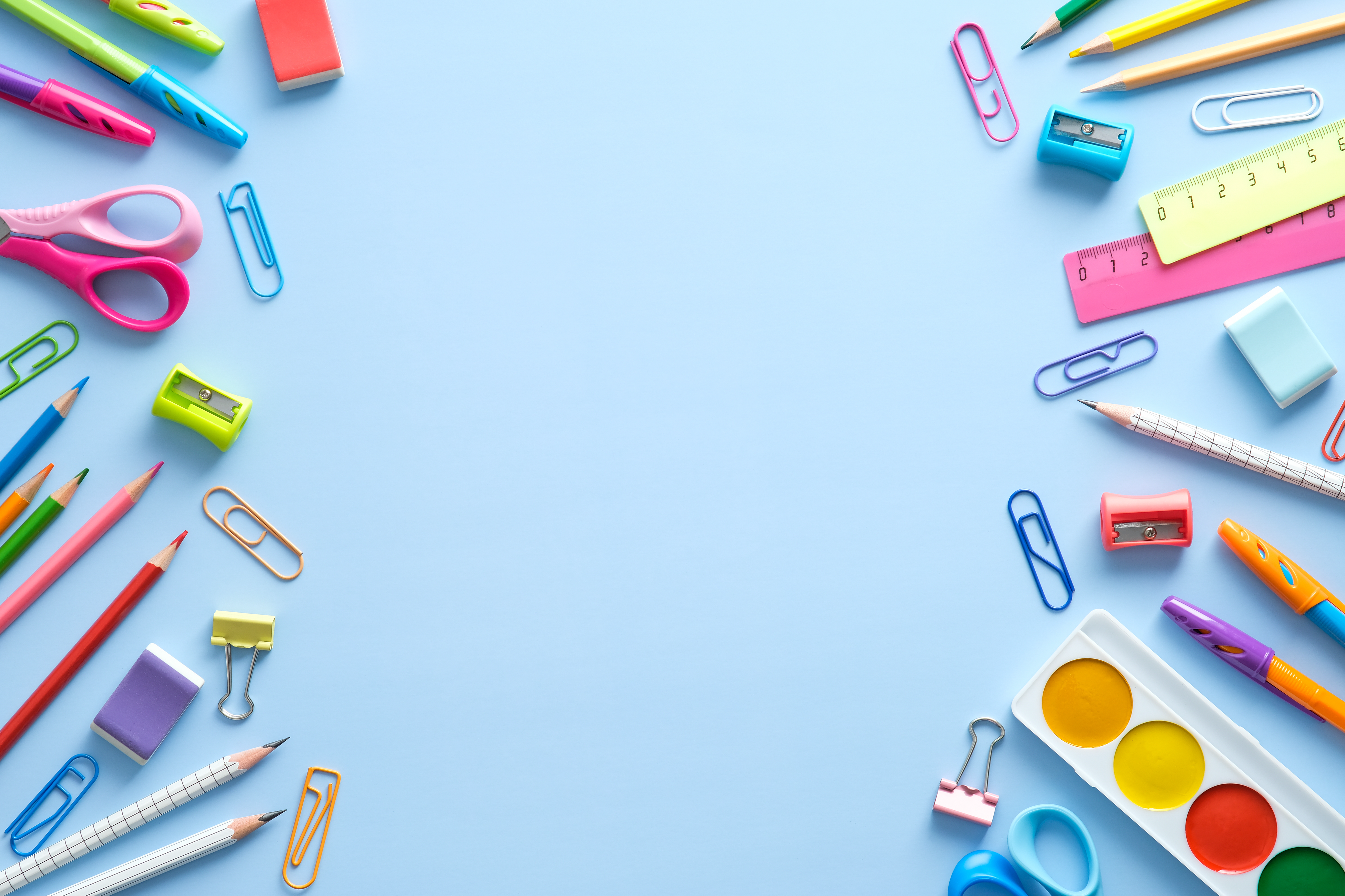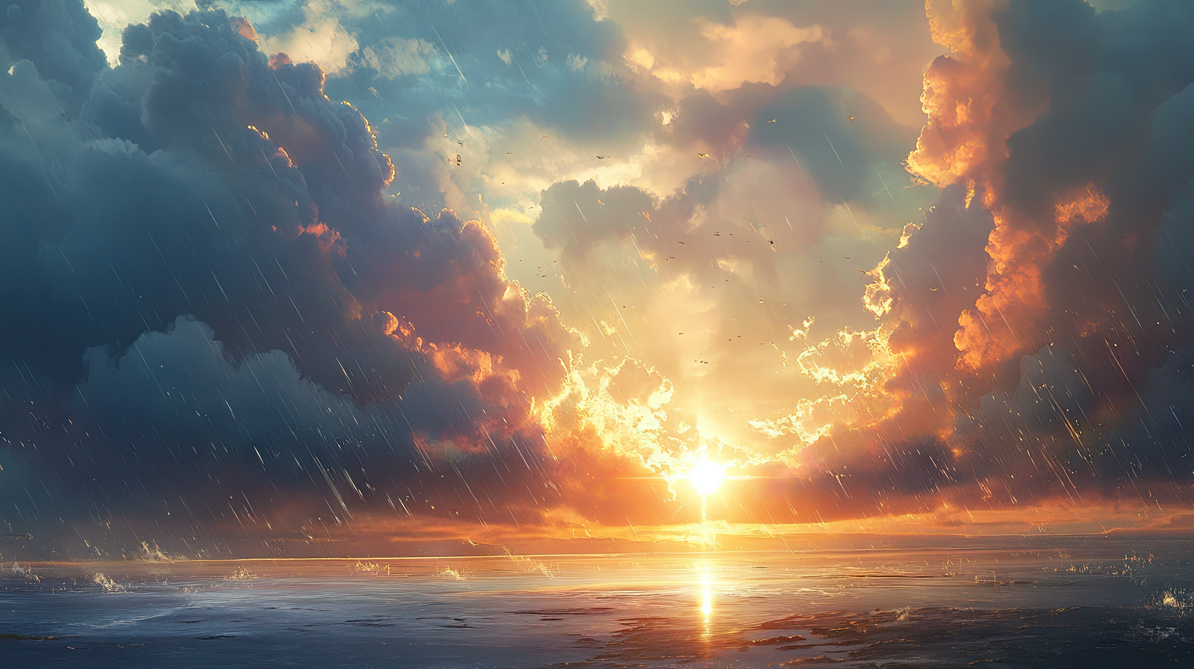 Created with images by Darya - "Dramatic Sunrise with Radiant Sunbeams Over the Ocean" • arthit - "A scene of rainy clouds with the sun breaking through in the distance, creating a beautiful interplay of light and weather conditions." • photoguns - "Flat lay colorful school supplies on blue background. Back to school concept. Top view, overhead."