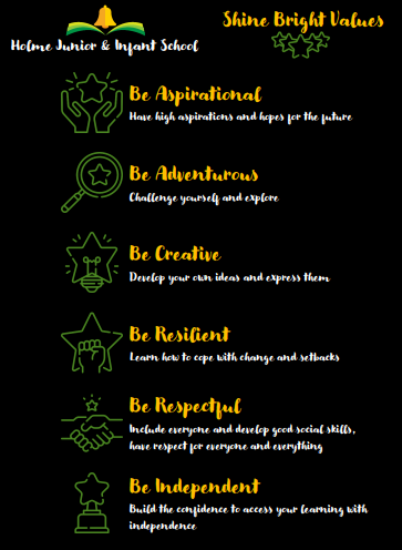 We have updated our Positive Behaviour Policy to include our Shine Bright Values. We wanted to make parents and carers aware of what positive behaviours we would like to see on your child's journey throughout Holme School and also the awards and consequences children will receive dependent on the behaviours they display in-line with our code. We will be celebrating our Shine Bright Values daily in class and allow children to understand what these mean to them and also how they support in their whole Holme School journey to leave as well rounded citizens.