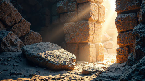 Created with an image by MOTOKO Stock - "Monumental Scene of Jesus’ Tomb with Luminous Resurrection Light – Ideal for Easter Publications, Faith-Based Ads, and Church Materials"