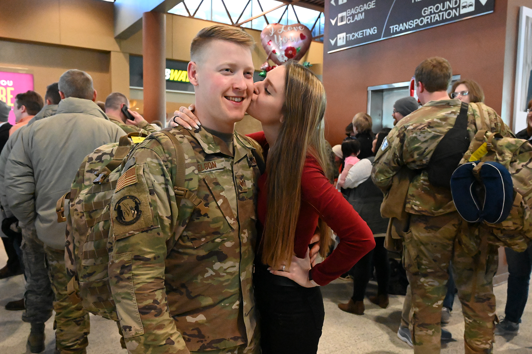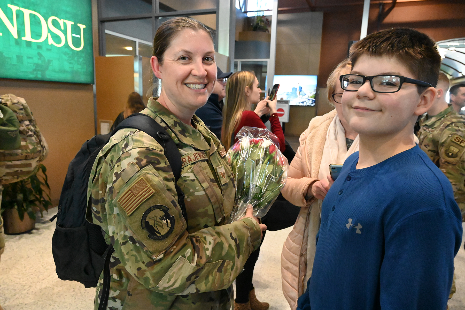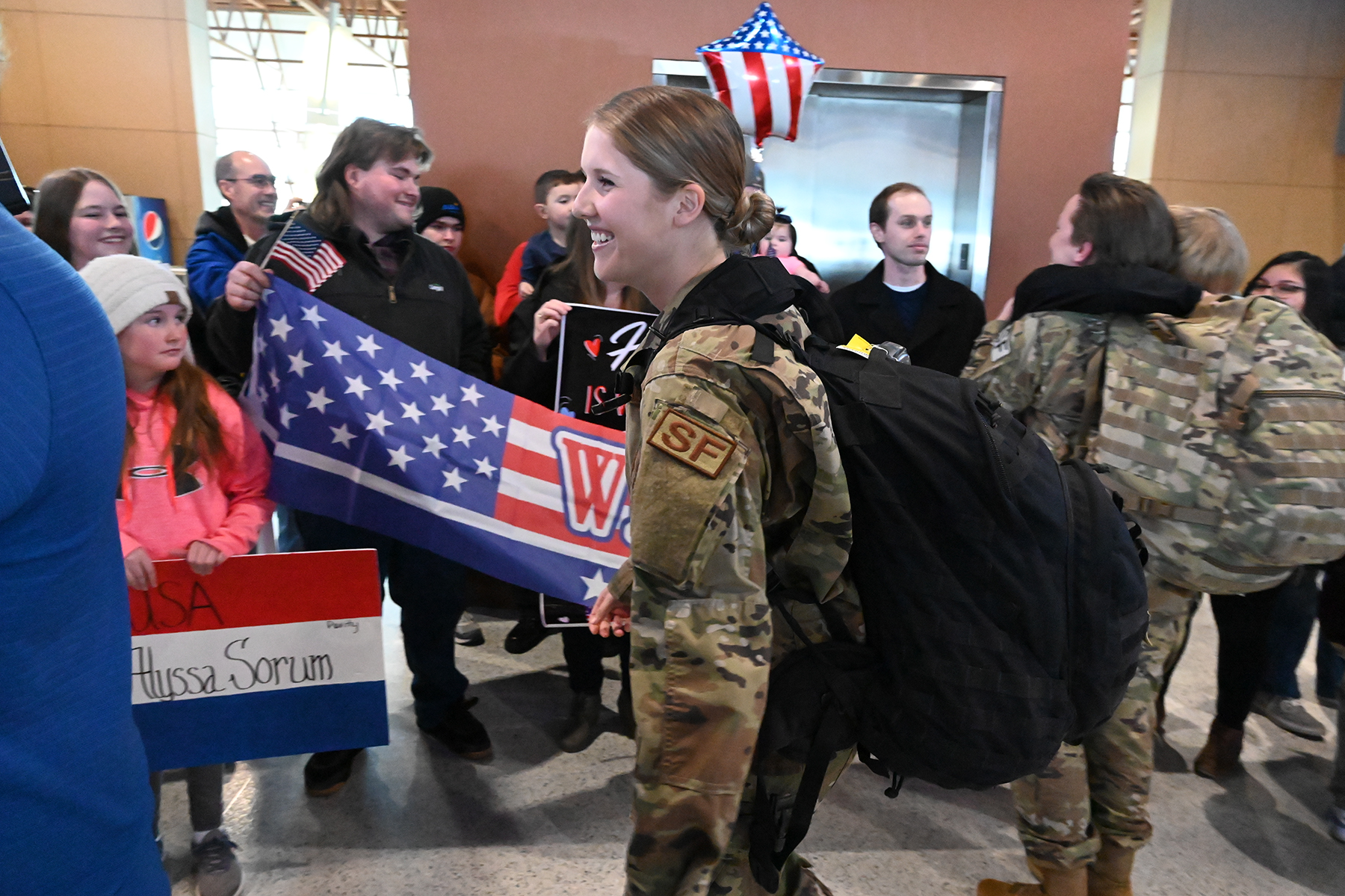 Staff Sgt. Alyssa Sorum, 119th Security Forces Squadron, is greeted at Hector International Airport in Fargo on Feb. 5, upon completion of a six-month deployment to CENTCOM.