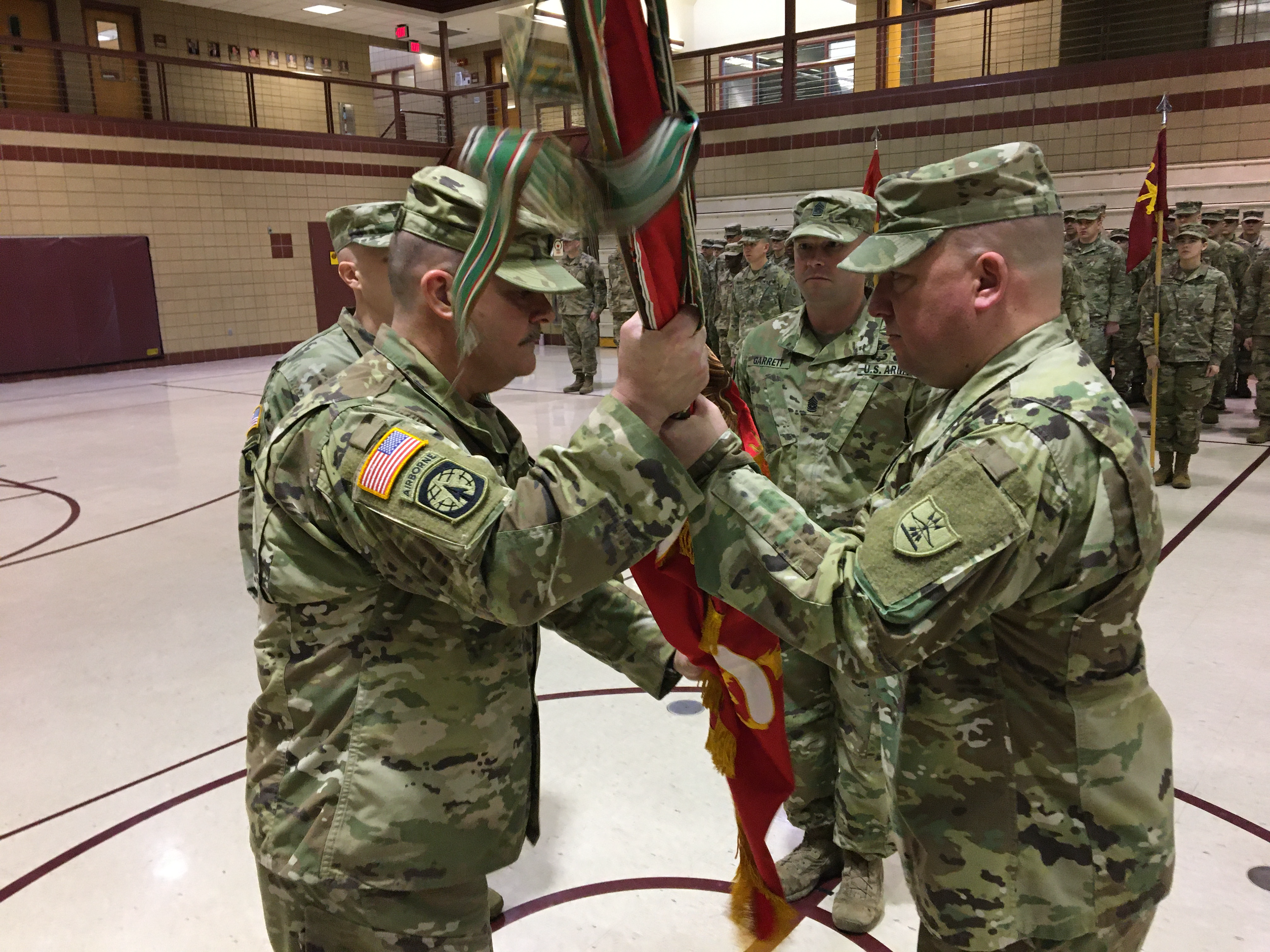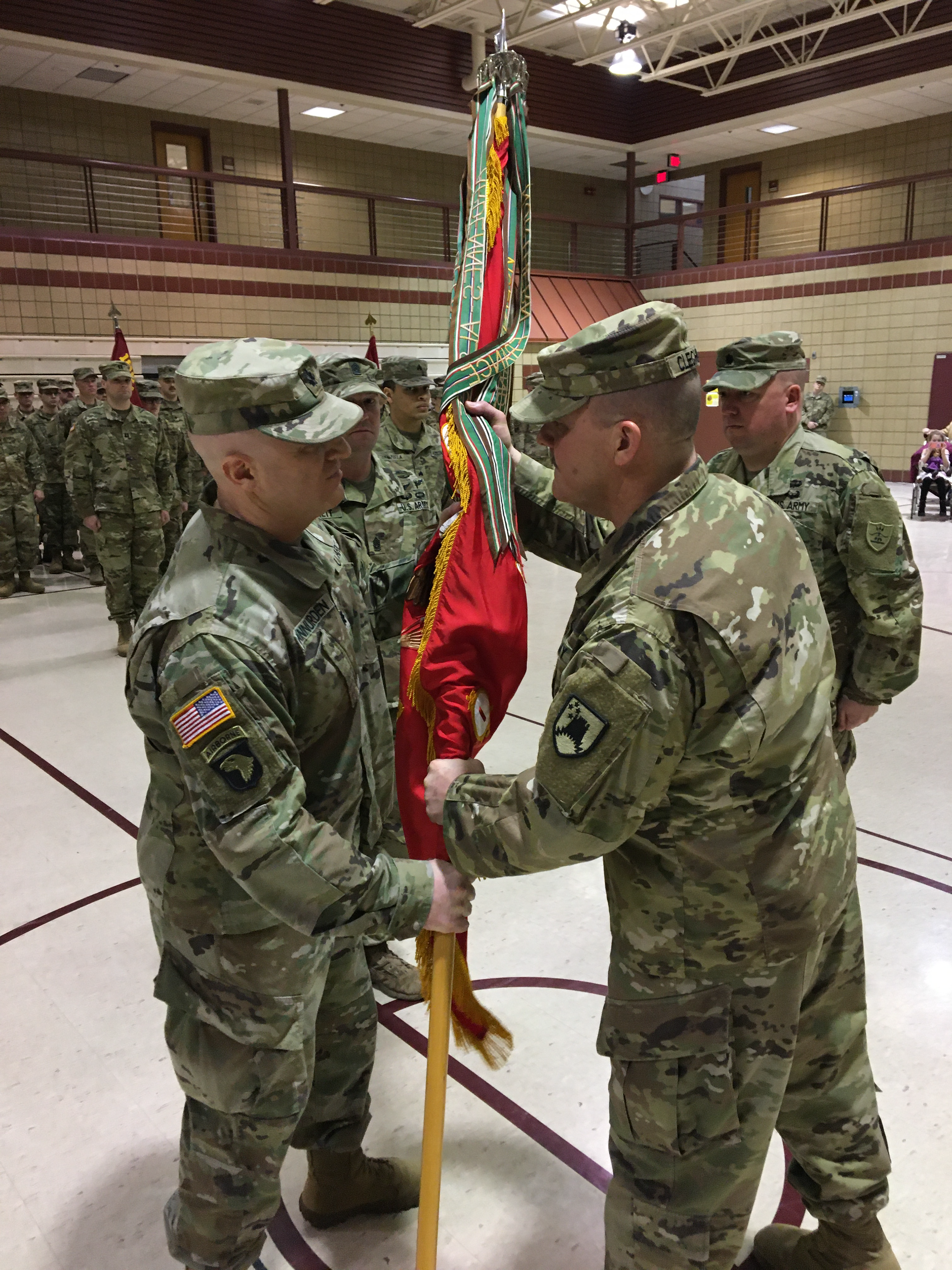 The incoming commander of the 1st Battalion, 188th Air Defense Artillery Regiment, Lt. Col Walyn S. Vannurden, left, recieves the unit colors from Lt. Col. Benjamin Cleghorn during the unit's change of command ceremony.