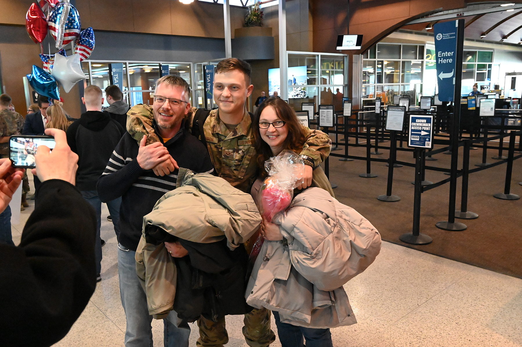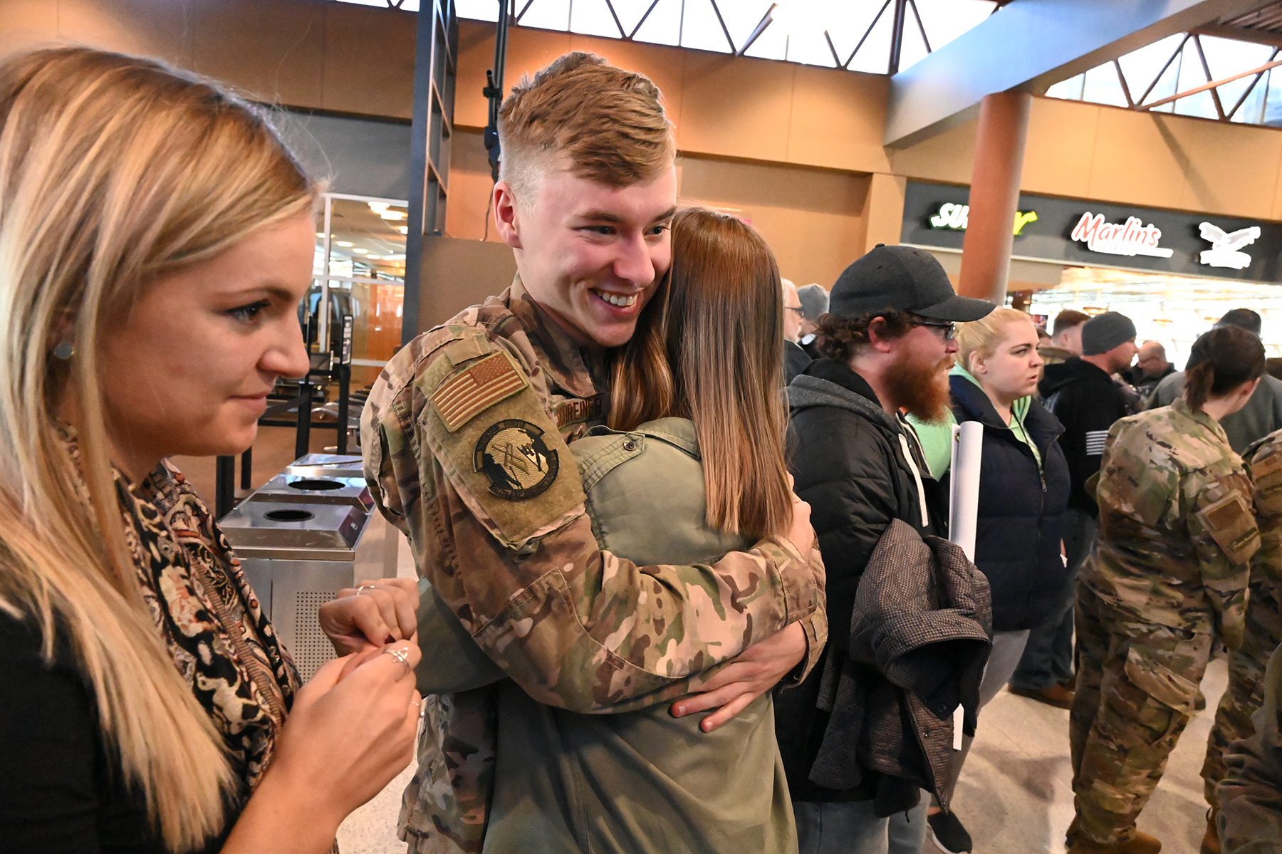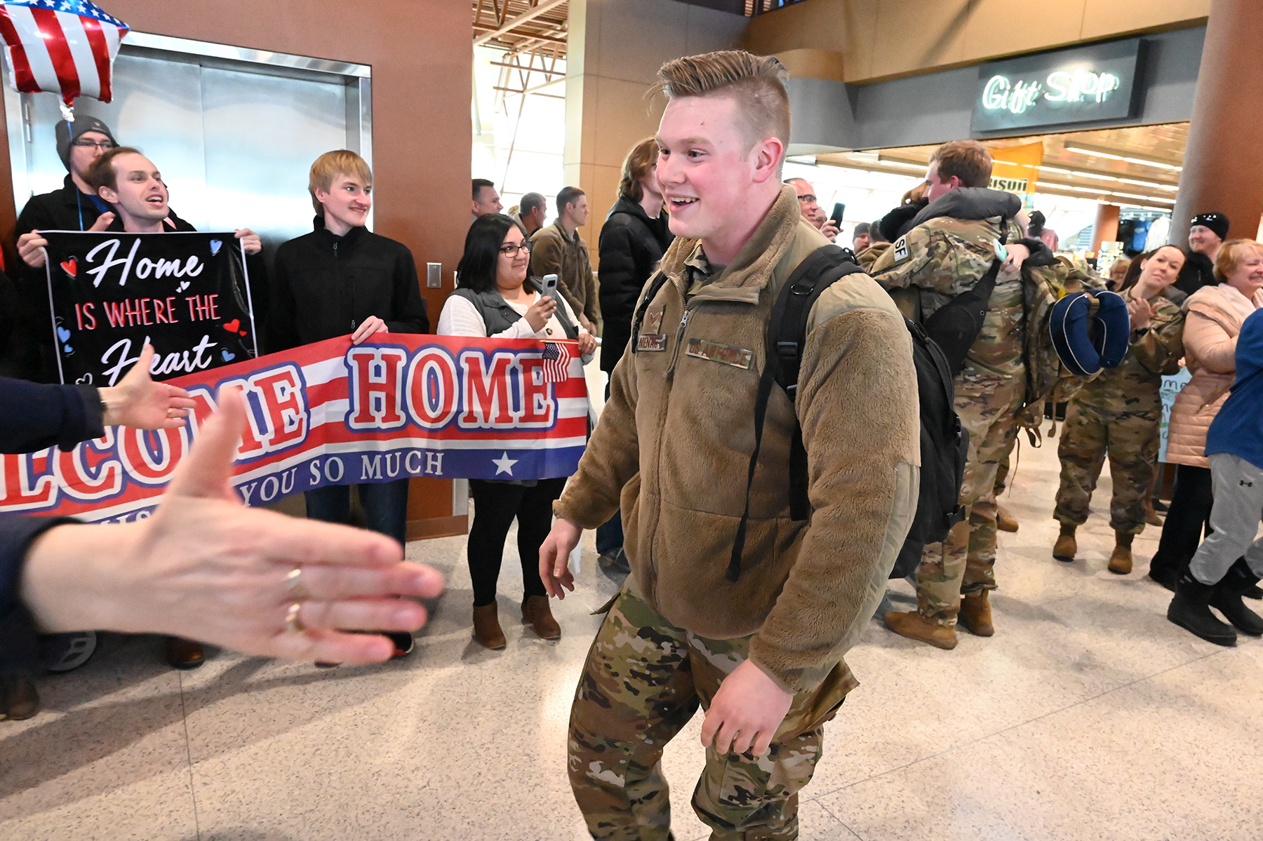 Senior Airman Alexander Nienas, of the 119th Security Forces Squadron, is greeted by friends and family as he returns home to Hector International Airport, Fargo, N.D., upon completion of a six-month deployment to southwest Asia Feb. 5, 2020. (U.S. Air National Guard photo by David H. Lipp