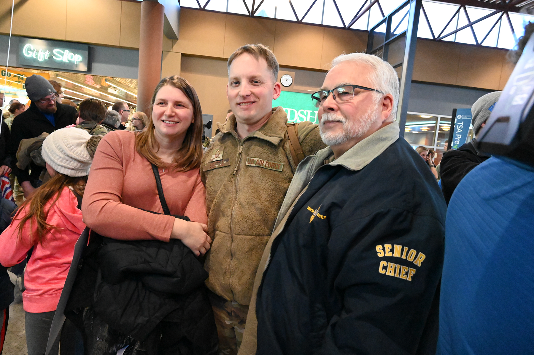 Master Sgt. Christopher Settle, 119th Security Forces Squadron, is greeted at Hector International Airport in Fargo on Feb. 5, upon completion of a six-month deployment to CENTCOM.