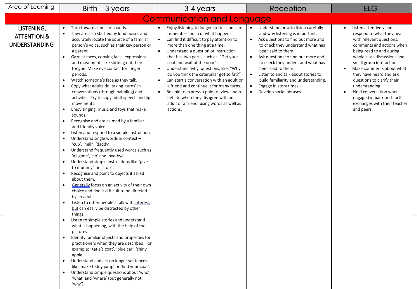 Our Curriculum is divided into 7 main areas of learning. Each area is divided into sub-sections. The curriculum takes pupils in EYFS from birth to 5 years old, working towards the Early Learning Goals. All the areas of learning are important and are inter-connected. They work alongside the characteristics of learning.