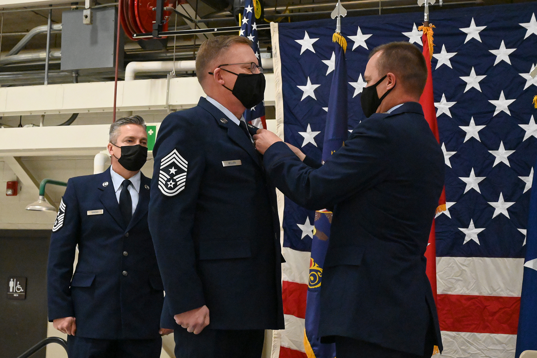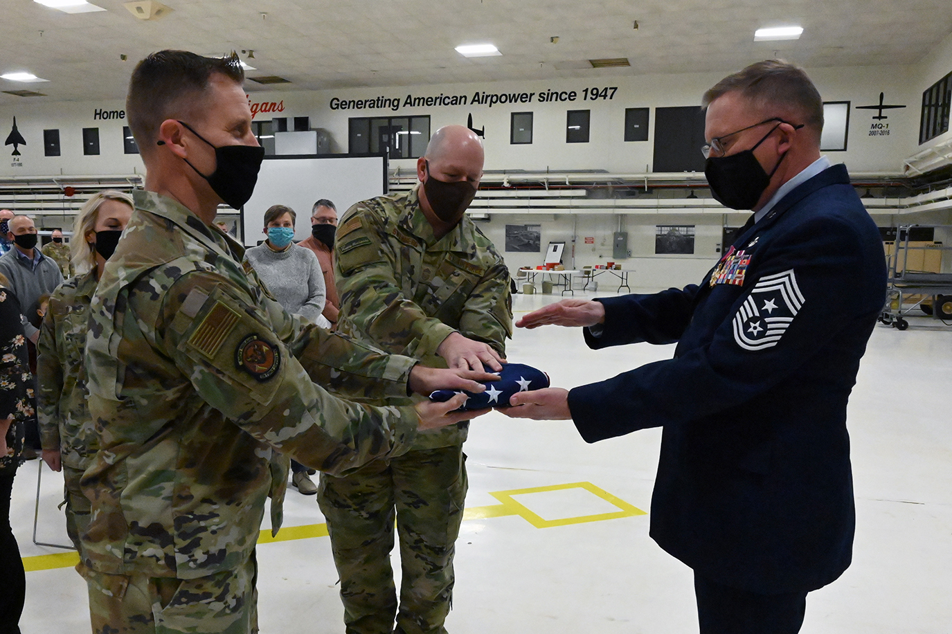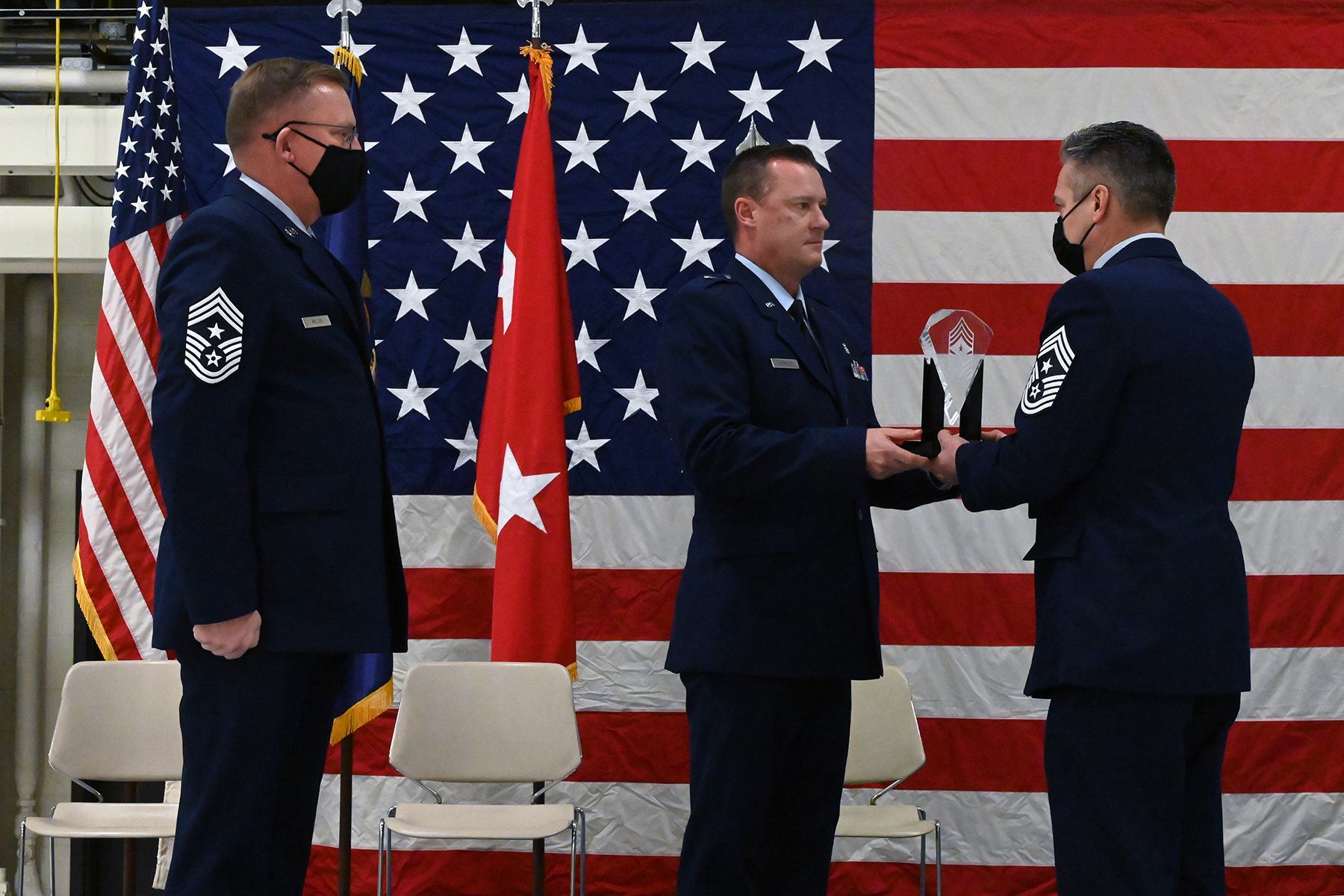 Top: Brig. Gen. Robert Schulte, center, the N.D. National Guard chief of staff for Air, presents a symbolic glass etching to Chief Master Sgt. Duane Kangas, right, as he assumes the position of State Command Chief during a change of responsibility ceremony at the Air National Guard Base, Fargo, N.D., Dec. 5, 2020. Chief Master Sgt. Jeff Miller, outgoing State Command Chief, stands at attention on the left. (U.S. Air National Guard photo by Chief Master Sgt. David H. Lipp)
