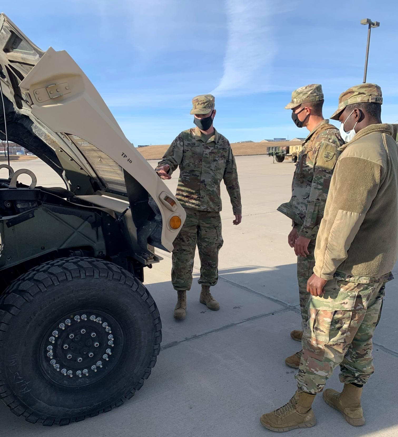 Soldiers of Headquarters and Headquarters Company, 131st Military Police Battalion, experienced an extremely busy Inactive Duty for Training (IDT) weekend, Dec. 5 to 6, 2020 at the Raymond J. Bohn armory in Bismarck. Transport Operators serve a vital role in the the Army’s transportation logistics team. Pfc. Trey Shereck and Pvt. Augustine Sapaty will be responsible for the supervision of operation and maintenance of wheeled vehicles driving over all types of terrain while safely transporting cargo and troops. Their duties also include the management of loading, unloading, and reporting vehicle problems or damage. (Story and photos by Spc. Rachelle Lewis, 131st Military Police Battalion)