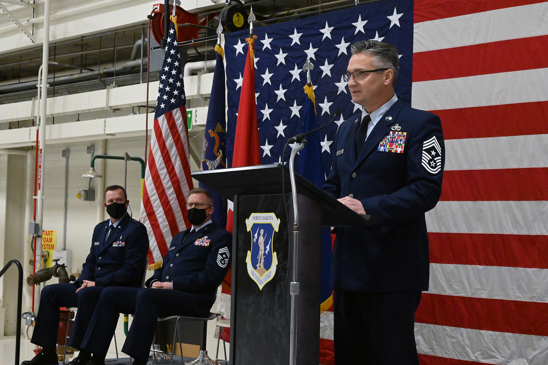 Chief Master Sgt. Duane Kangas renders remarks during a change of responsibility ceremony where he formally assumed duties as the State Command Chief at the N.D. Air National Guard Base, Fargo, N.D., Dec. 5, 2020.