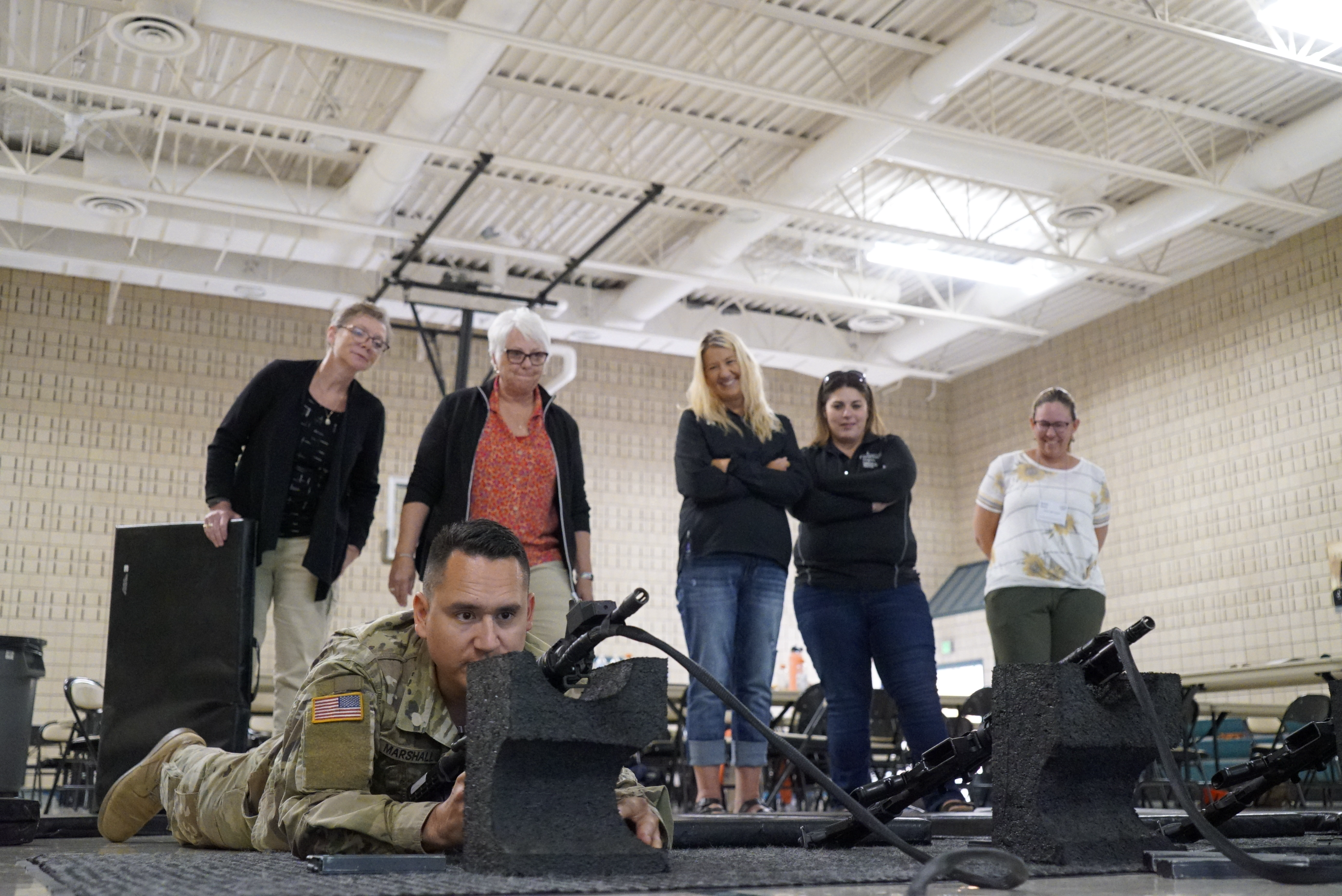 Sergeant 1st Class Rose Schwind, N.D. Army National Guard Recruiting and Retention Battalion, shows school counselors how Soldiers train on weapon simulators during the 2021 Career and Technical Education Professional Development Conference, Bismarck, August 11, 2021.