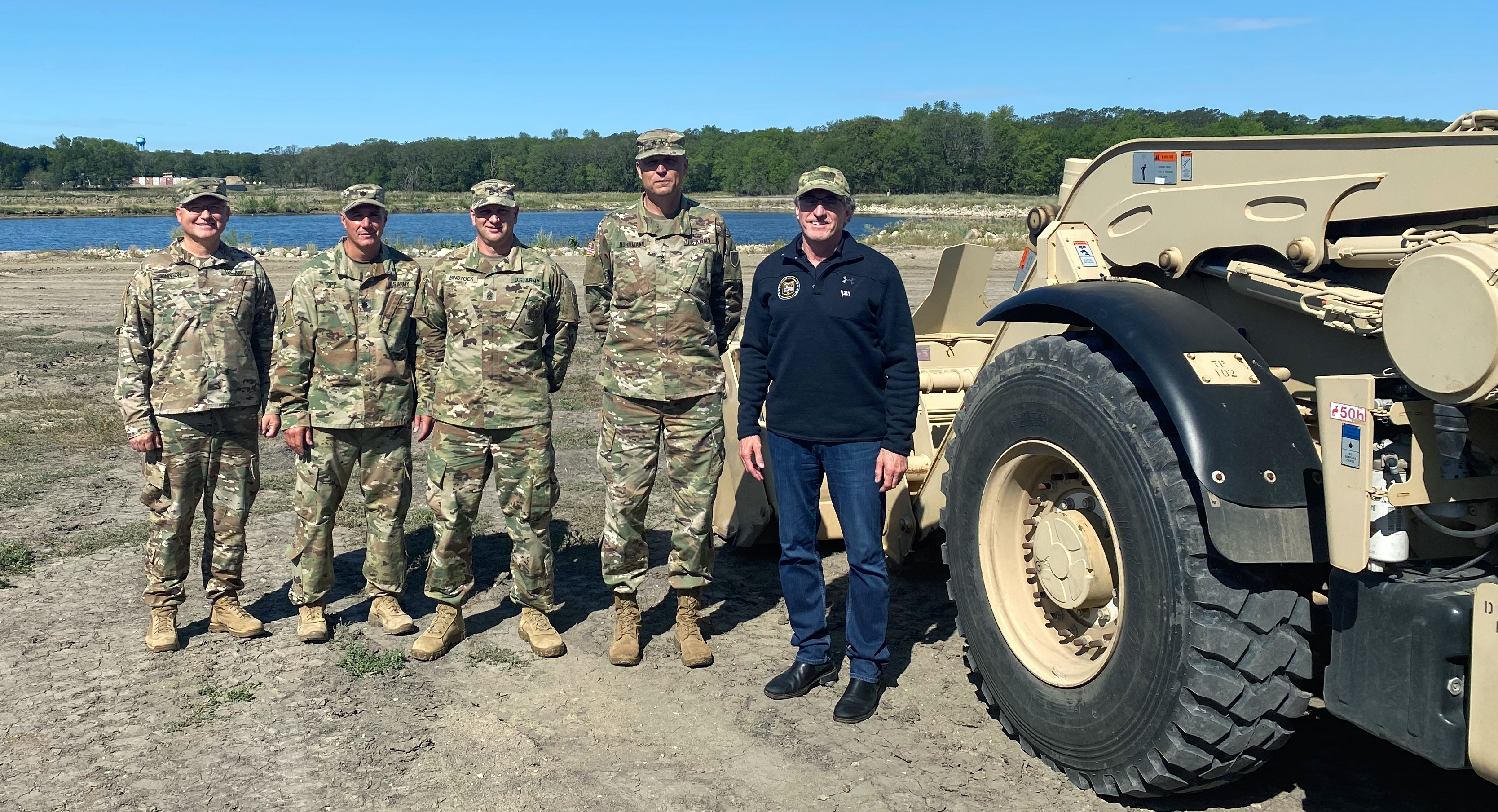 Photo: From right, Gov. Doug Burgum; Maj. Gen. Al Dohrmann, N.D. adjutant general; Command Sgt. Maj. Eric Binstock, N.D. National Guard's senior enlisted leader; Lt. Col. Mark Topp, and Col. Ed Johnson, commander, Camp Grafton Training Center (CGTC) tour Richey Bridge Park, an Army bridge training area, CGTC, Aug. 13, 2021