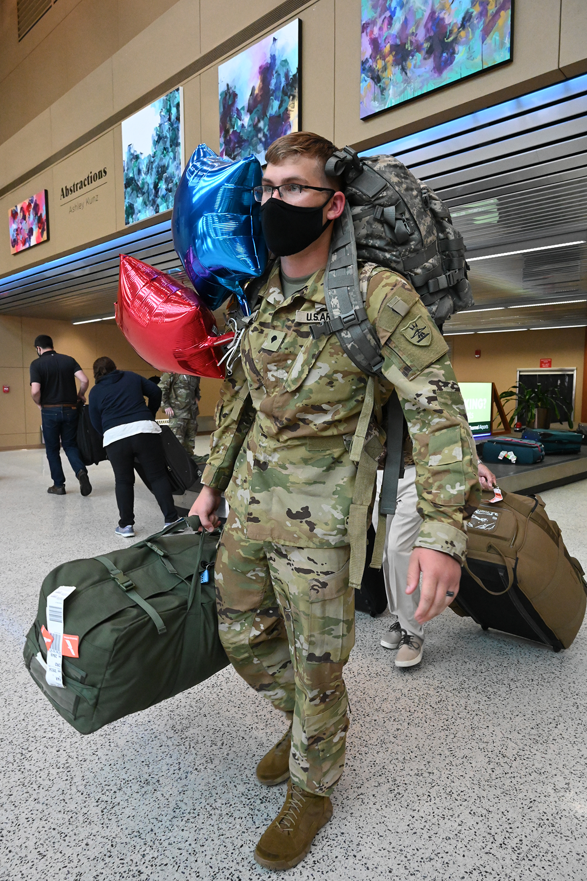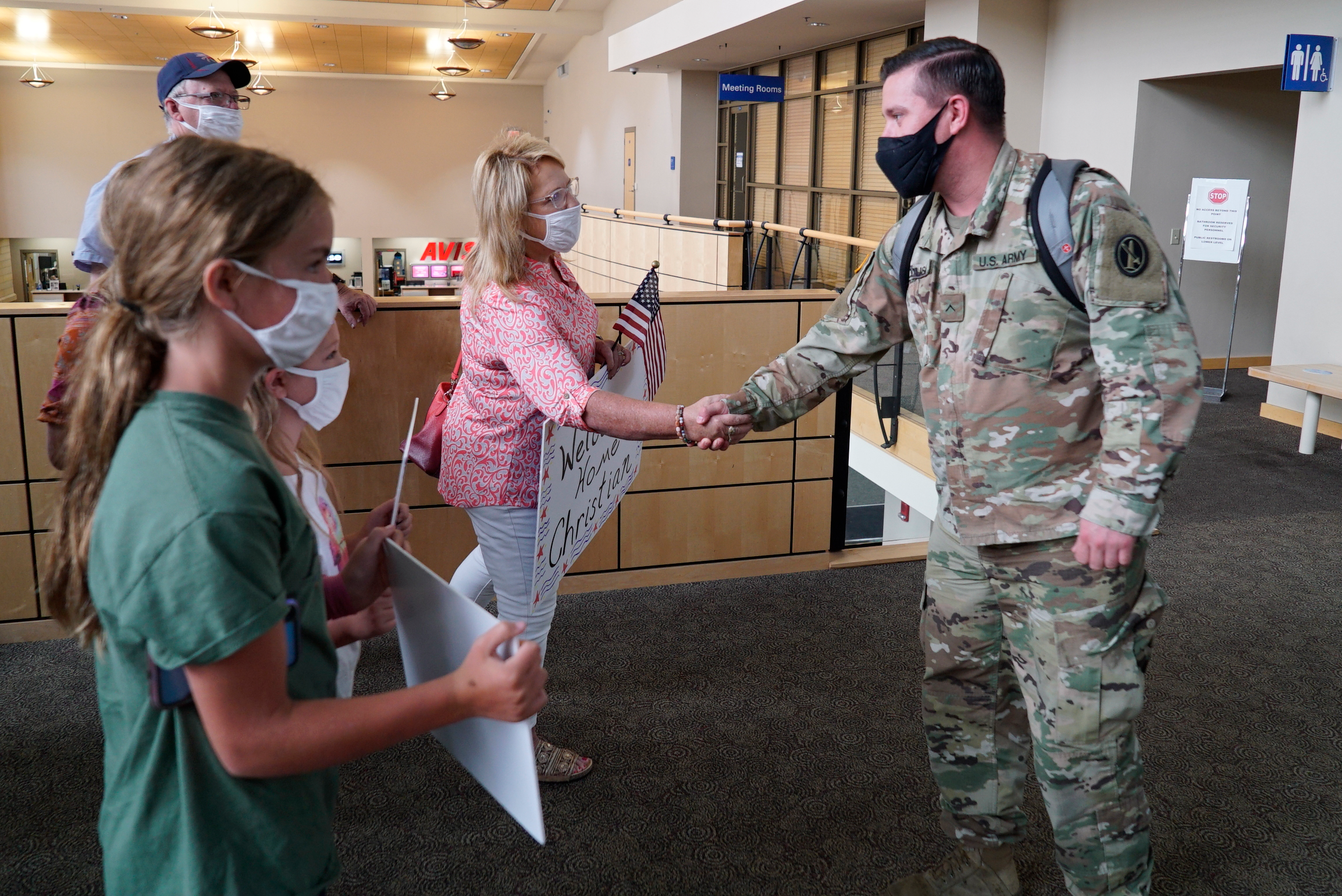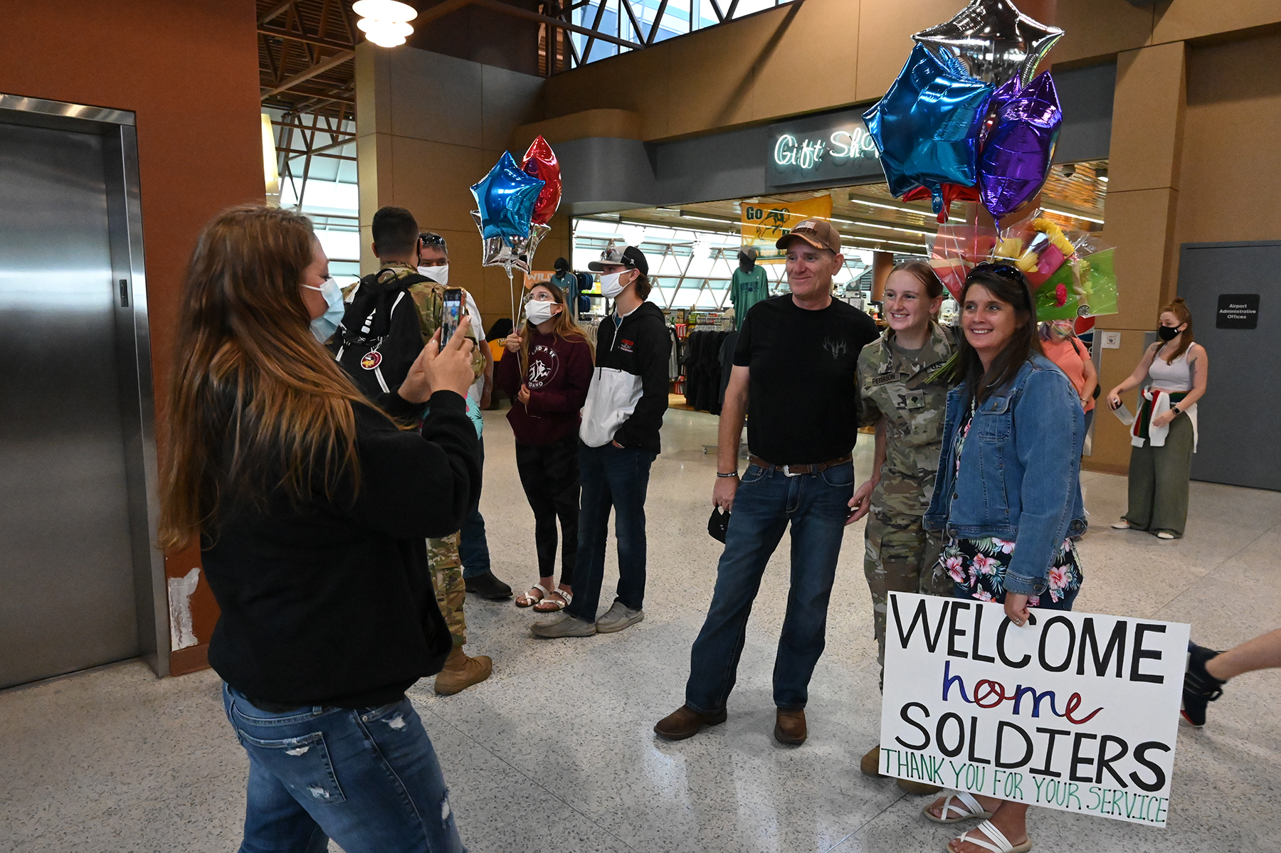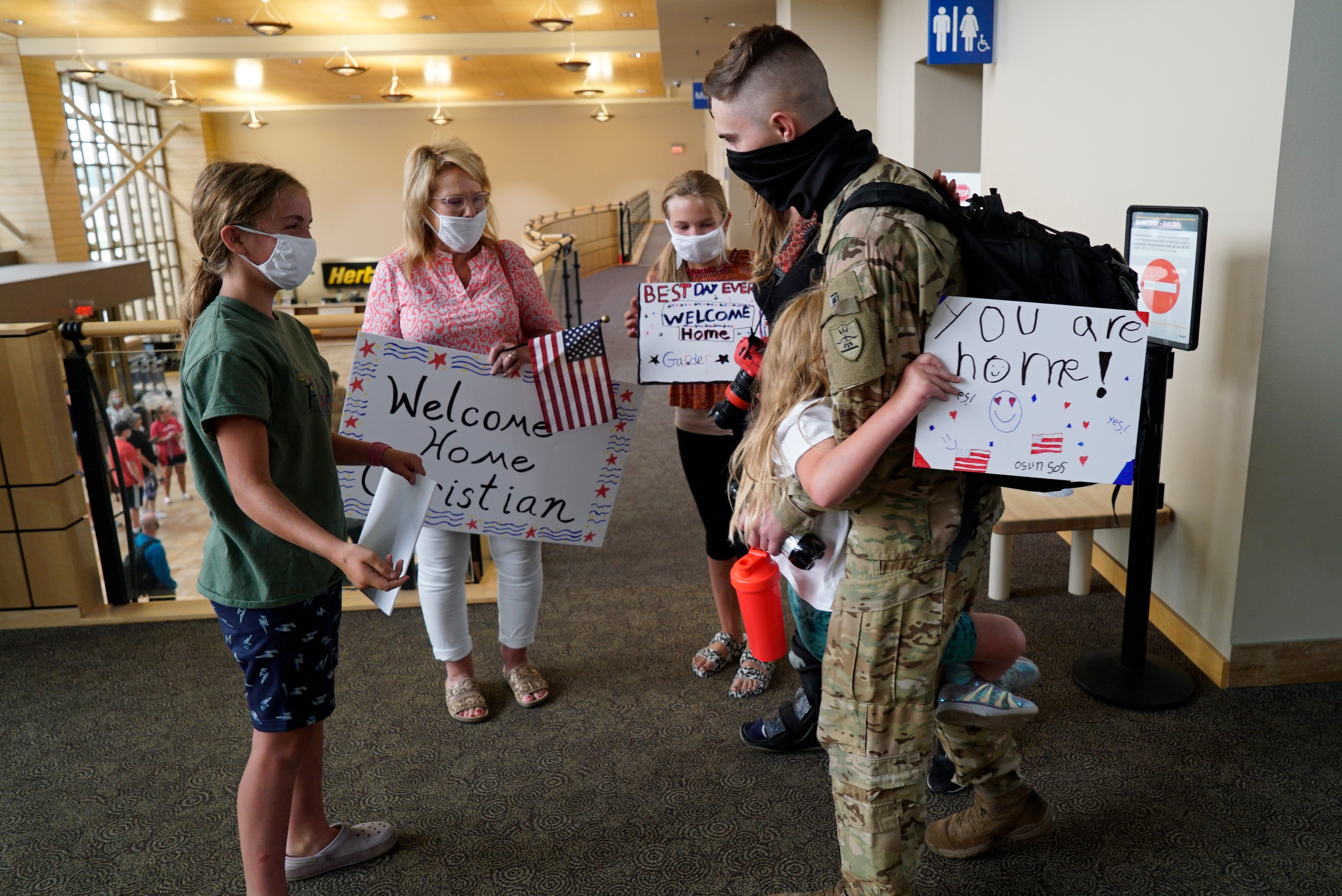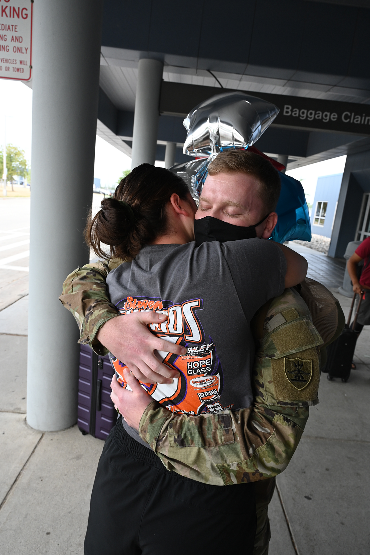 Specialist Christian Gardner, 2nd Battalion, 285th Aviation Regiment, is greeted by his family at the Bismarck Airport, Aug. 7, 2021. Gardner returned from a nine-month deployment to the National Capital Region. (National Guard photos by Sgt. 1st Class Charles Highland, N.D. National Guard Public Affairs)