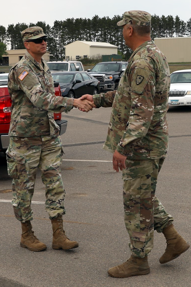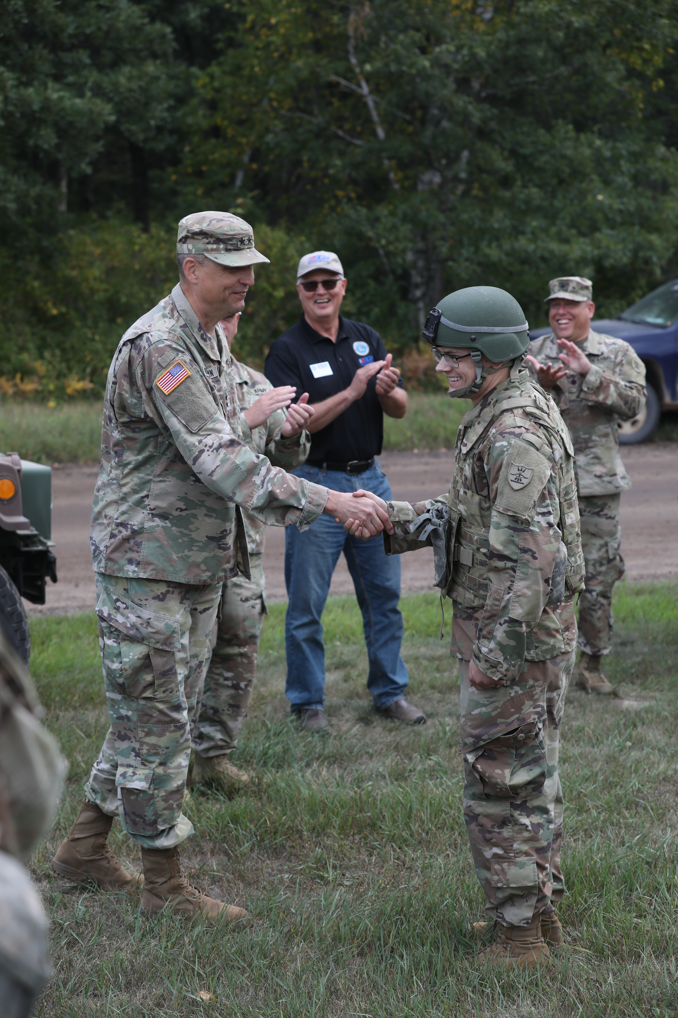 Major General Al Dohrmann, N.D. adjutant general, Command Sgt. Maj. Eric Binstock, senior enlisted leader, and Mr. Delton Steele, honorary commander for N.D. Joint Force Headquarters, visited the 164th Engineer Battalion at Camp Ripley, Aug 10, 2021. (National Guard story and photos by Spc. Jorden Newbanks, Minnesota National Guard)