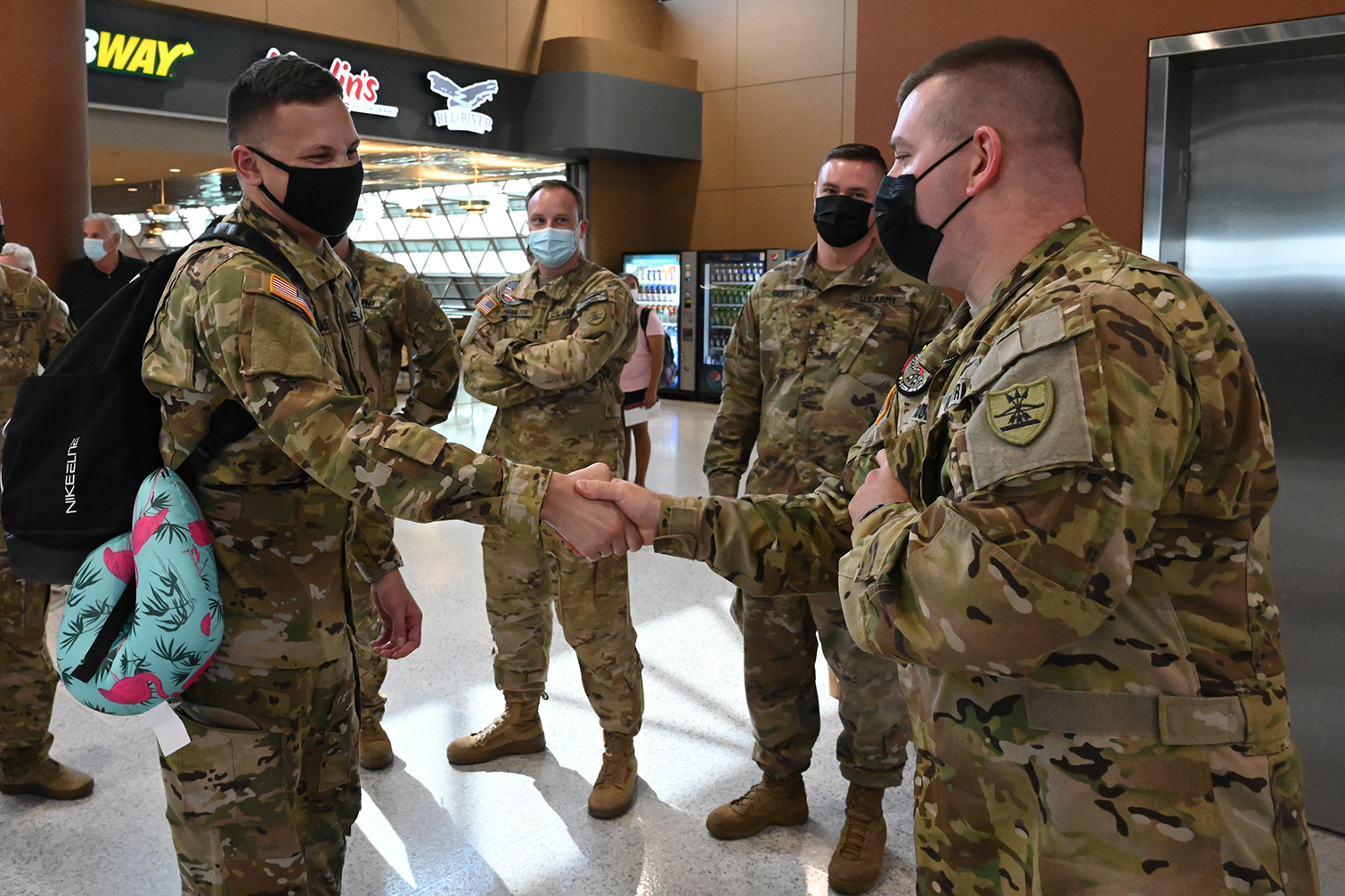 Families, friends and senior N.D. National Guard leaders greet Soldiers of the 2nd Battalion, 285th Aviation Regiment at the Bismarck Airport, Aug. 7, 2021. About 17 Soldiers returned to airports in Bismarck, Fargo, Grand Forks and Minot after a nine-month tour of duty in the National Capital Region. (National Guard photos by Sgt. 1st Class Charles Highland, N.D. National Guard Public Affairs)