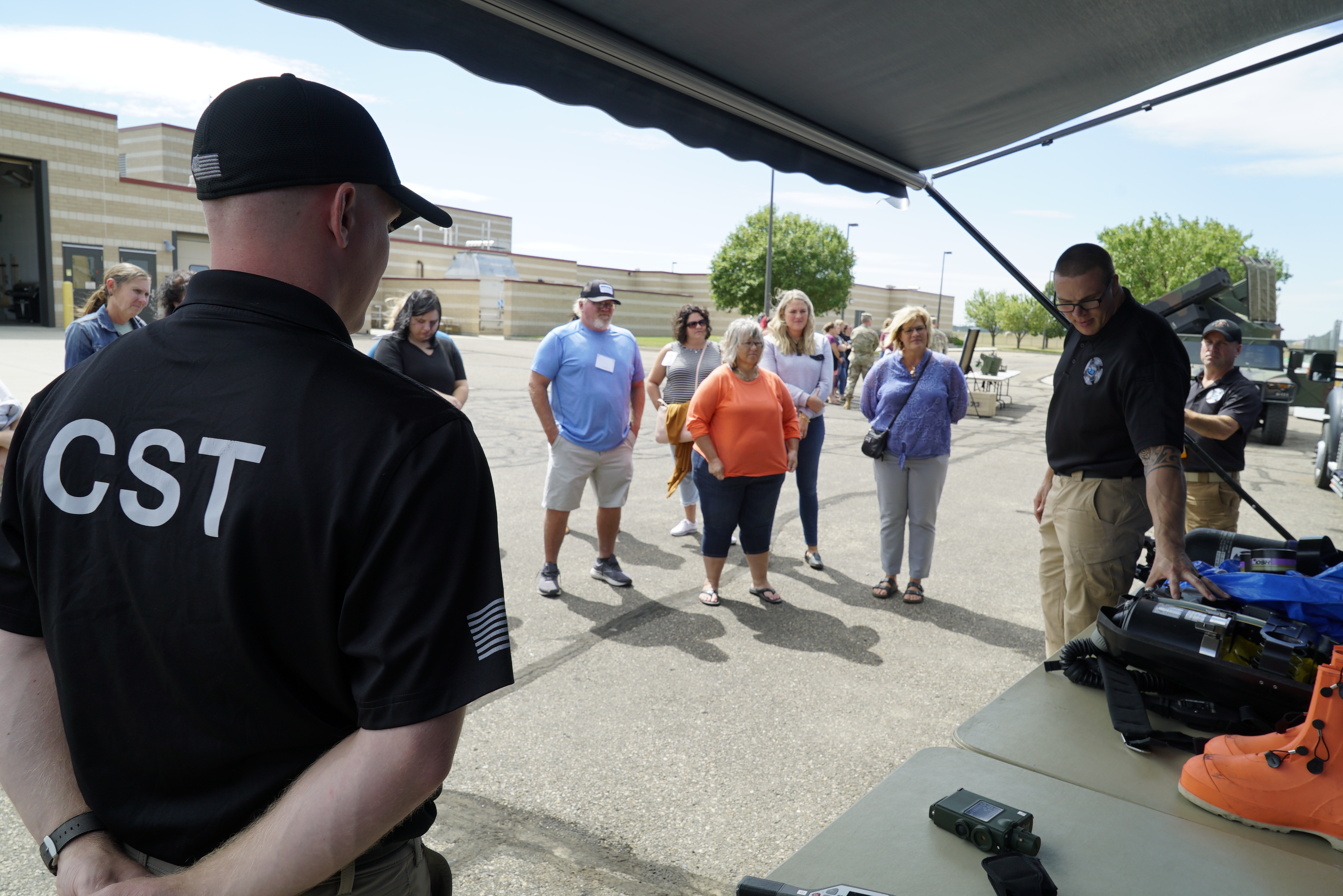 Staff Sergeant Chris Hickel, right, 81st Civil Support Team, discusses team equipment and job responsibilities with school counselors during the 2021 Career and Technical Education Professional Development Conference, Bismarck, Aug. 11, 2021.