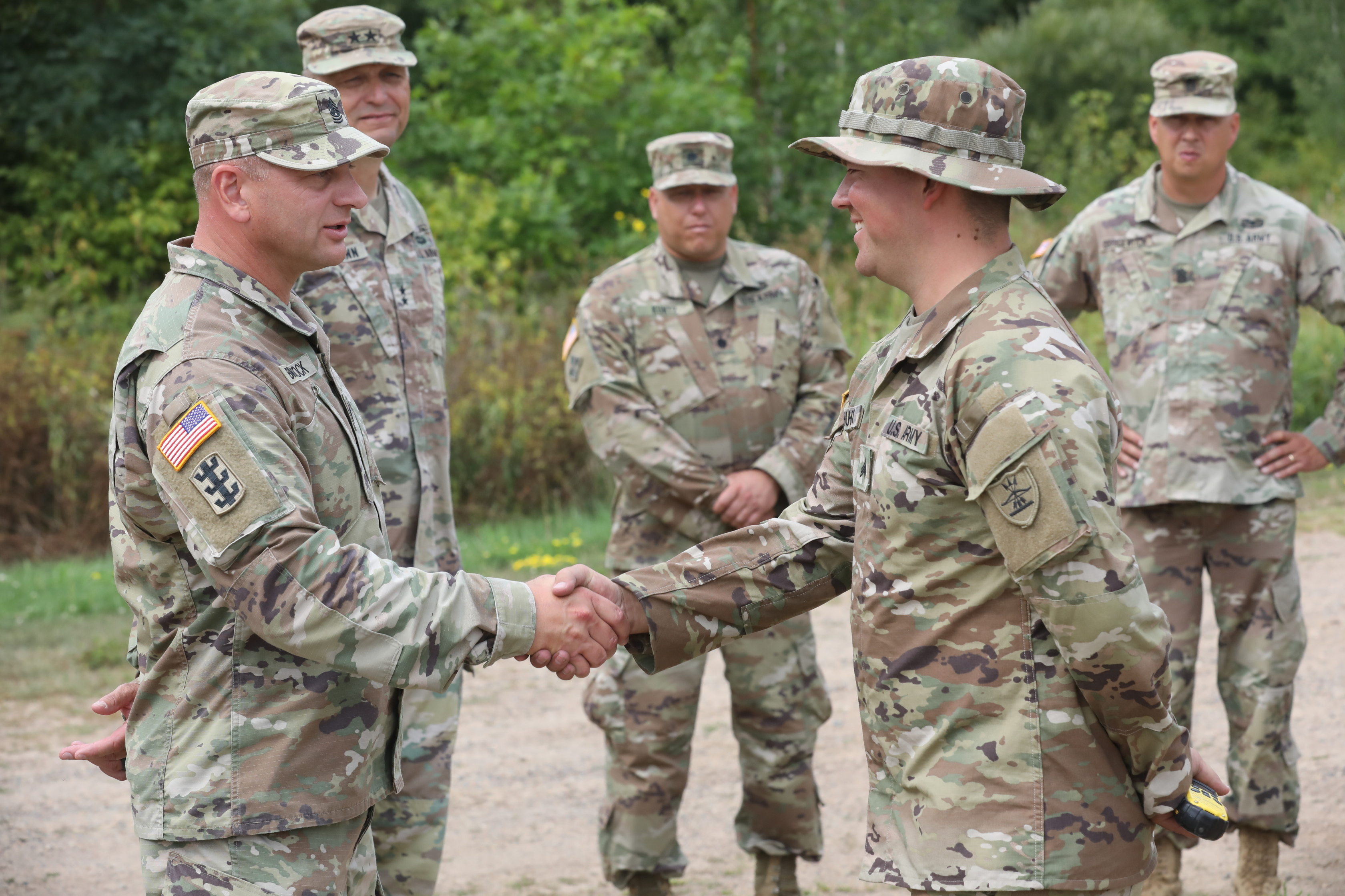 Command Sergeant Major Eric Binstock, left, senior enlisted leader for the N.D. National Guard, presents a recognition coin to a 164th Engineer Battalion Soldier, Camp Ripley Training Center, Minnesota, August 10, 2021.