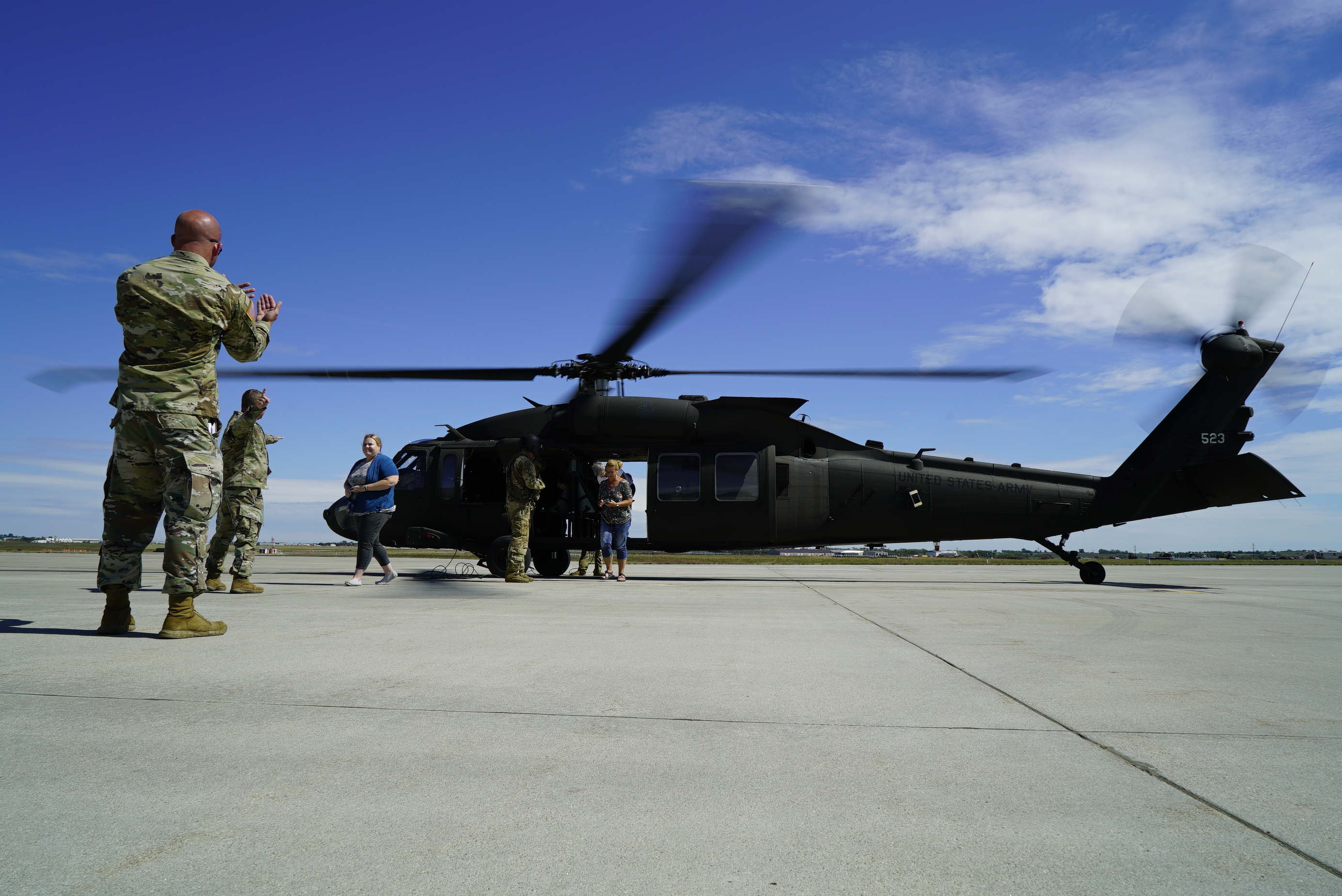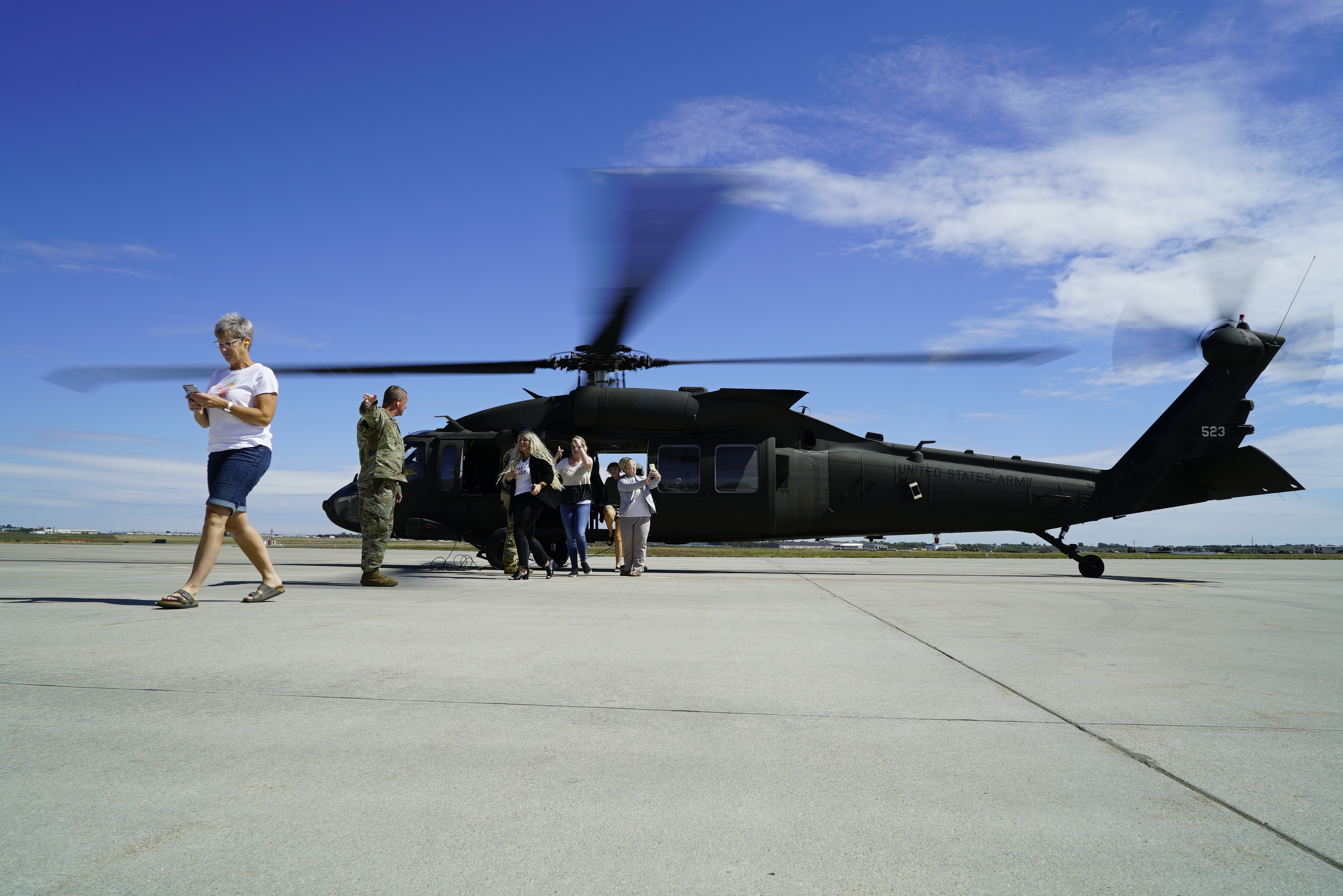 North Dakota National Guard Soldiers guide school counselors exiting a UH-60 Black Hawk helicopter at the Army Aviation Support Facility during a Career and Technical Education Professional Development engagement, Bismarck, N.D., August 11, 2021. (National Guard photo by Sgt. 1st Class Charles Highland, N.D. National Guard Public Affairs Office)