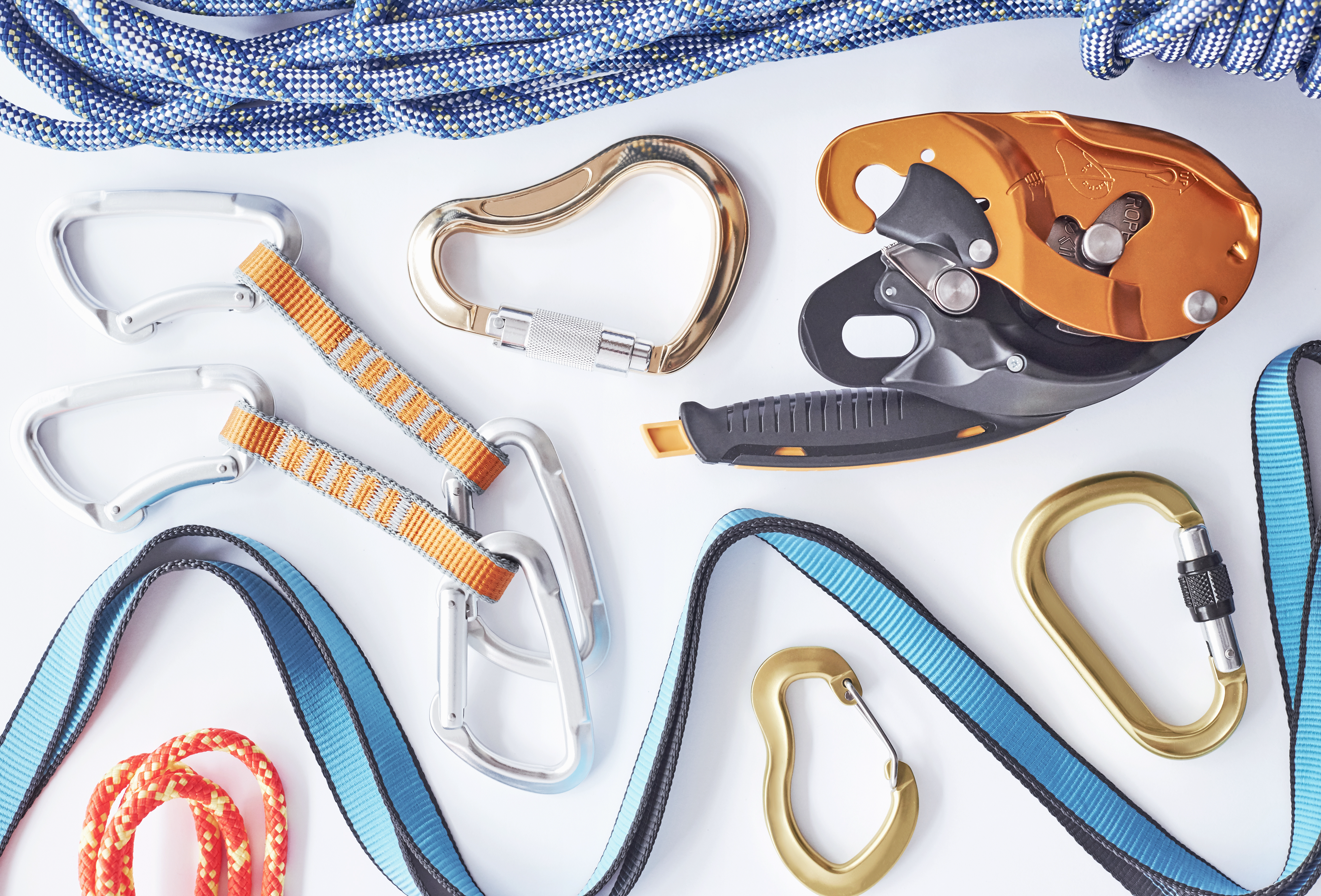 Created with an image by standret - "Setting for beginner and professional. Top view. Climbing equipment for the safeness lying on the white table. Conception of extreme sports"