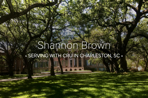 Hey there! My name is Shannon and I serve with Cru in the SC Lowcountry. As a college student, Jesus ignited my heart with a passion for helping fulfill the Great Commission and sharing the gospel with college students. Since joining staff in 2008, I have seen the Lord move in extraordinary ways both in Charleston and overseas.