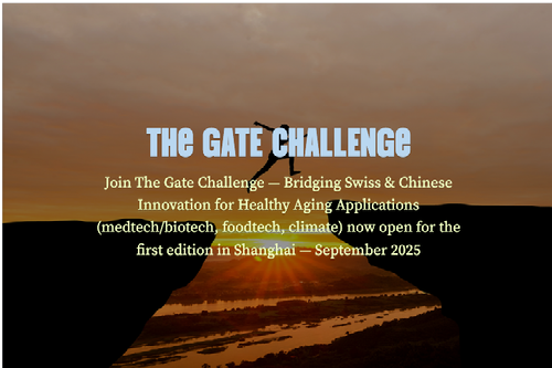 The Gate Challenge is a brand-new acceleration program launching in Shanghai in September 2025. Developed in collaboration with leading Chinese innovation players, it aims to build a strong, forward-looking bridge between Switzerland and China around a shared global challenge: Healthy Aging — a powerful driver of innovation in fields such as health, nutrition, longevity, autonomy, sport, and advanced technology.