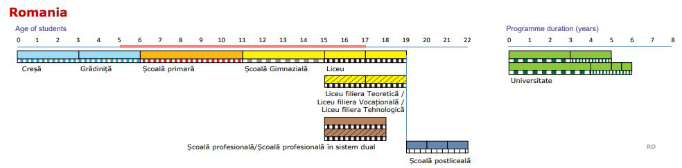 Publicația prezintă durata învățământului obligatoriu în Europa în anul școlar 2021/2022, cu menționarea vârstelor (de începere și de finalizare a învățământului obligatoriu).