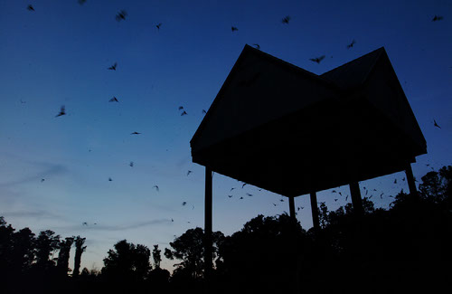 The second bat house was built in 2010 after the first reached full capacity. In 2017, a third house was built and in 2022 the original house was removed due to deterioration, but convincing the bats to relocate proved difficult. Johnson and others tried various methods, including placing smaller bat houses nearby, adding landing pads, improving ventilation, and using exclusion techniques. This involved covering the original house with netting to force the bats to the bottom when they left at dusk, making it harder for them to return. After four to five days, most of the bats successfully moved to the new house and they were able to exclude all bats from the original.