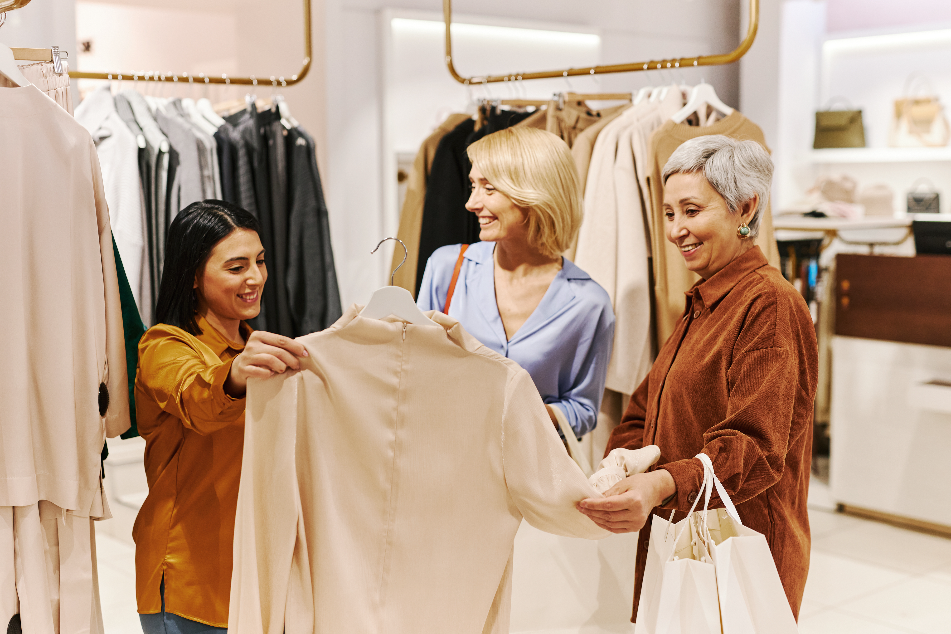 Created with images by Seventyfour - "Diverse group of women shopping for clothes in boutique and looking blouses" • DC Studio - "Diversity of formal clothes hanging in modern retail shop, empty clothing store or boutique filled with fashionable merchandise.,Trendy modern store, small business concept.,Close up."