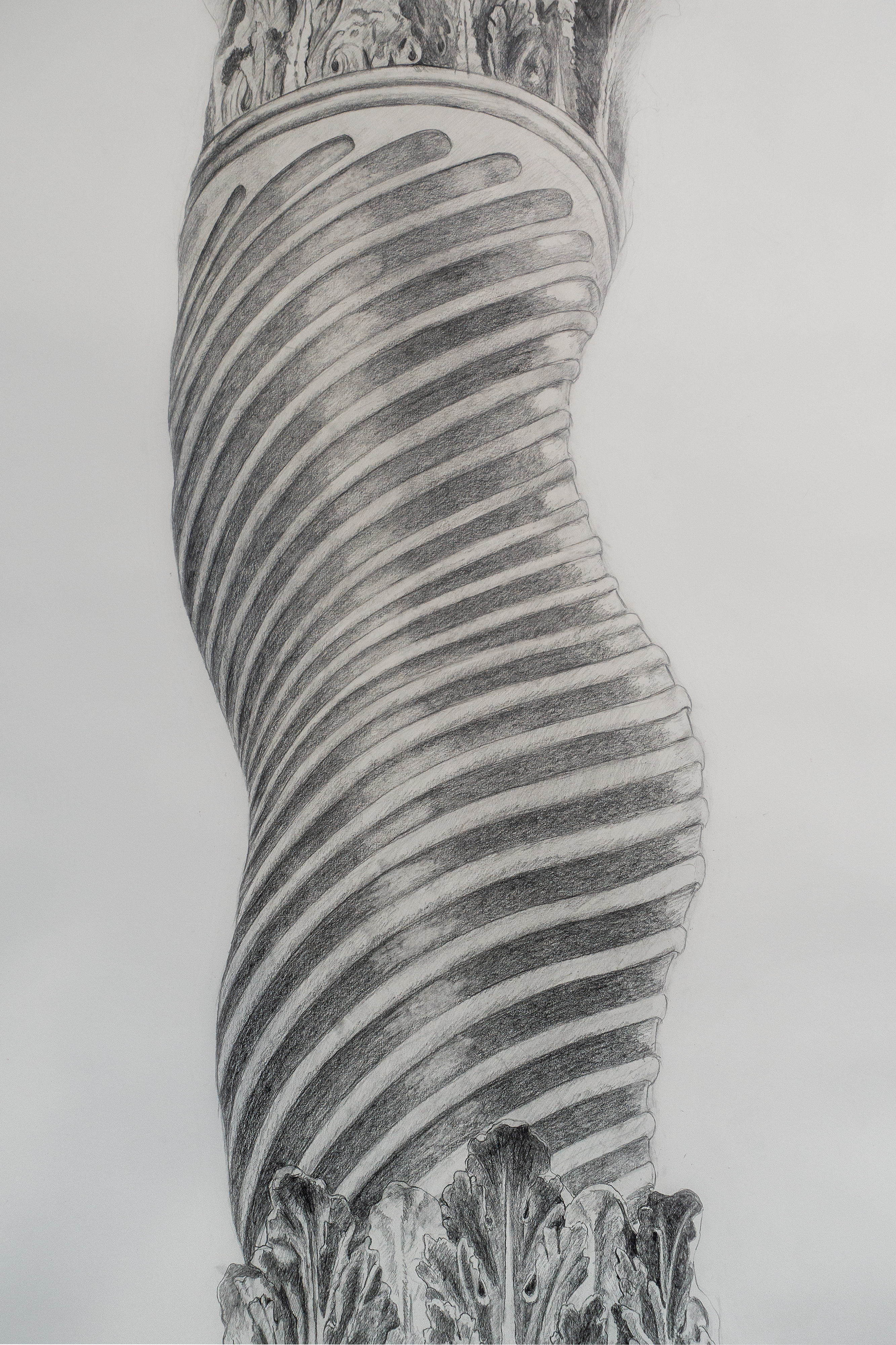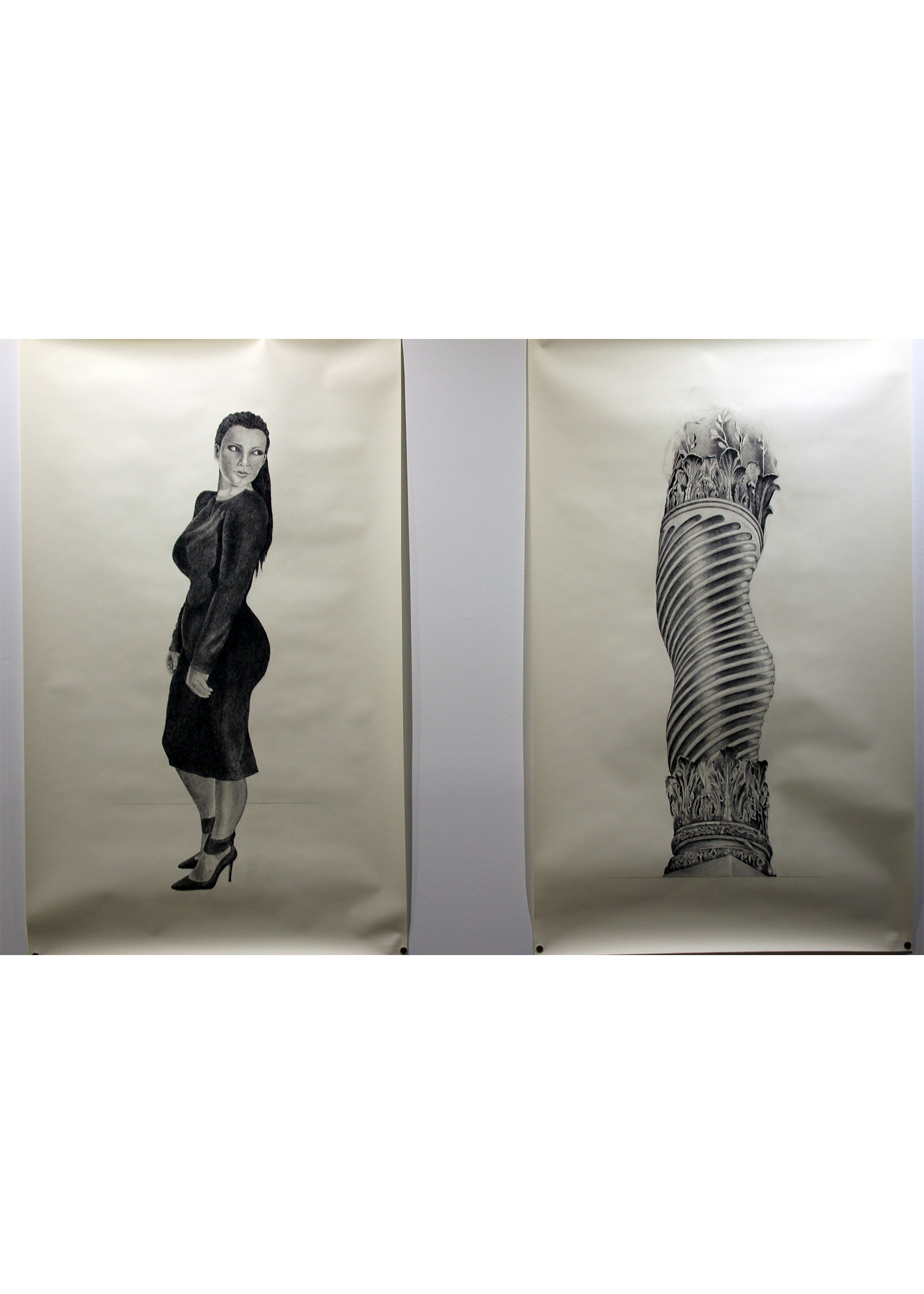 I am interested in the metaphorical implications of the human body—especially the female body—when tied to place: buildings, fountains, and other structures. In Kardashian/Bernini, I pair Kim Kardashian’s Barbie-like physical proportions with one of Gian Lorenzo Bernini’s Solomonic columns at St. Peter’s Basilica.