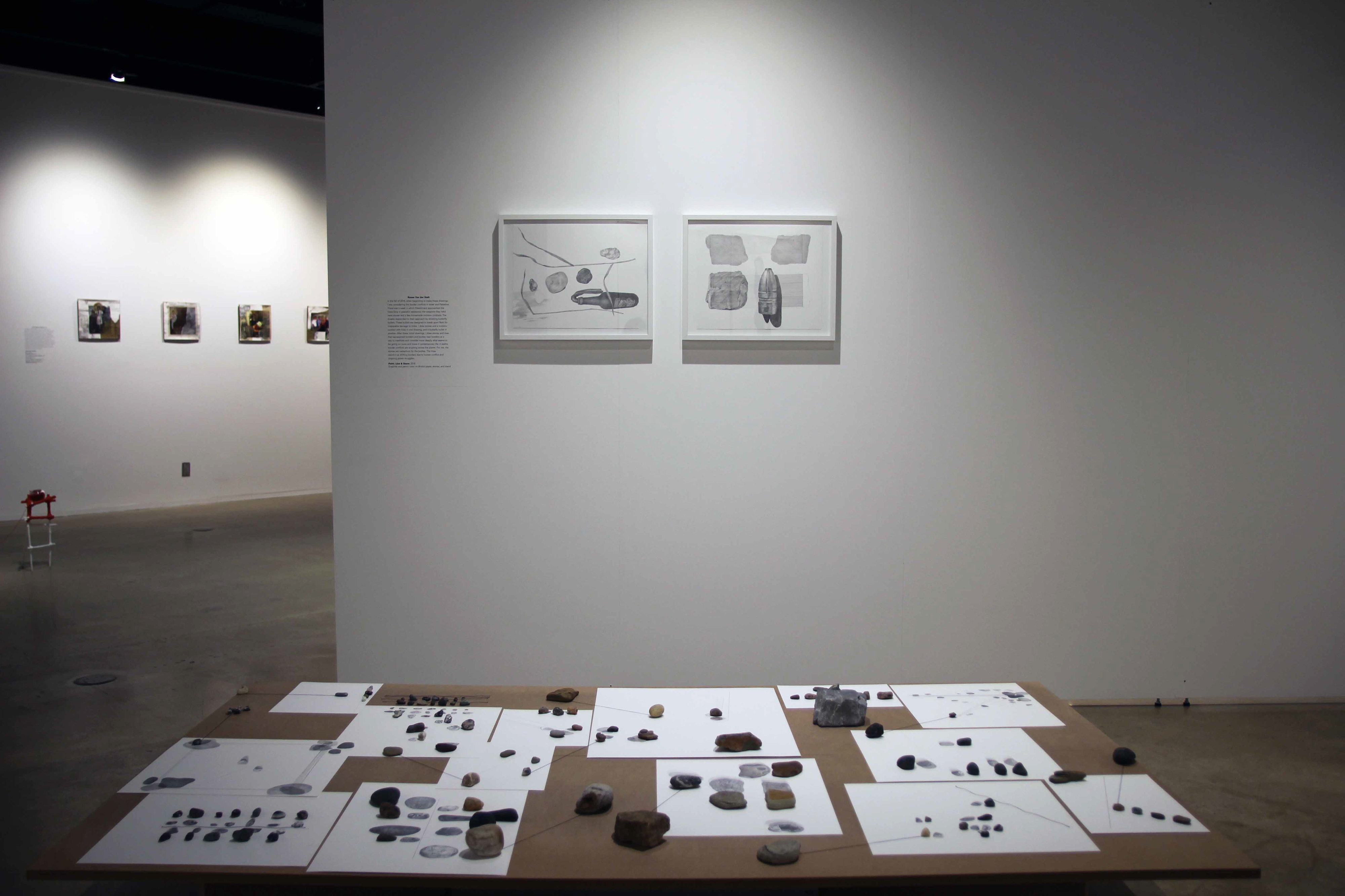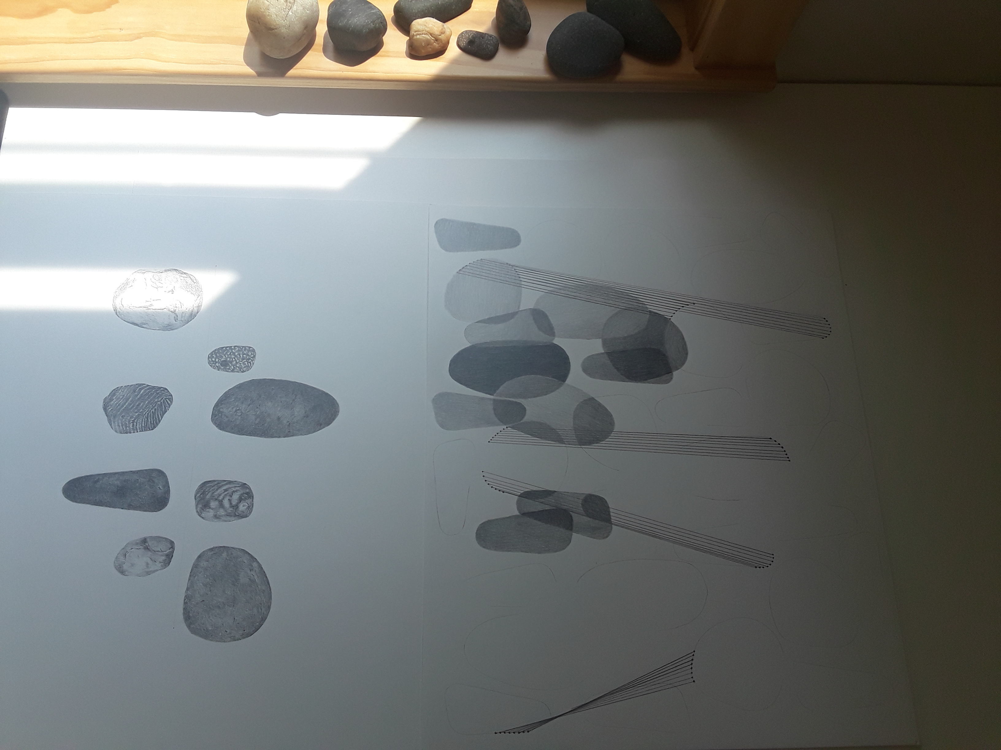 After these initial drawings, I drew stones and lines that represented borders and bodies near borders as a way to meditate and consider more deeply what seems to be going on more and more in contemporary life; it seems border conflicts are erupting across the planet. For me, the stones are metaphors for the bodies. The lines stand-in as shifting borders due to human conflict and ongoing power struggles.