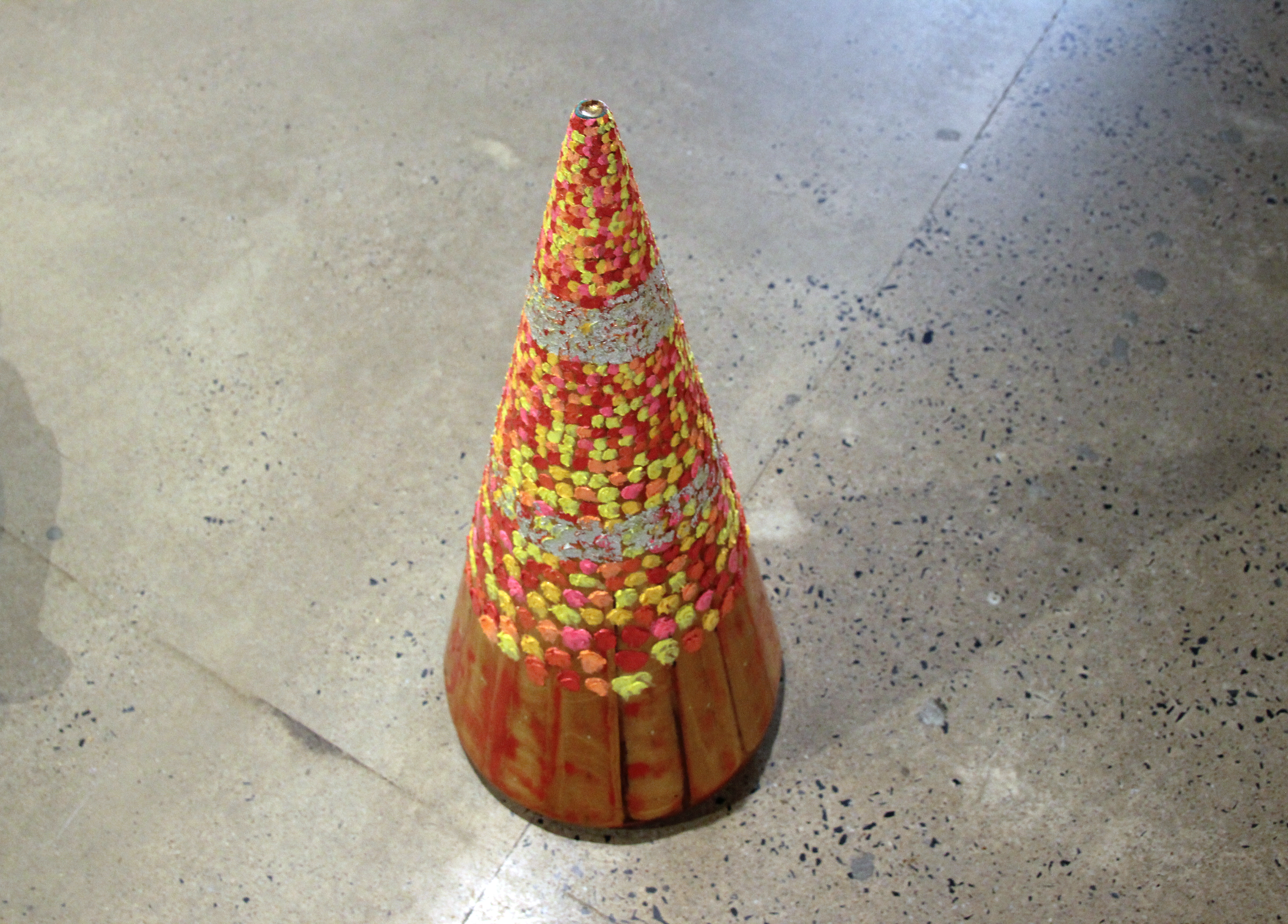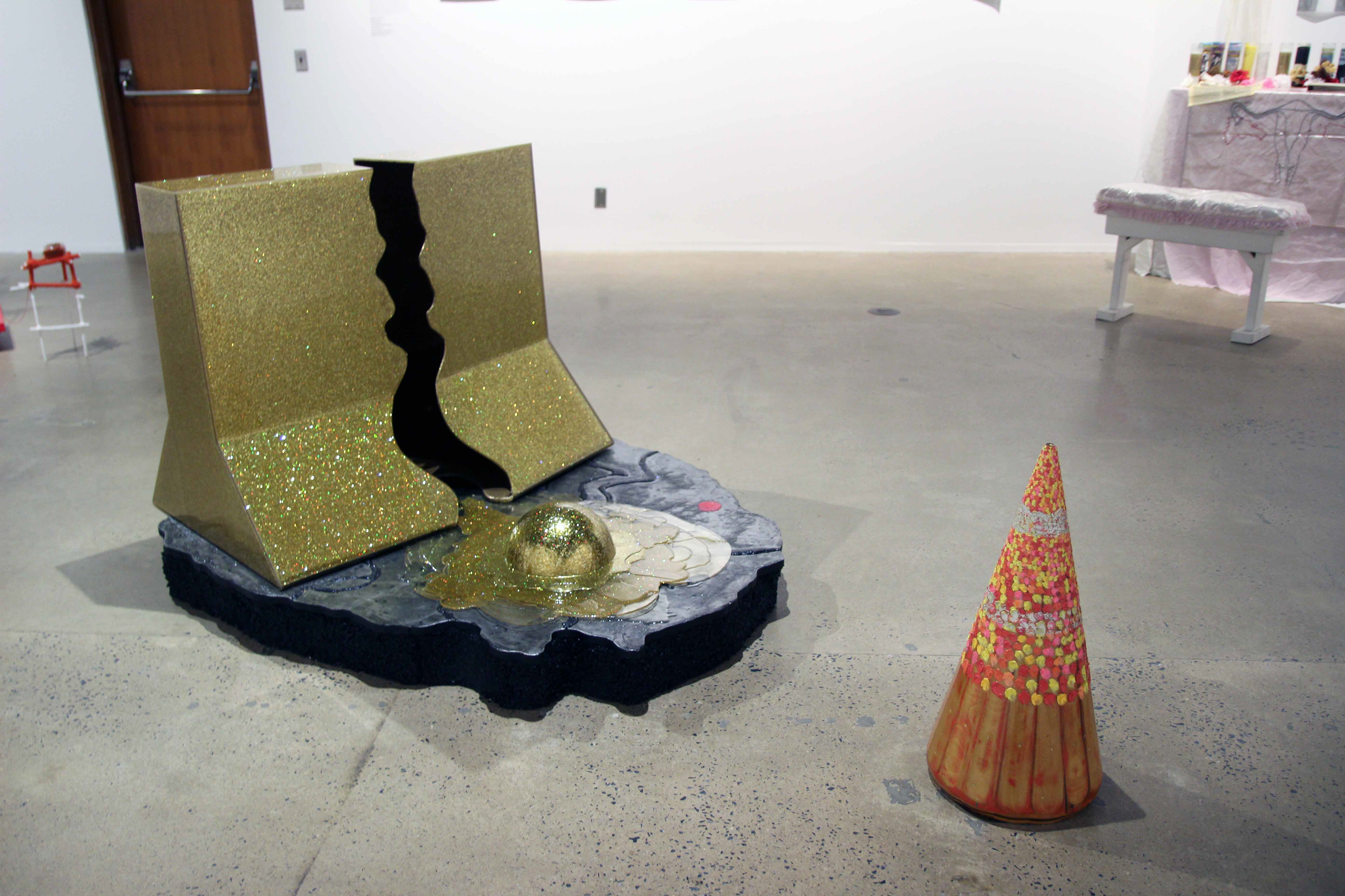 Objects of warning, such as barrier rails and a traffic cone, are dressed seductively, with surfaces intended to attract the viewer close. The resulting dissonance hints at the depiction of an anthropomorphic horror show.