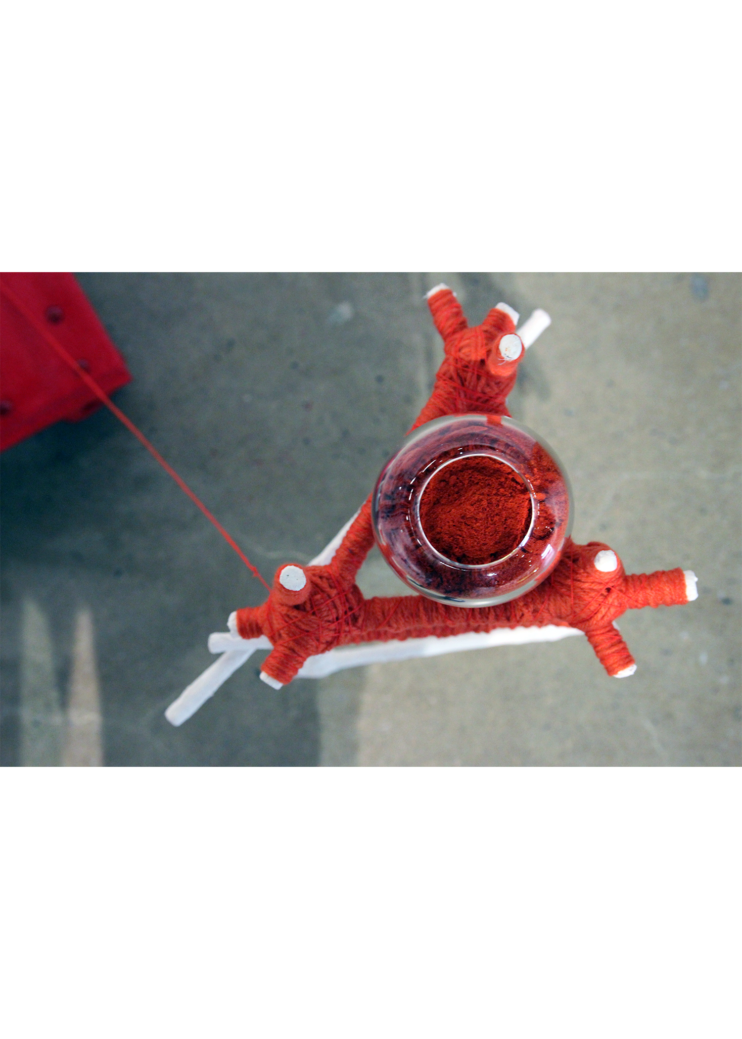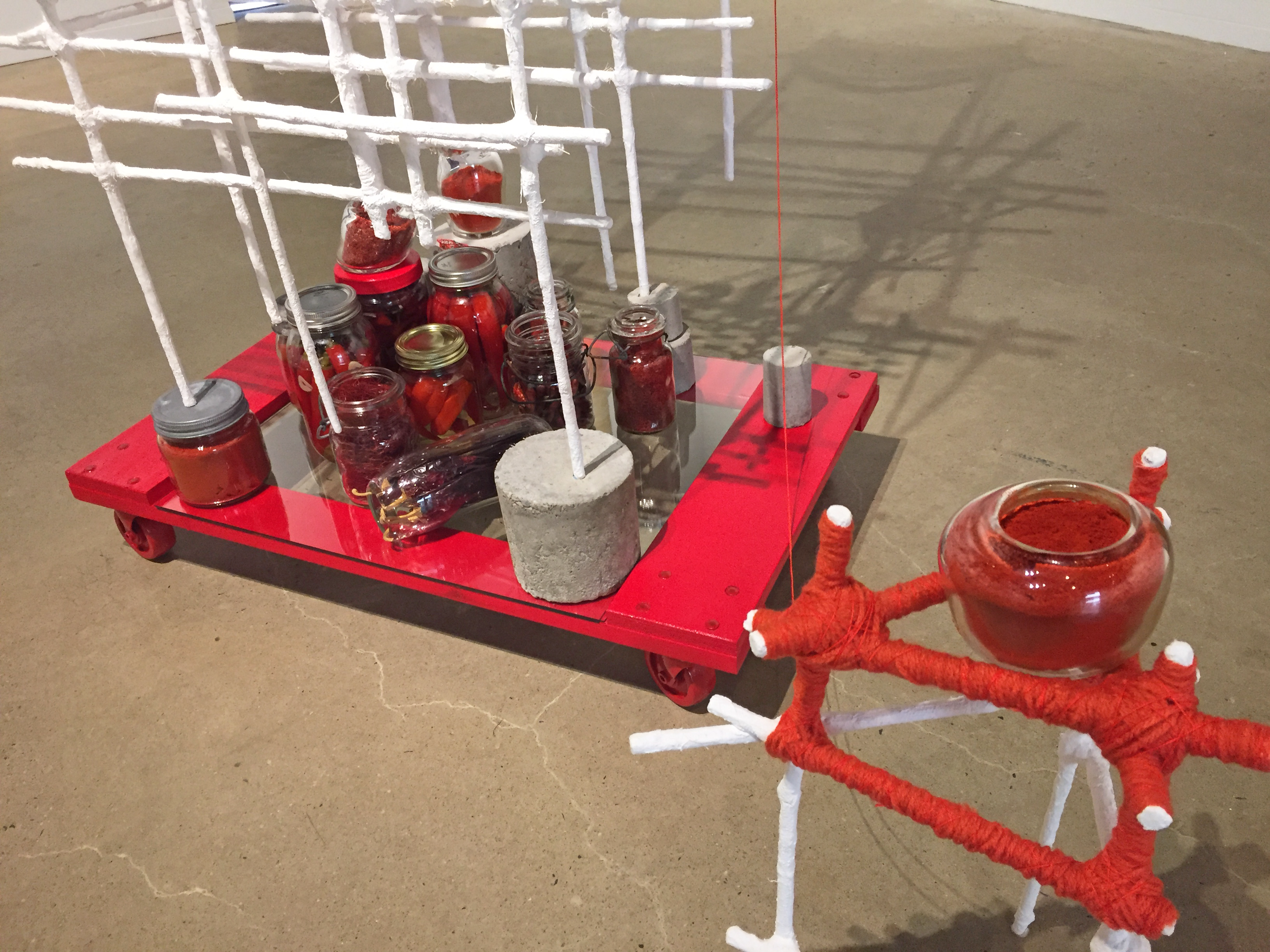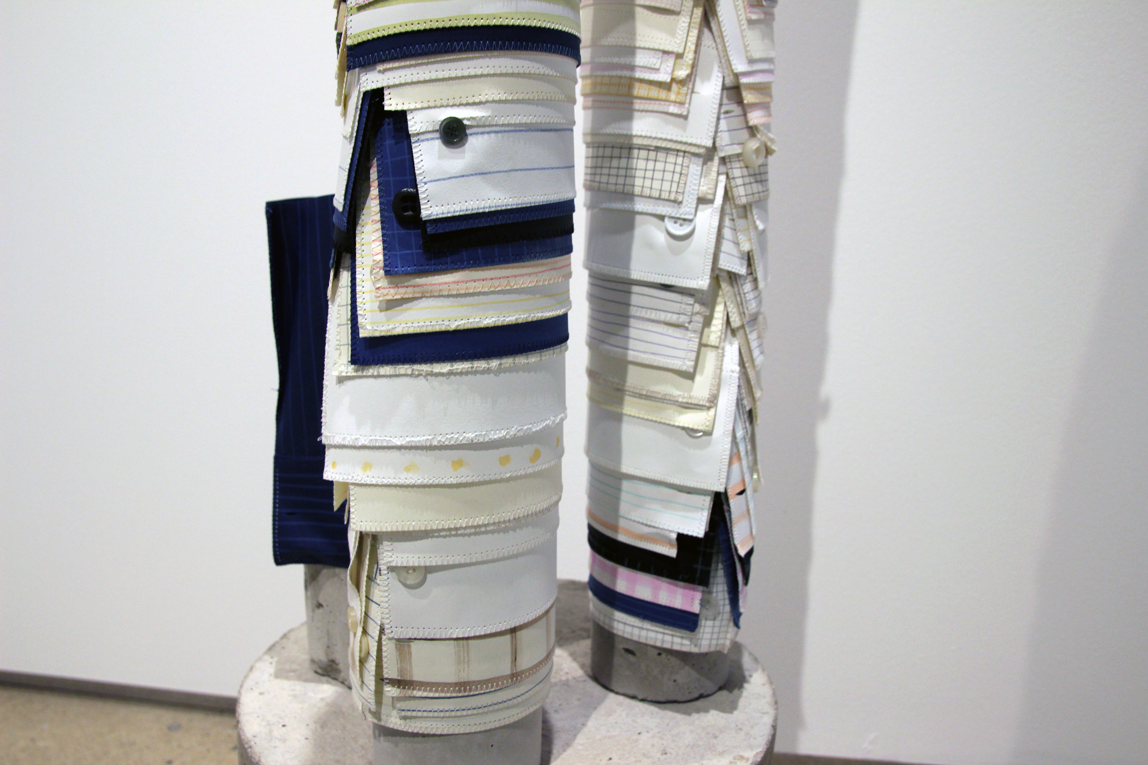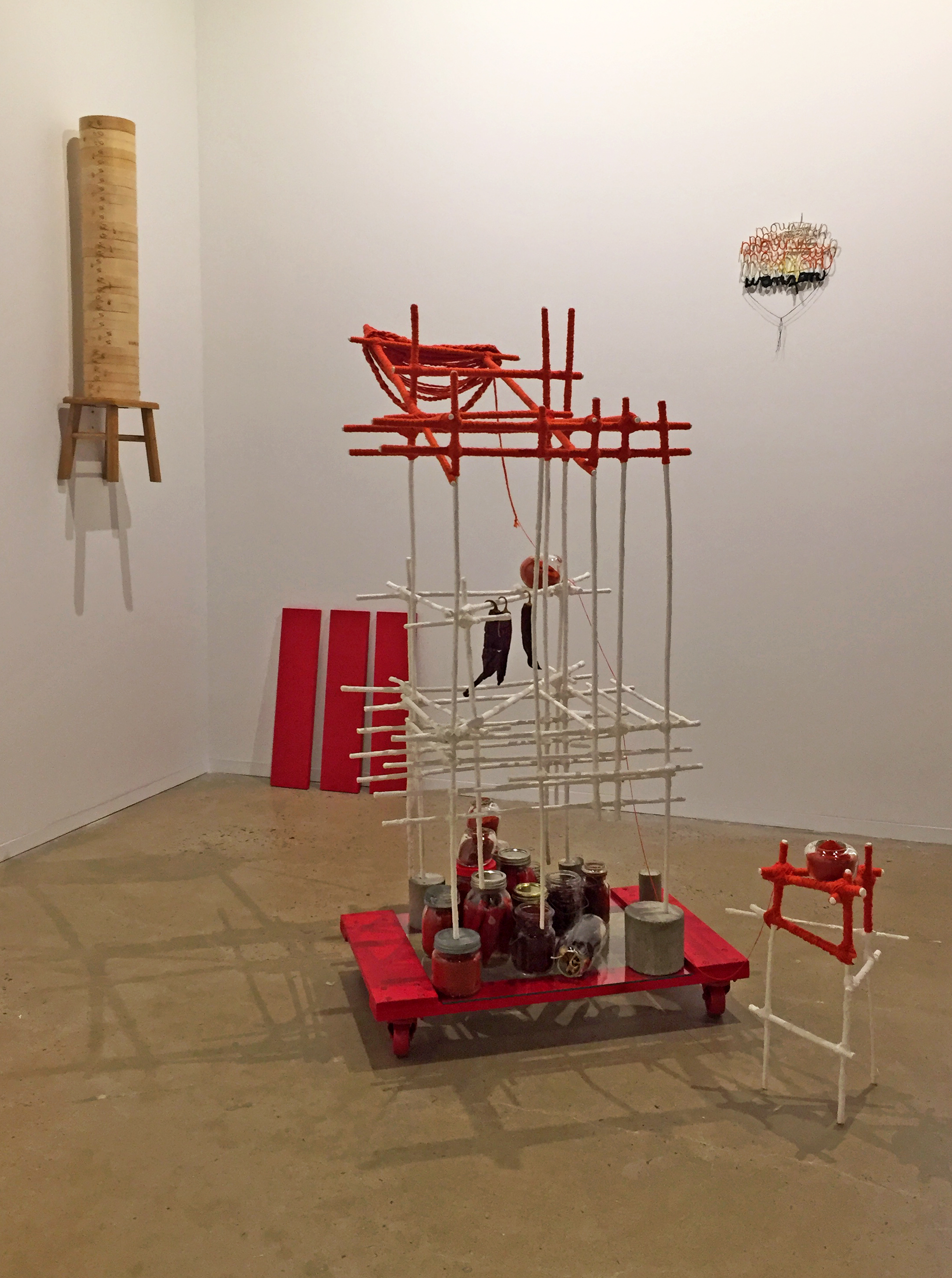 What process and materials did you use? I often combine industrial/construction materials together with hand-made traditions to explore the dissonance I experience between temporary urban structures and everyday creative acts in daily life. Materials include plaster, bamboo stakes, concrete, steel, electrical wire, spray paint with bamboo steamers, containers of fermented vegetables, and yarn. Processes include casting, wrapping, joining, stacking, machine and hand-stitching, folding, braiding, and fermenting.