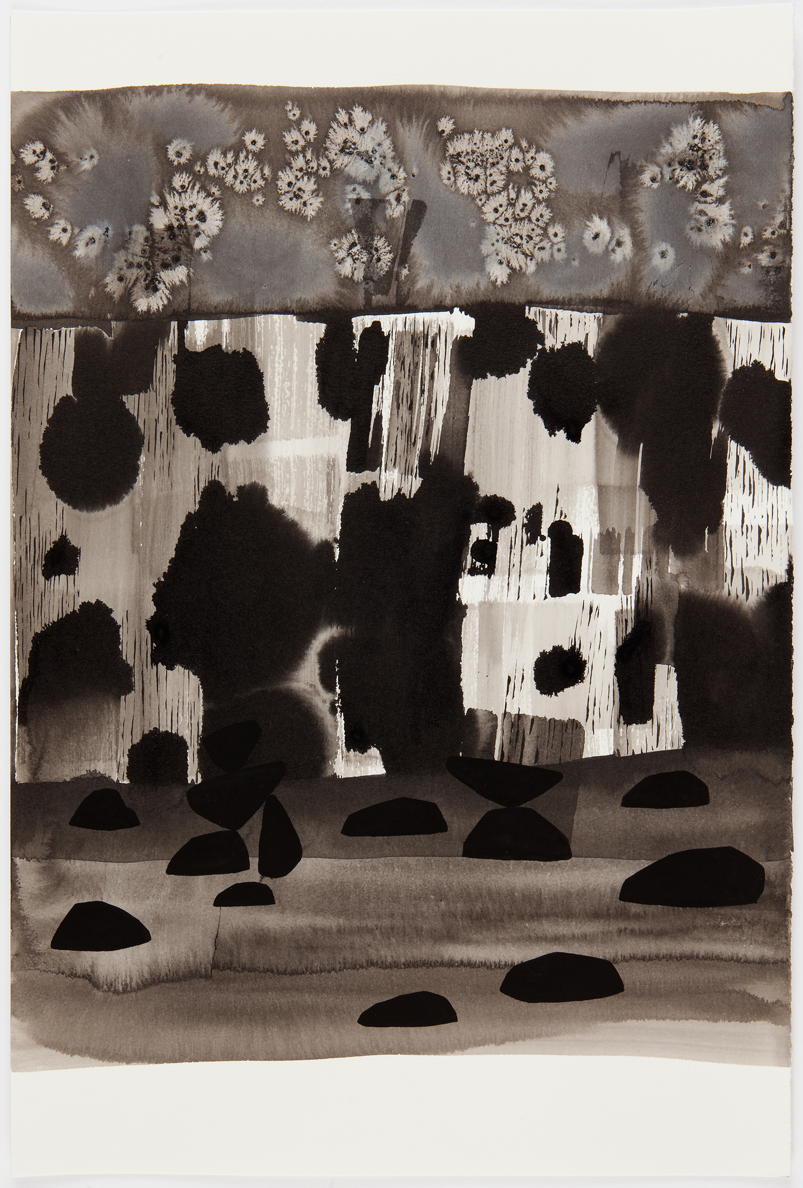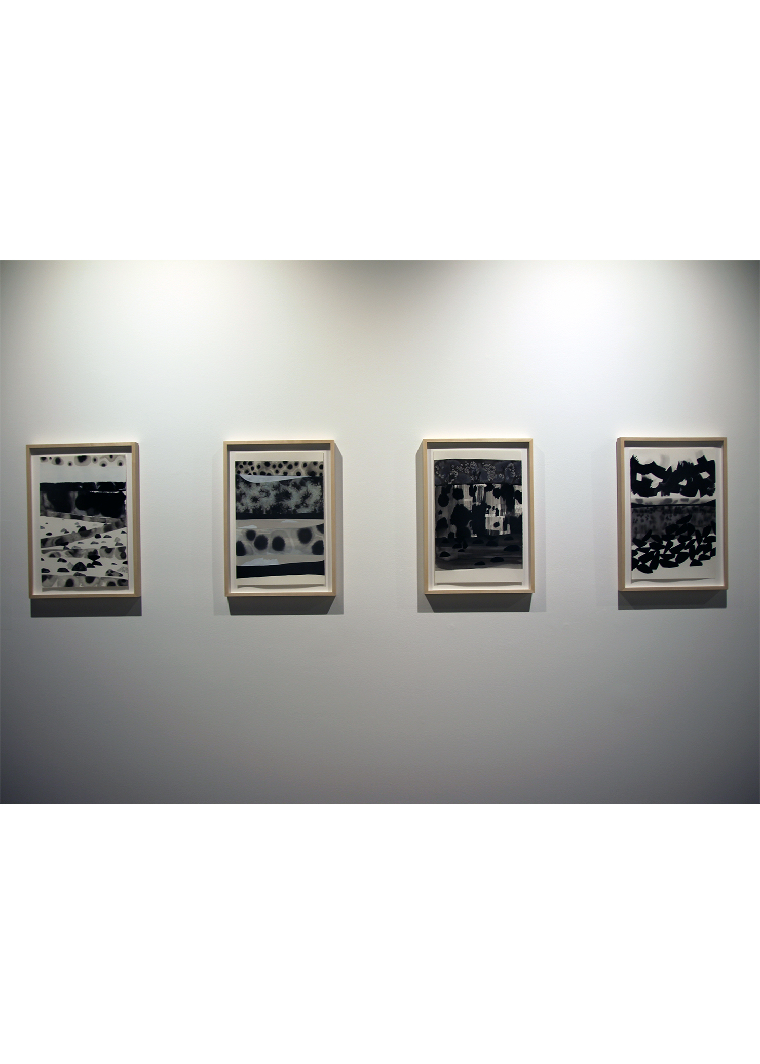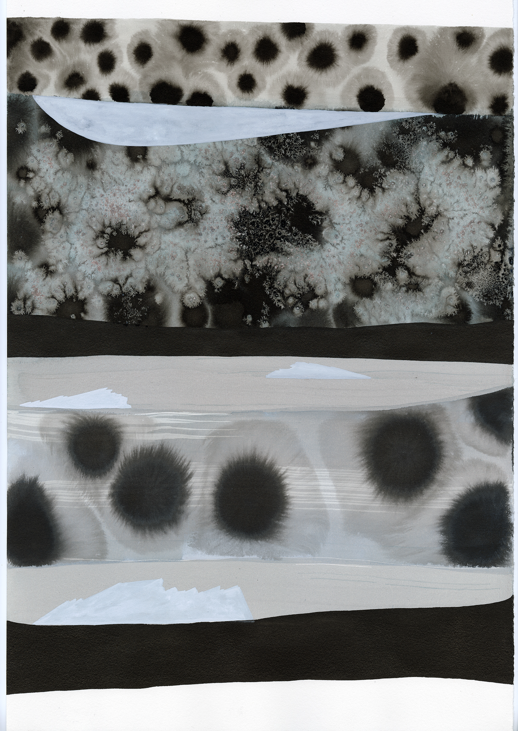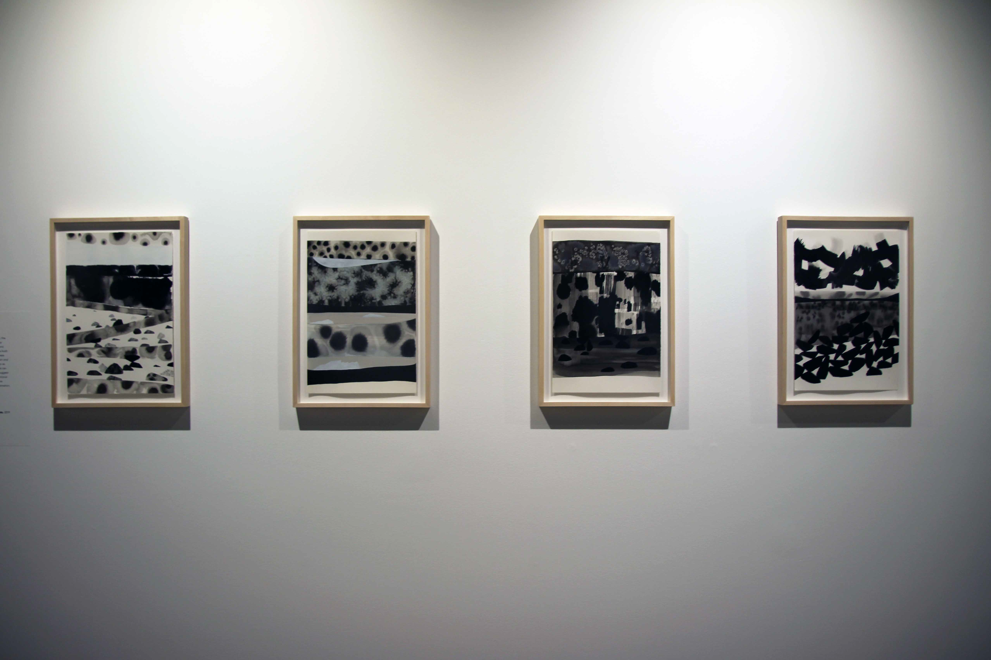 What process and materials did you use? I am working in a layering process that incorporates ink, water, and salt on paper. There is no erasing; each mark builds upon the last, adapting and changing until I feel I have reached a point of tension and/or resolve. The materials have a physical impact on each other, which makes the drawings feel very tactile. This is a new process for me, so this project has been full of exploration and discovery.
