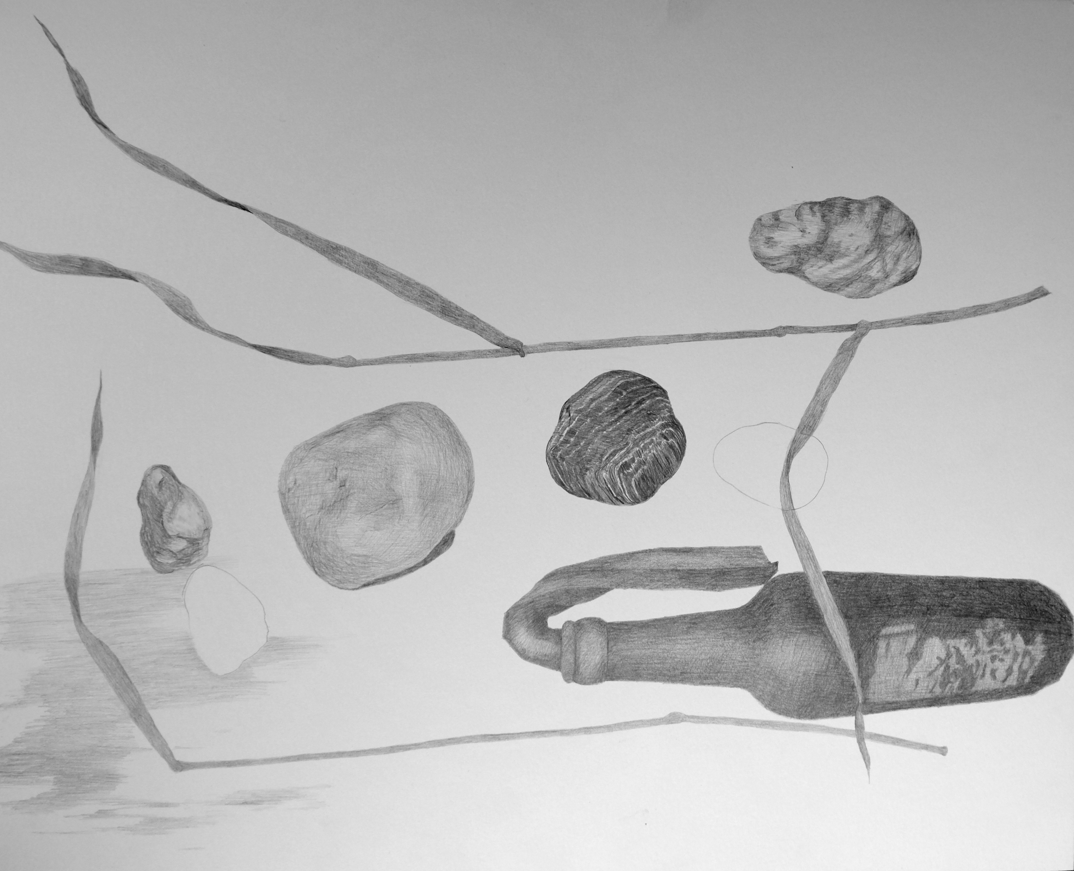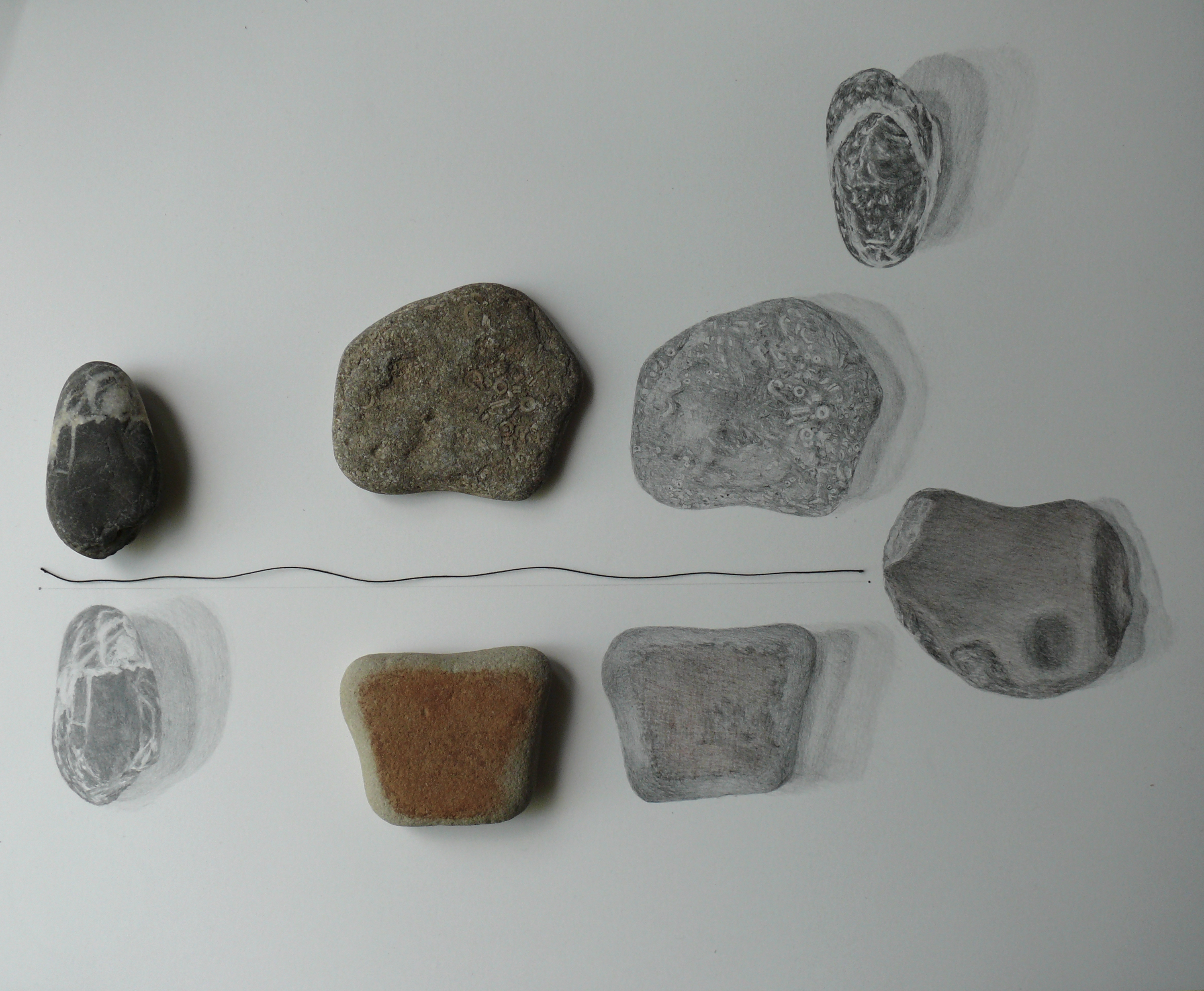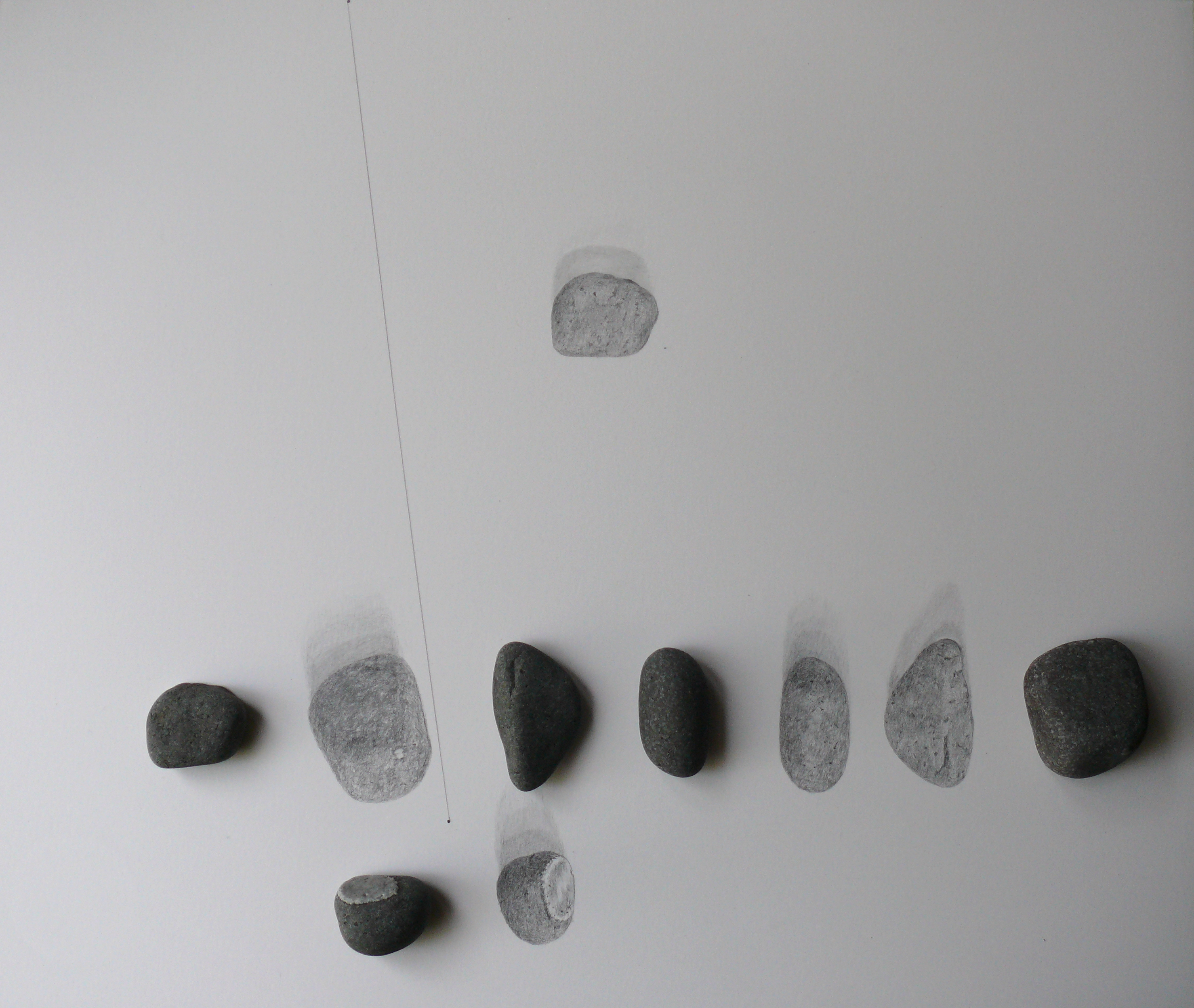 What process and materials did you use? The process of making is slow and ongoing, often taking more than a year. I generally work around a theme that arises slowly, as I notice what has been bothering me, or interesting me—usually it is something from the news. As the drawings develop, they change, and often circle back to the older drawings. For this project, I gathered stones with my daughter because we both found them to be so silently beautiful and varied (daughter stones). This is about a relationship of a human with a naturally found object. I have used graphite on a smooth Bristol paper for the drawings, but I also included a small bit of pencil color, for hints of color.