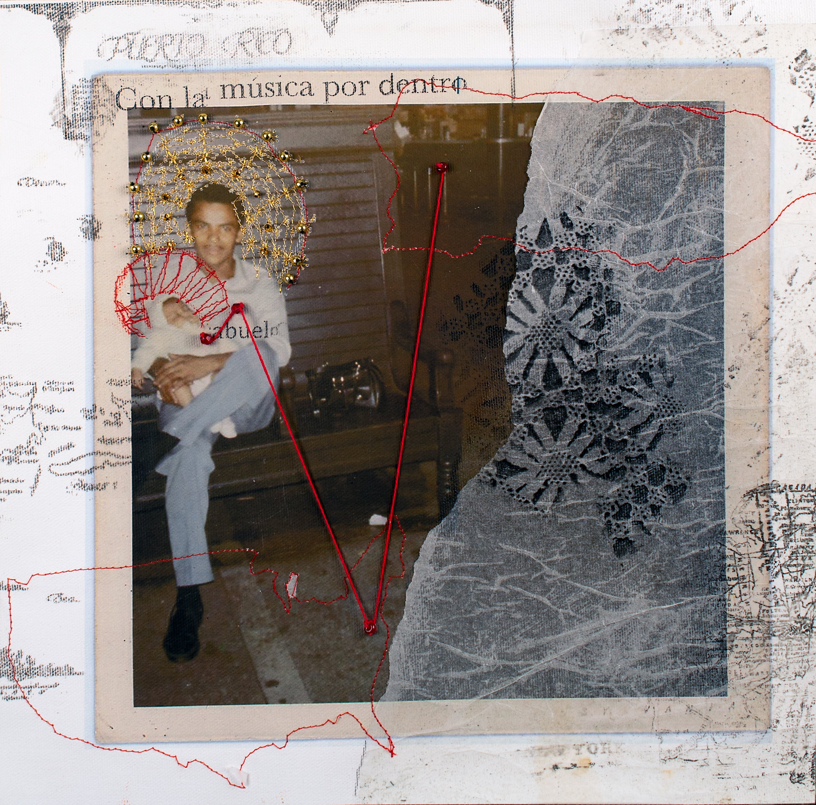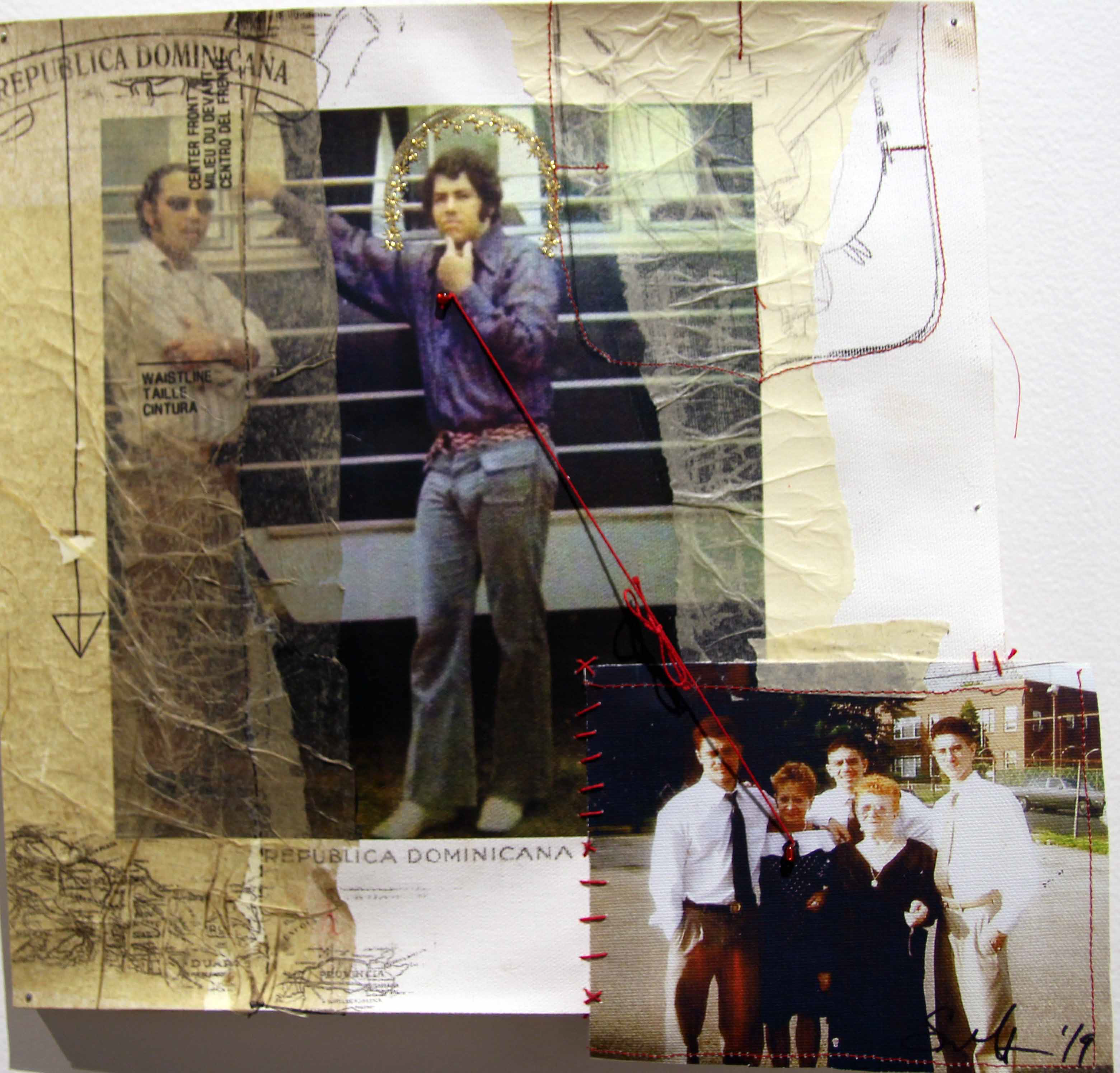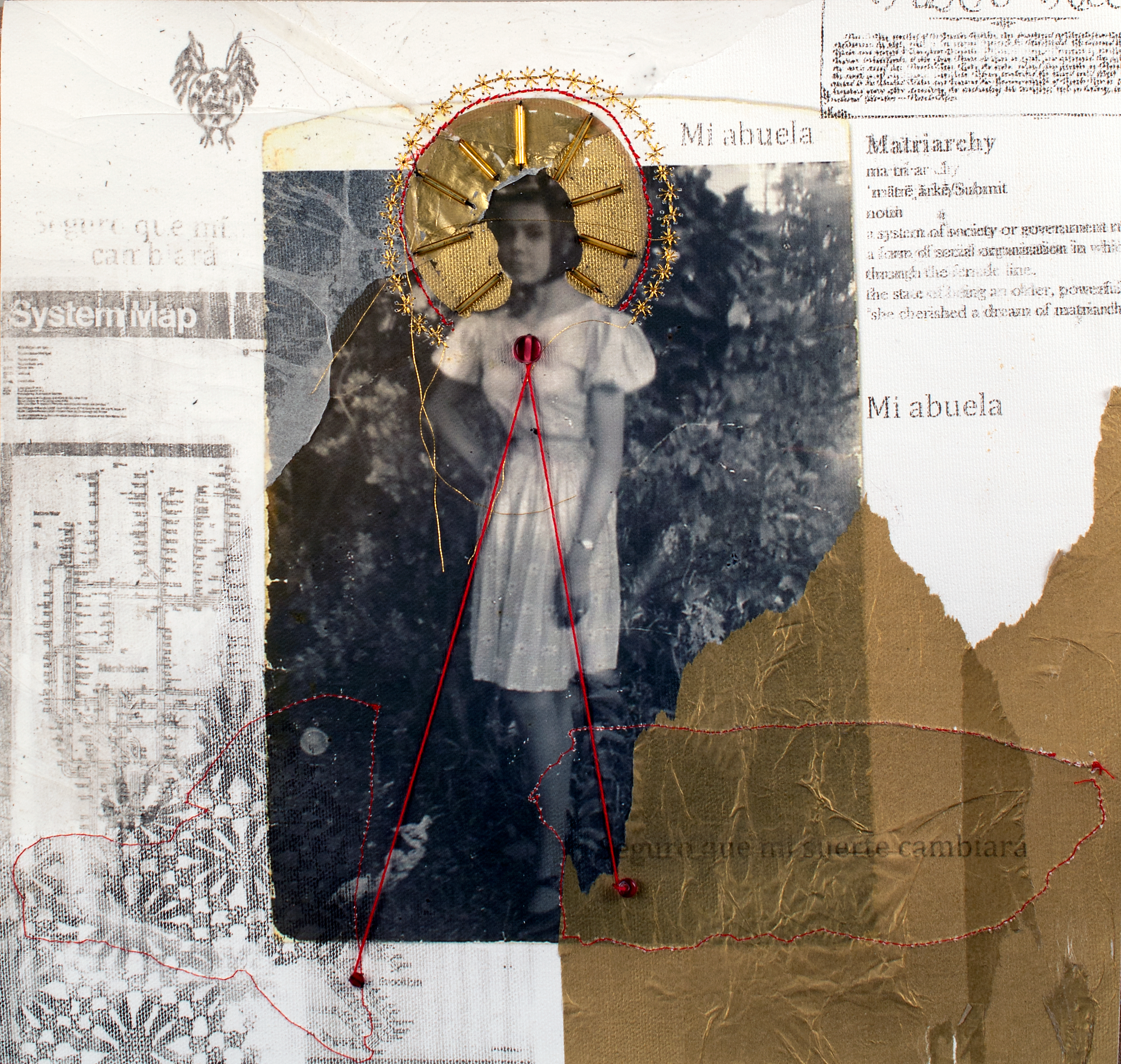 This series, Lazos de Sangre, reflects aspects of my Latinx identity, the generational impact of colonialism, and re-appropriation of the means my ancestors adapted to survive. I use embroidery, machine sewing, screen printing, original photography, painting, transfers, and many other media to create layers on each piece. The lace patterns, maps, and other recurring symbols are borrowed from both Puerto Rico and the Dominican Republic. I am specifically interested in adopting indigenous Taino patterns and artifacts as well as Yoruba and Catholic symbols in addition to the ways they share similar aesthetic for different purposes (i.e. halos, concentric circles, the heart etc.).