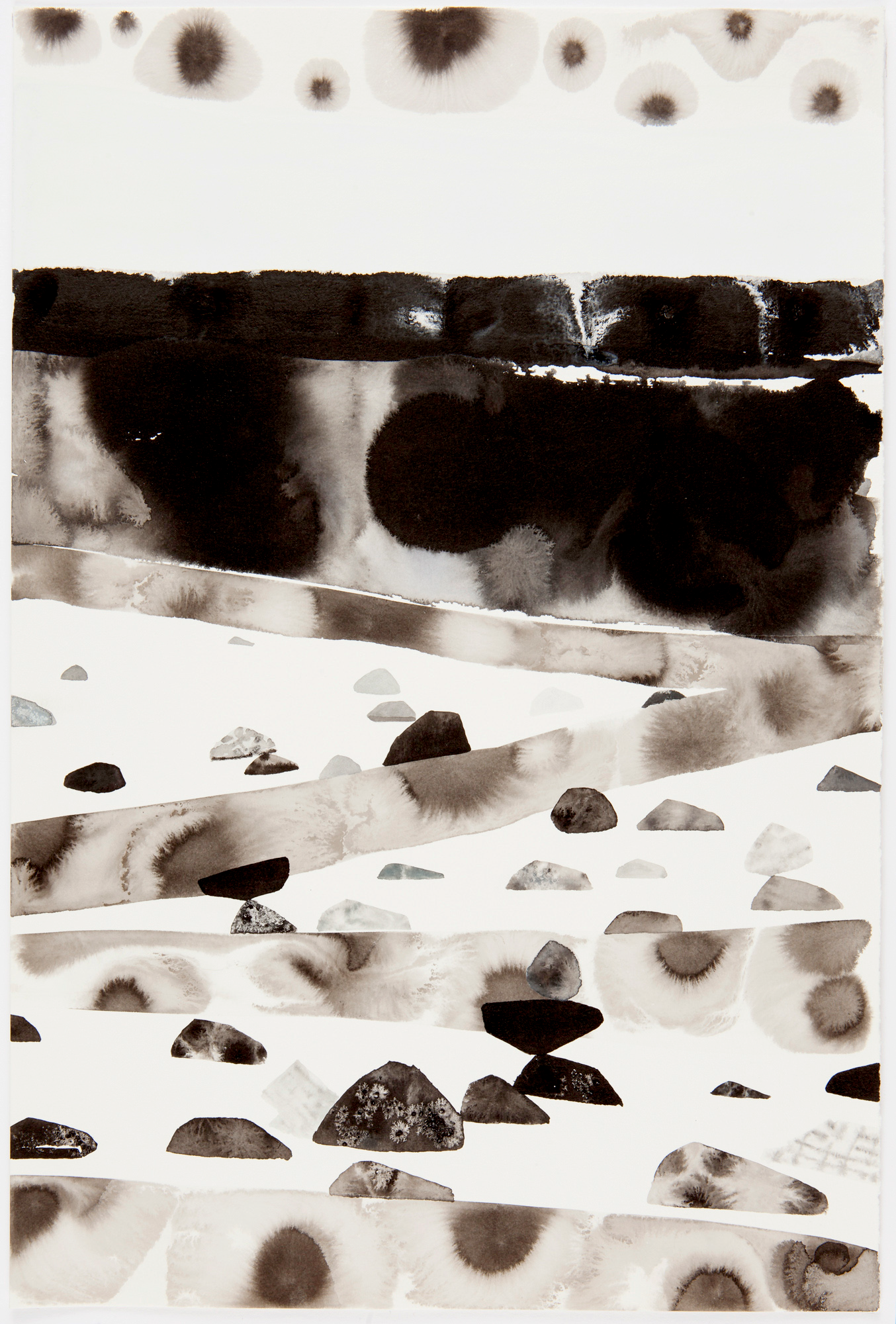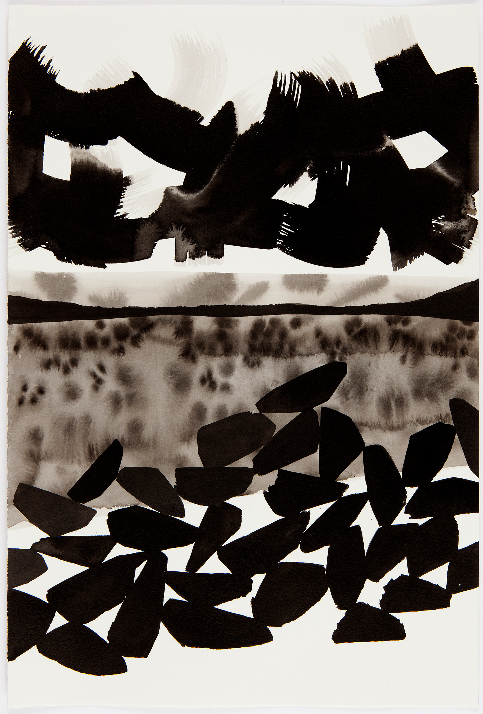 These drawings are from a current series of work titled Again and Again. In one sense the phrase can refer to repetition as a form of persistence. In another, the repeated words can articulate a failure to change course. The drawings suggest a geologic sense of time and offer a nearly cross-sectional view of landscape. Within them, rocks stack and fall as cairns, totems and walls, becoming markers of a destination, human activity, or a point in time.