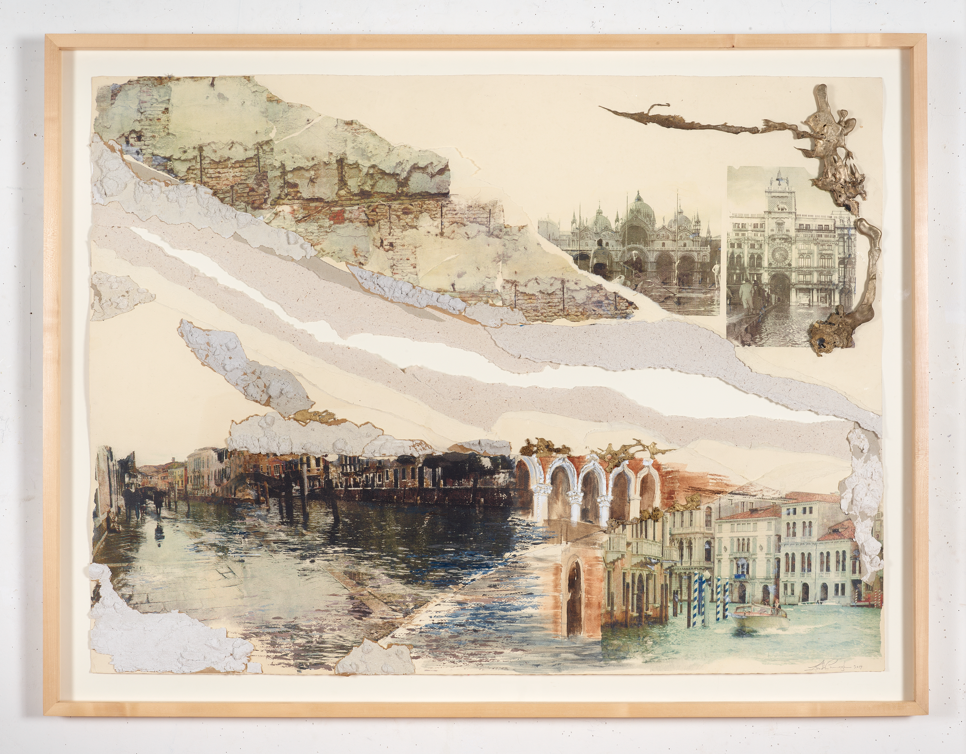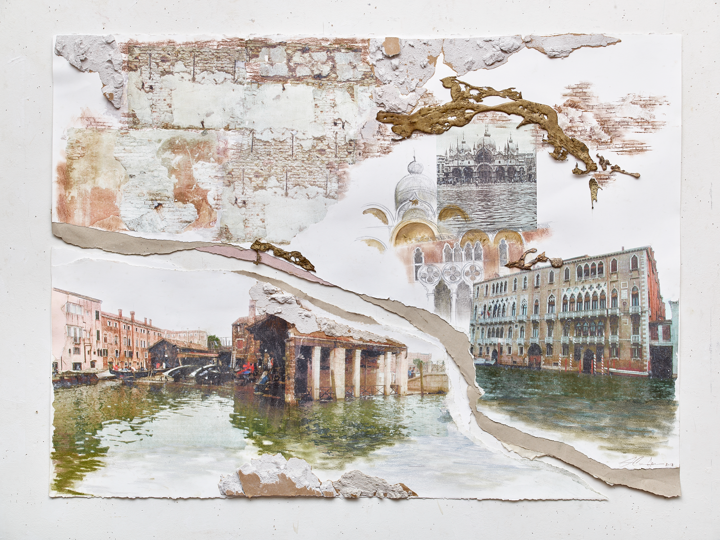 I often transform found structural remnants and materials as aesthetic and metaphoric elements: a kind of Urban Mining. In this Venice series the fragments of the fragile, golden, sand-cast bronze refer to the golden mosaics and fragile treasure that is Venice. The bronze fragments are remnants of the distinctive technique I developed to create bronze shaped by the process of the pour that results in highly-textured, beautiful relief and three-dimensional forms.