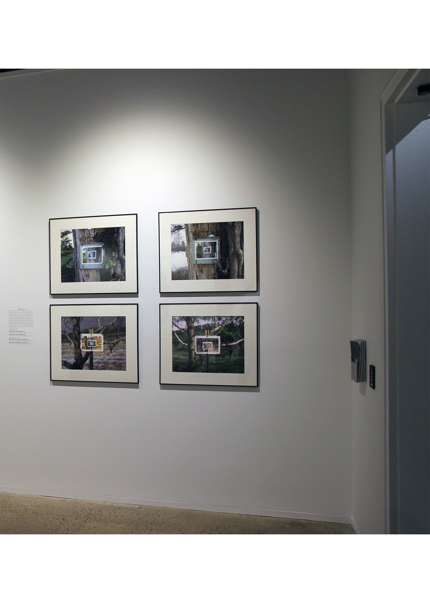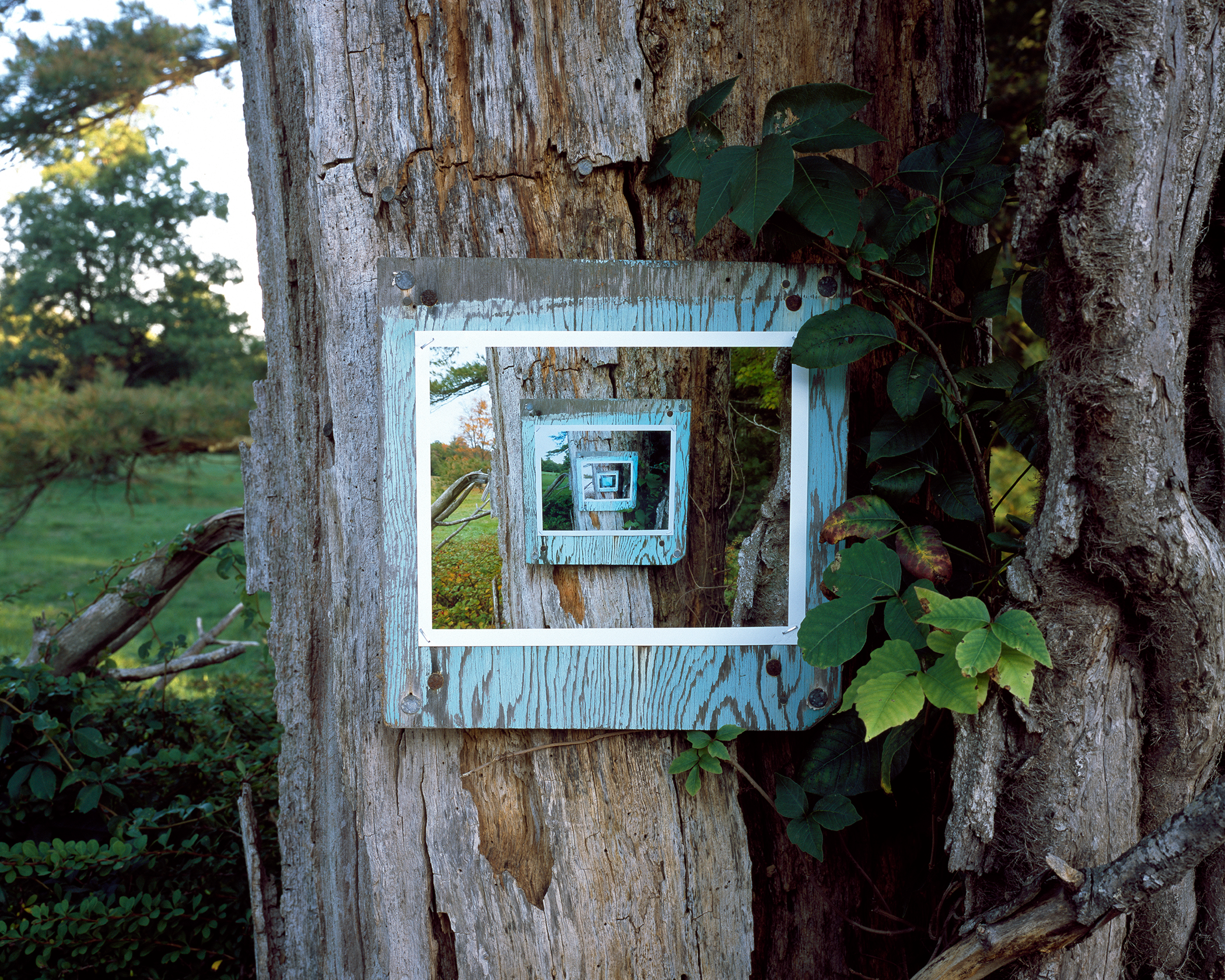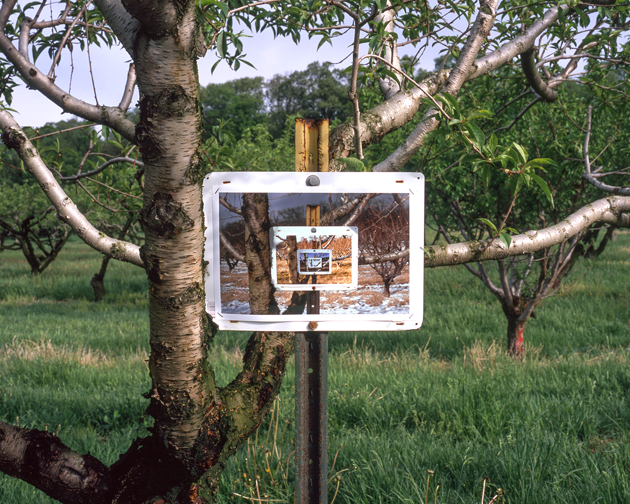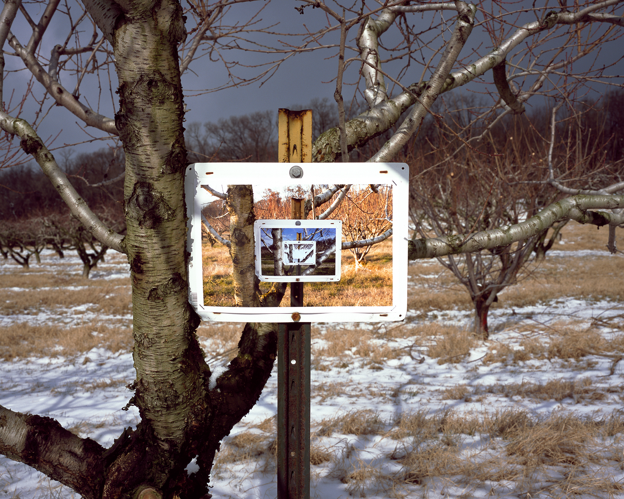 The series involves, though not in all instances, photographing blank wooden signs discovered by chance along roadsides and then methodically re-photographing their images to create recursive progressions. The interior images of the repeated sign offer the viewer glimpses of past time and the transformation of place.