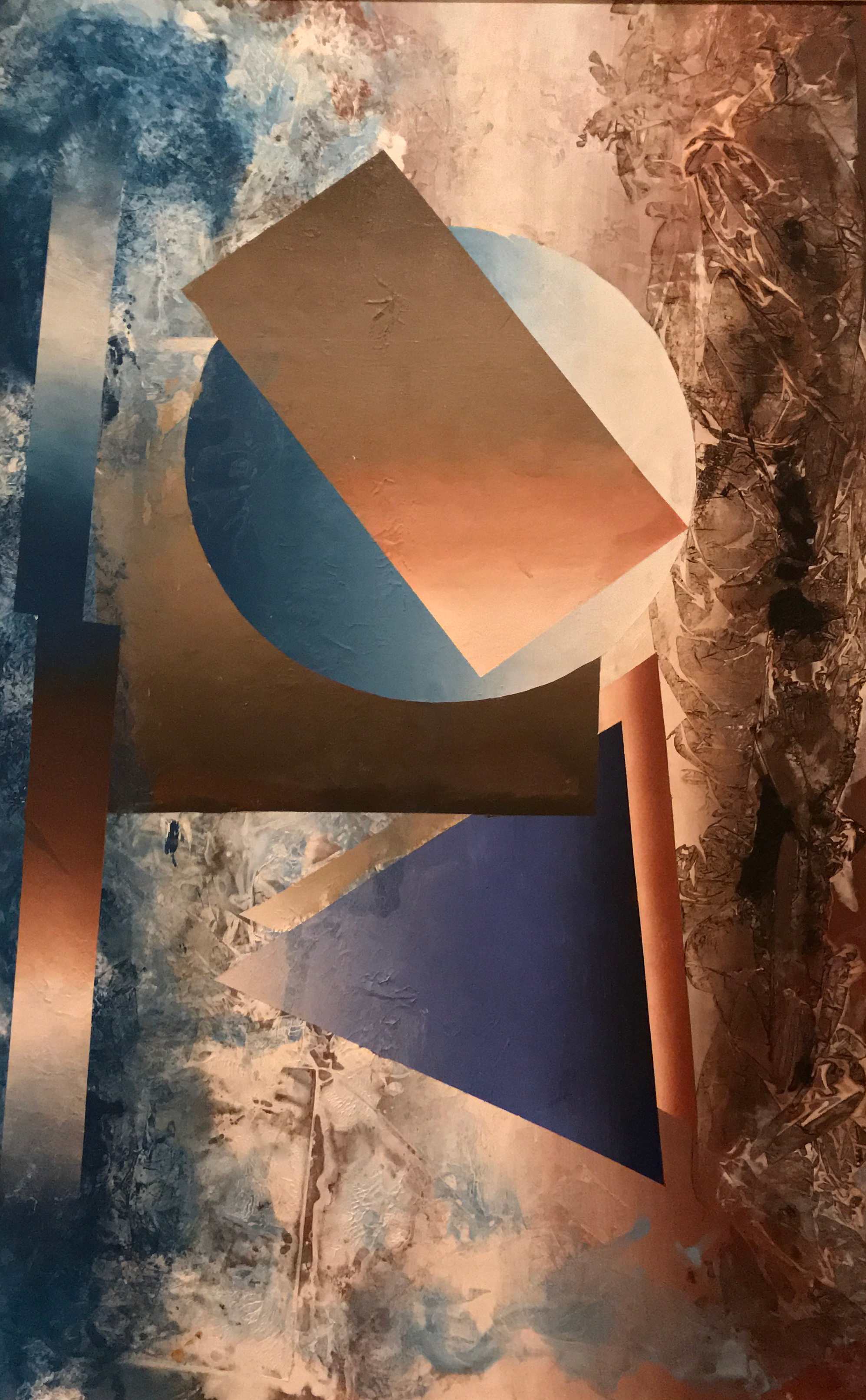 When and why did you start creating this work? I started these works in 2014 and continued to work on them until 2019. These paintings manifested partially as an adaptation due to my failing eyesight, but also reflect a recurring theme in my most recent artworks. I decided that my paintings will all contain a circle, rectangle, square, and triangle. These finished pieces represent more of a planned format than my previous art.