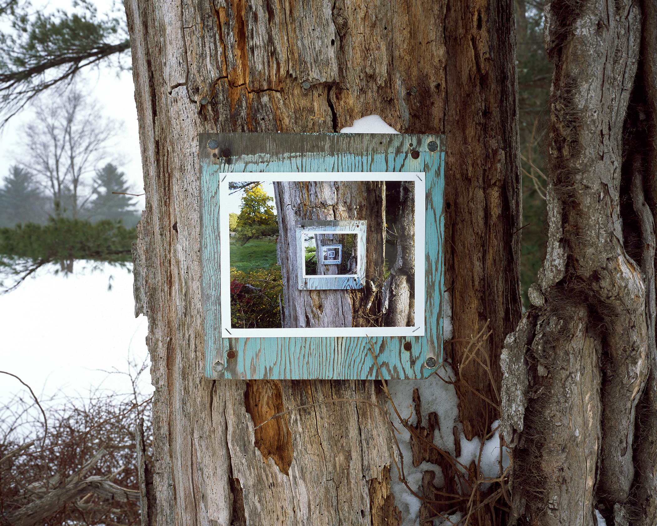 What process and materials did you use? I first used inexpensive, commercially produced prints to staple onto the blank wooden signs, which had prompted my beginning this series. Now, even though I myself make the glossy prints for the on-site, new iterations and use much higher quality paper, I still allow them to weather (often I document the disintegrating images) until I can return to continue the recursive process. In contrast, the large, exhibition prints are produced on special archival matte paper. Because this project has gone on for over a decade, continuing the recursive iterations at various, sometimes distant sites requires methodical note-keeping and sheer persistence.