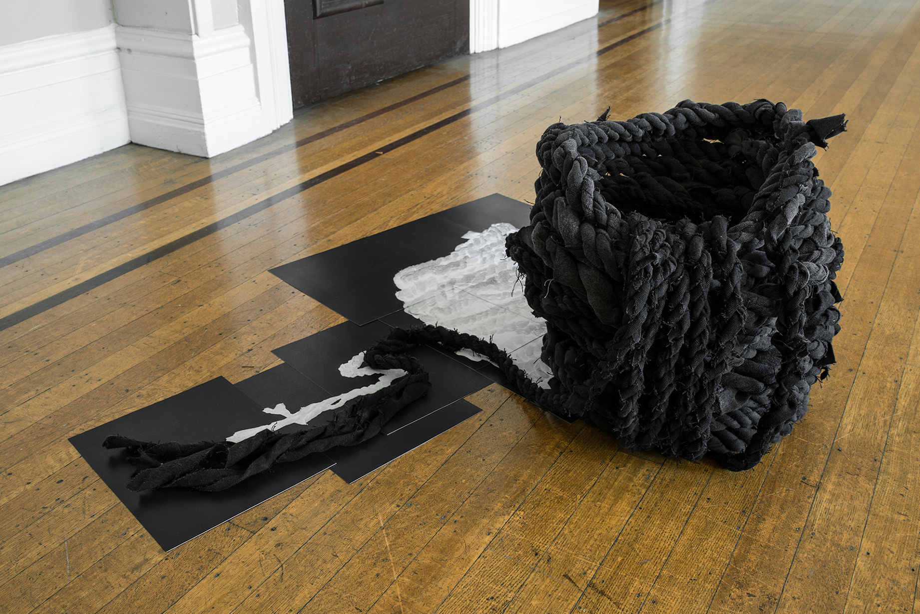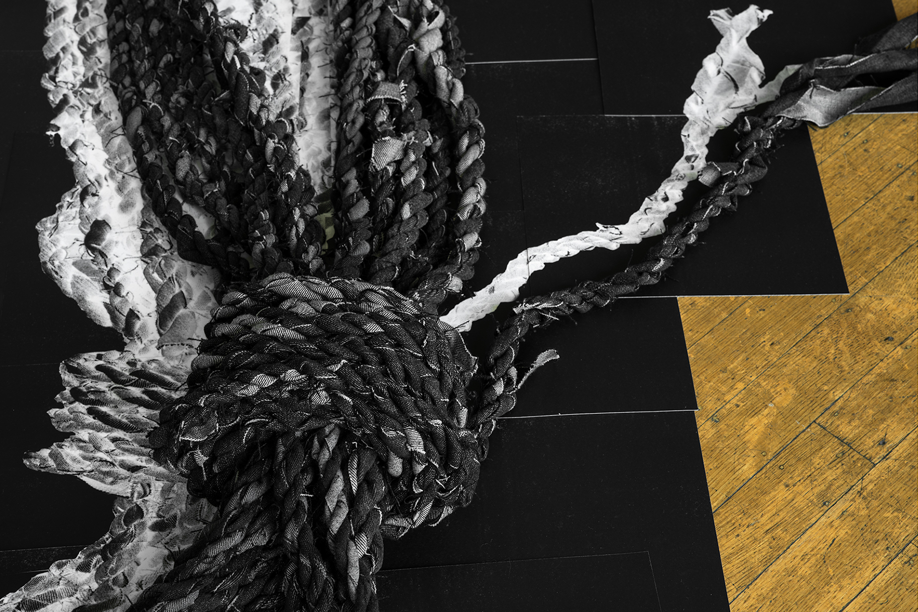 In Drop Shadows, hand-braided fabric strips were cut from 60 pairs of black denim jeans that were sourced from thrift stores. Through repetitious braiding, the repurposed denim was transformed into rope thereby referring to labor both in process and in its physical resemblance to a utilitarian tool. Through collaging multiple garments together, the inherent histories of the clothing’s original owners are brought together into a single art object. The photographic shadows at times align and sometimes misalign with the rope, underscoring the disconnection between representation and illusion in an image.