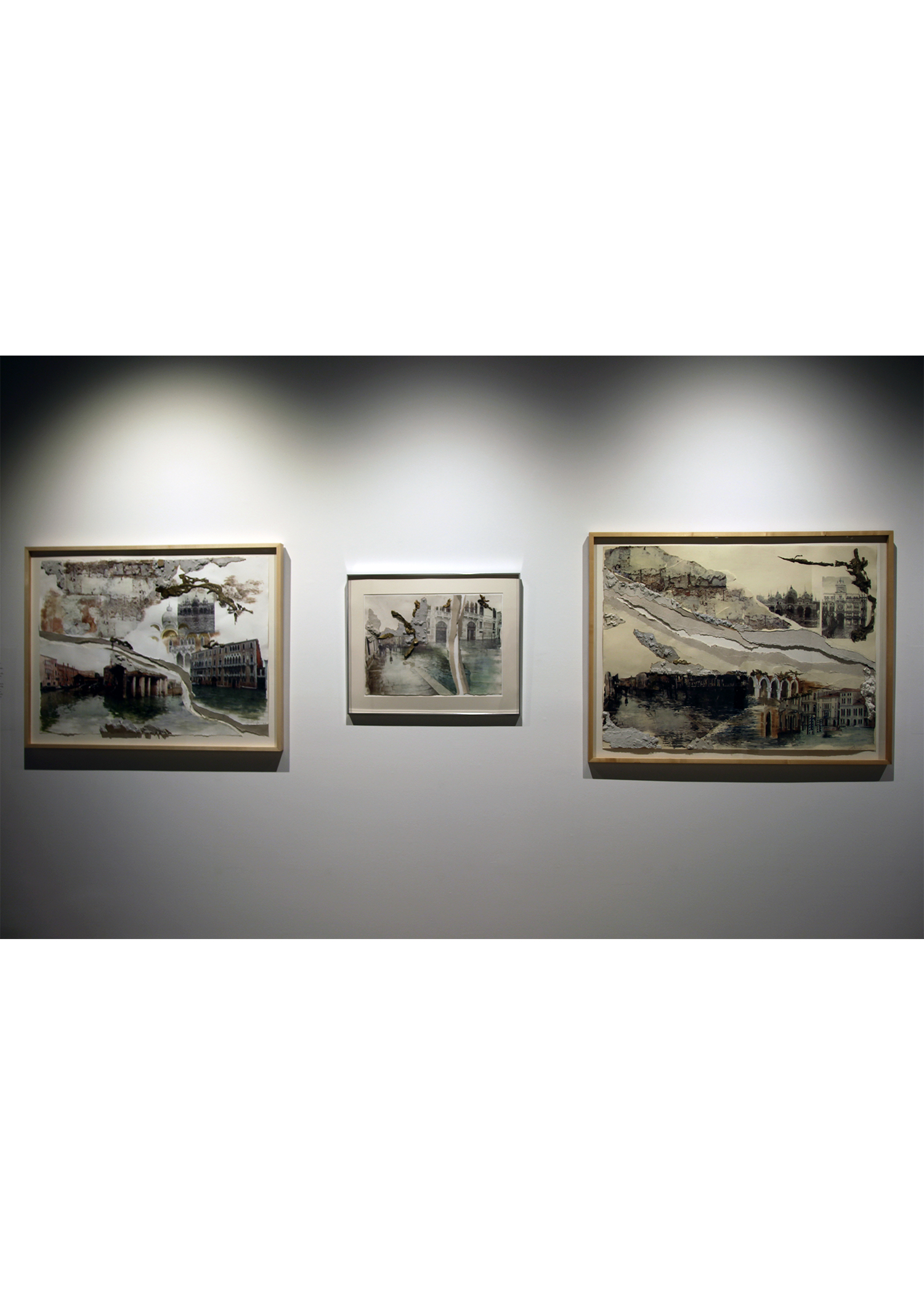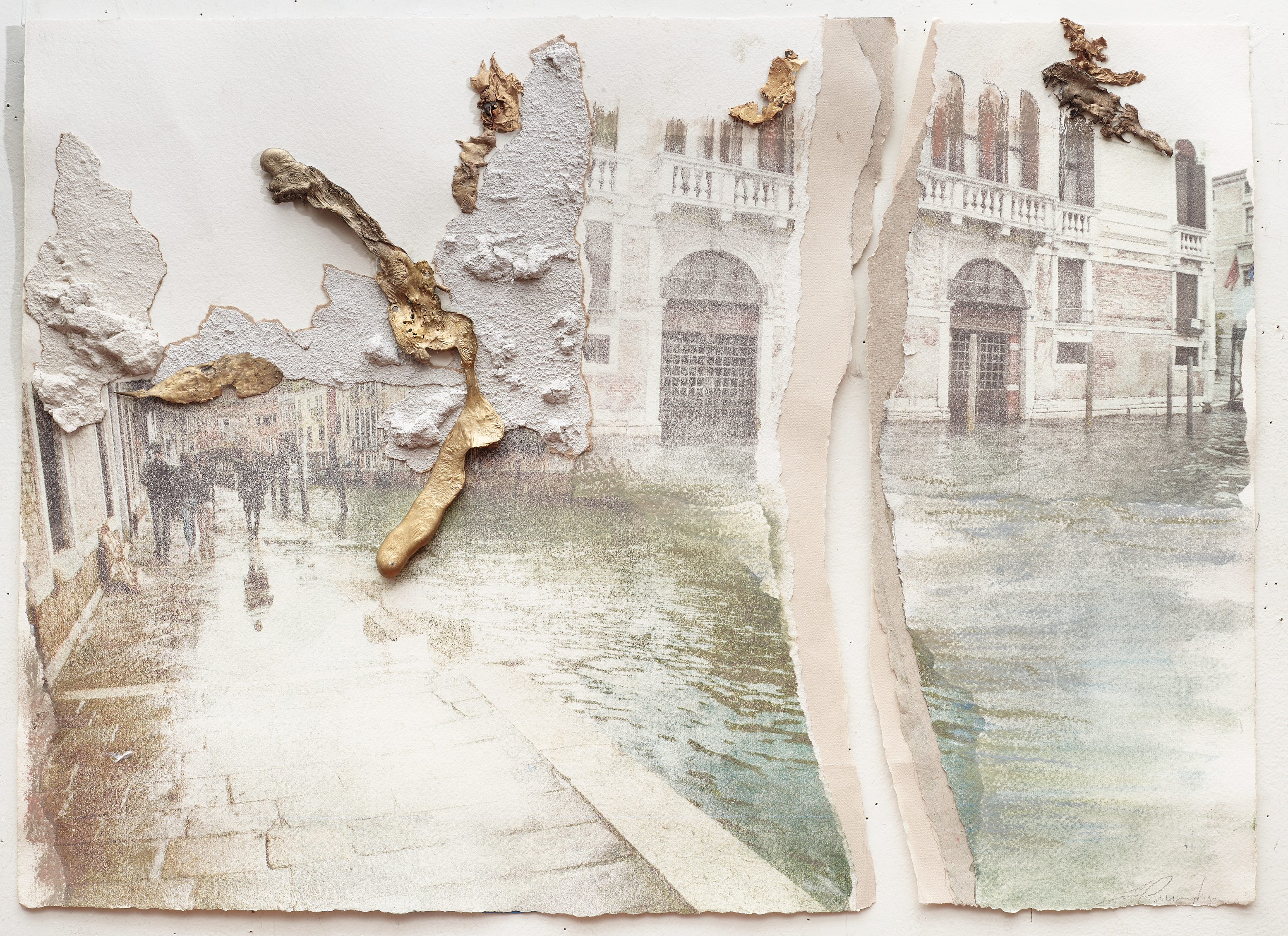 What process and materials did you use? The photos that I took documenting the effects of the rising seas on this architectural treasure became the basis of this work. I employed photo-transfers that are done with a solvent and an etching press. Then I have collaged elements that echo aspects of Venitian architecture, crumbling walls, and golden mosaic.