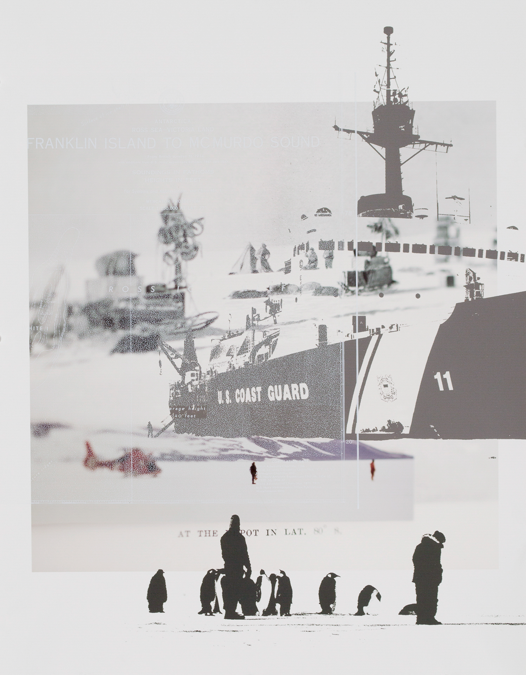 District of the Penguins. This body of work uses the archived publications from James Cook, Ronald Amundsen, Charles Wilkes, William Reynolds, Robert Scott, Ernest Shackleton, and Richard Byrd. I combine journals, texts, maps, drawings, and photographs from their expeditions with my own documentation of personal experiences in Antarctica.