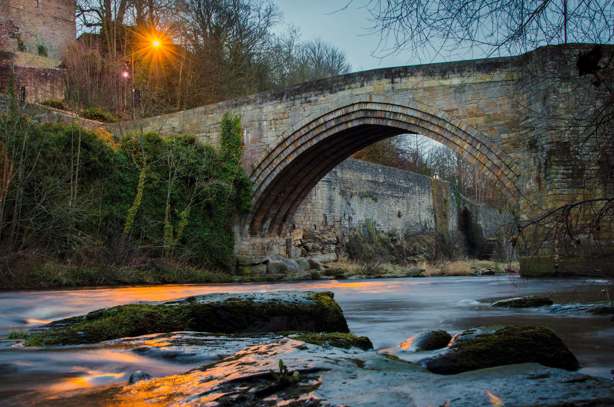 This arched bridge was probably late medieval originally, dating from the 14th Century. It was rebuilt after the siege of Barnard Castle. It bears a date stone of 1596, which replaced an earlier stone - a mistake by the stonemason, that stated 1569 (the year of the siege of the castle).