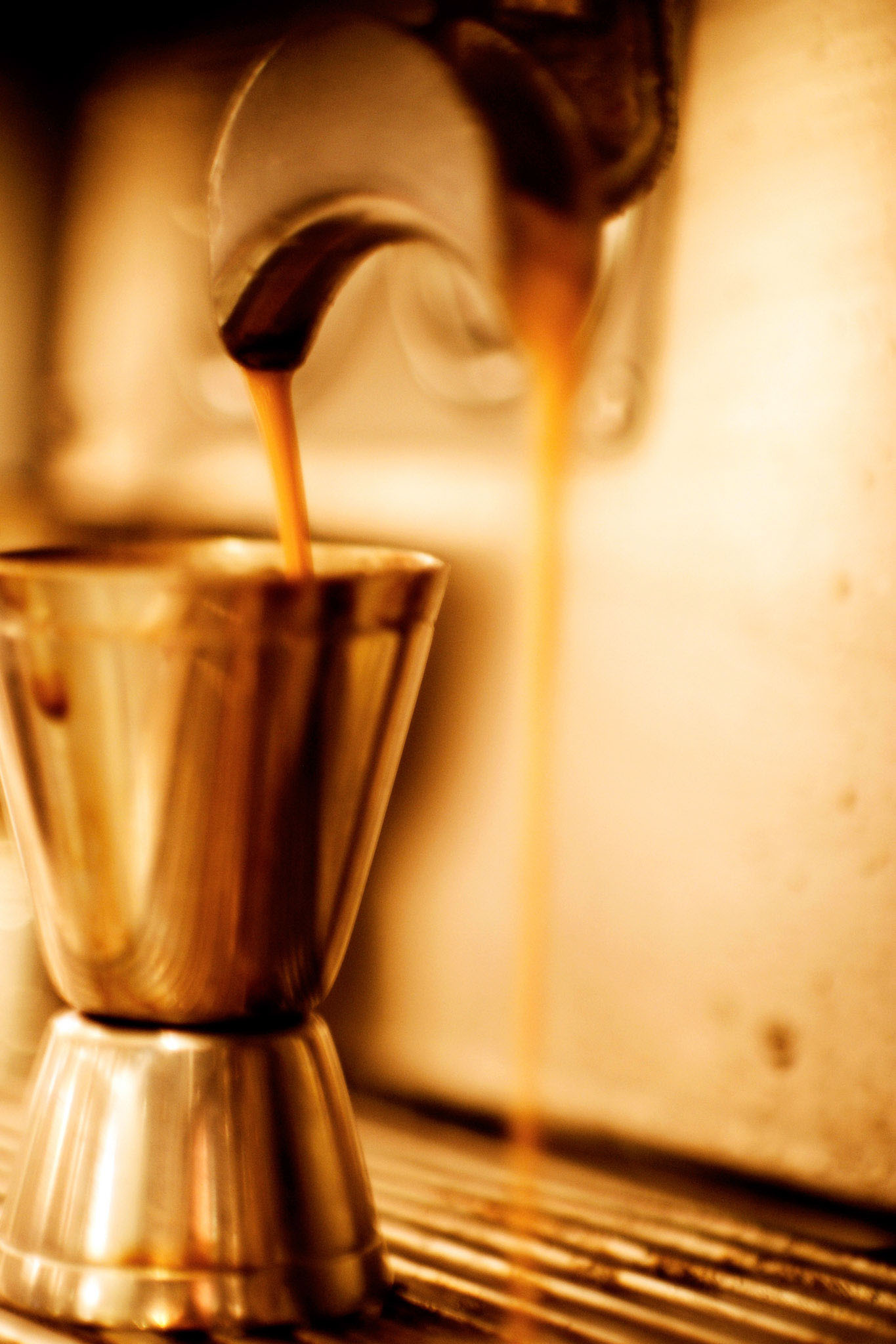 Sie zeigt eine Extraktion eines doppelten Espresso, wobei die zweite Tasse beabsichtigt ins Leere läuft. Entstanden ist die Aufnahme bei einer fotografischen Dokumentation in einem Baristakurs am Irschenberg.